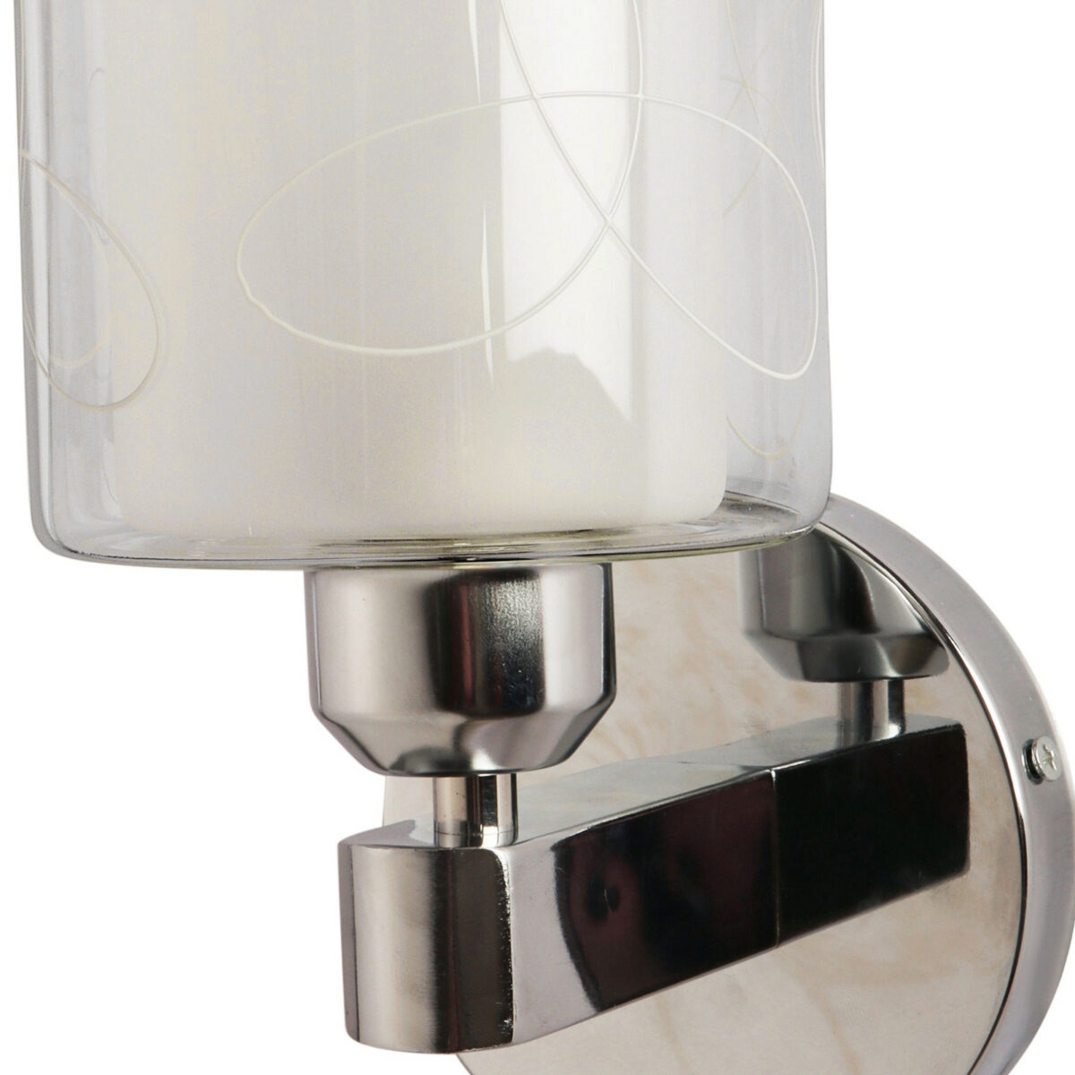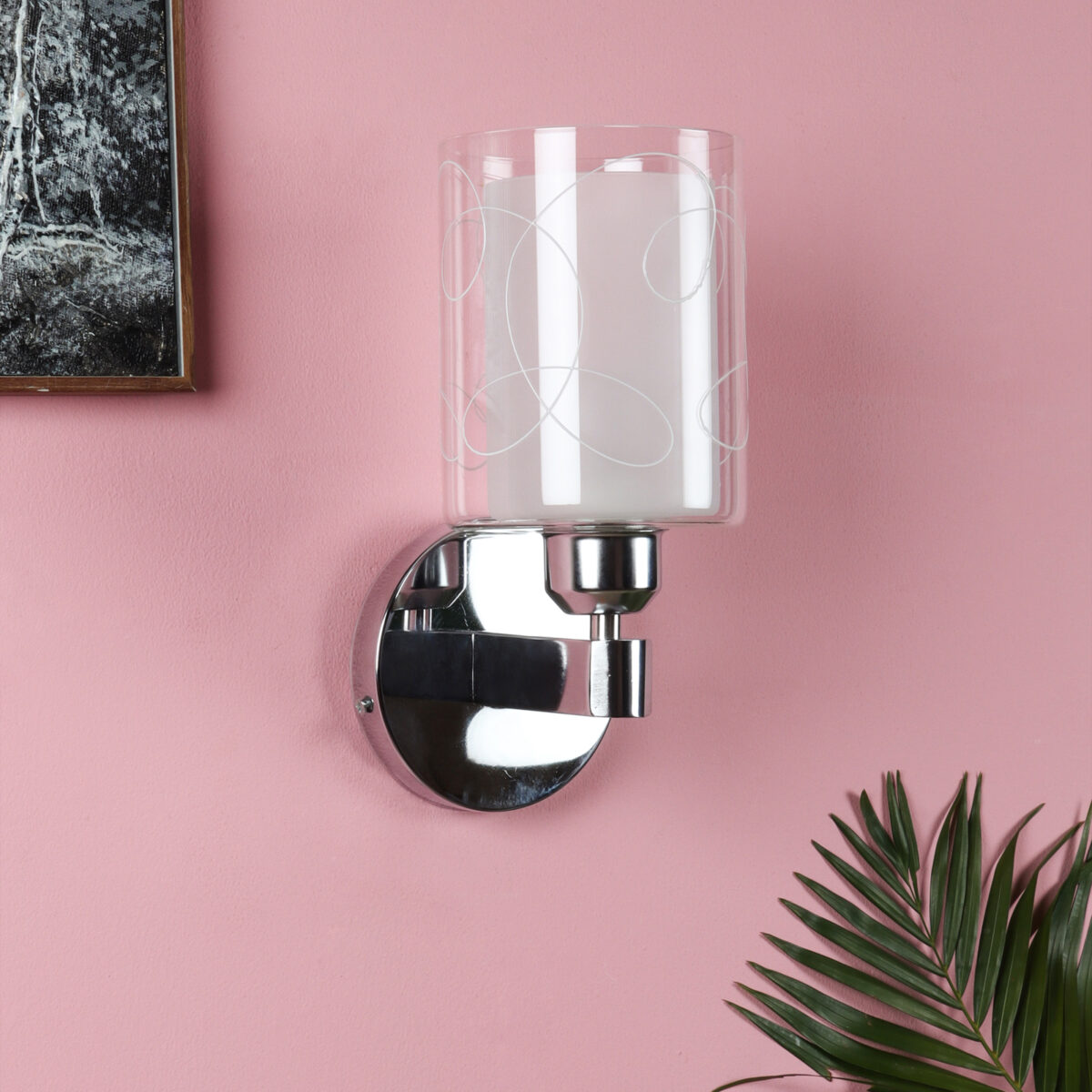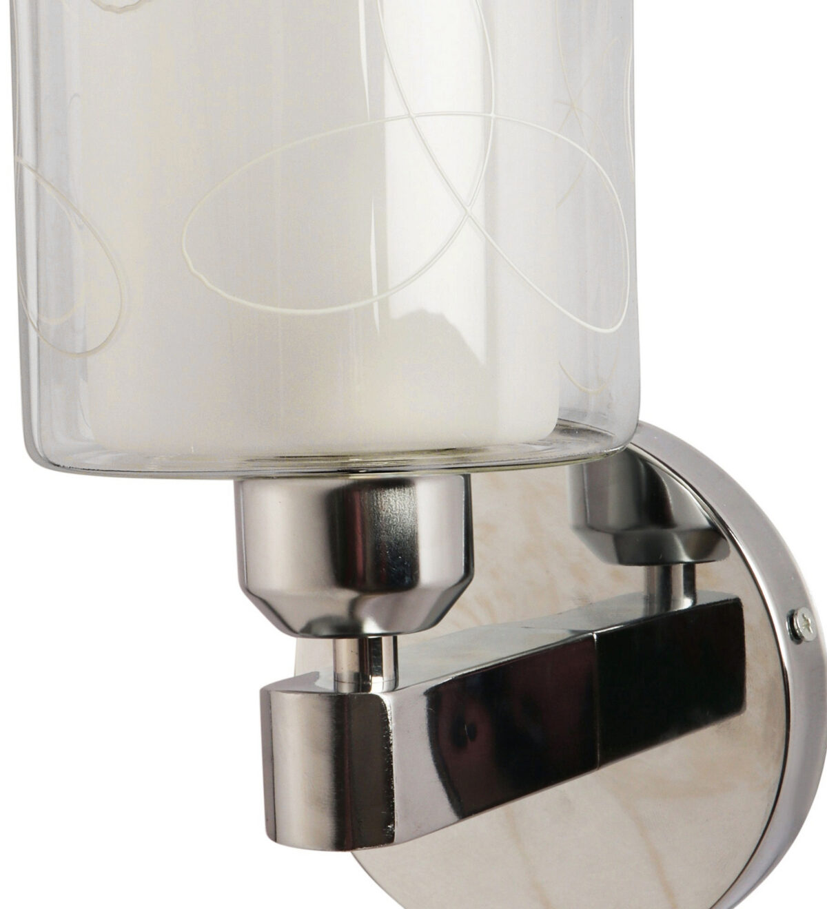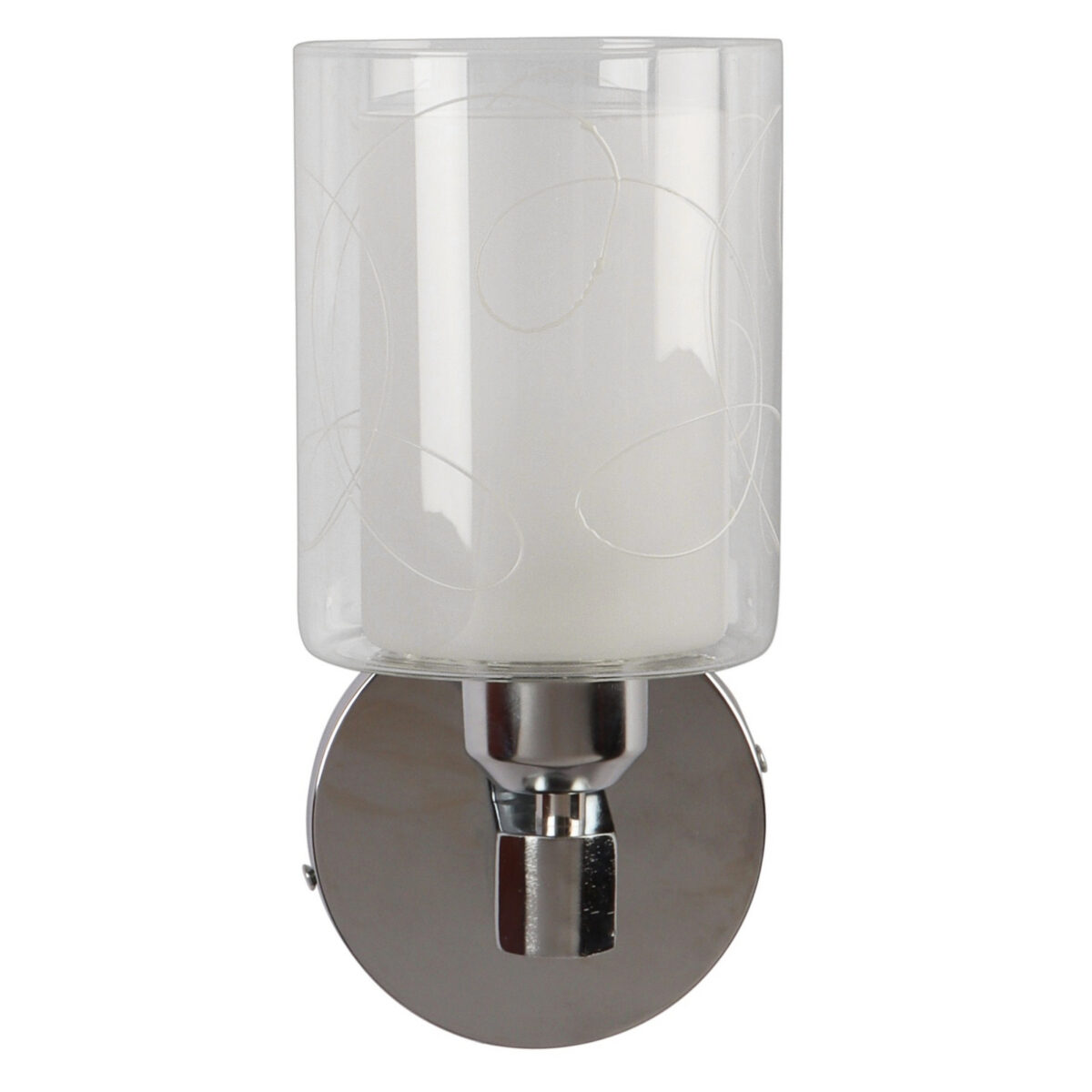 Silver (chrome) finish single wall light with double layered white glass with printed design. It is maintenance free, comes with an E27 holder, only the change of lamp is required, which is available locally everywhere. Application includes both residential and commercial premises wherever it matches with your interiors. Matching double wall light code – WL2692. LAMP NOT INCLUDED.