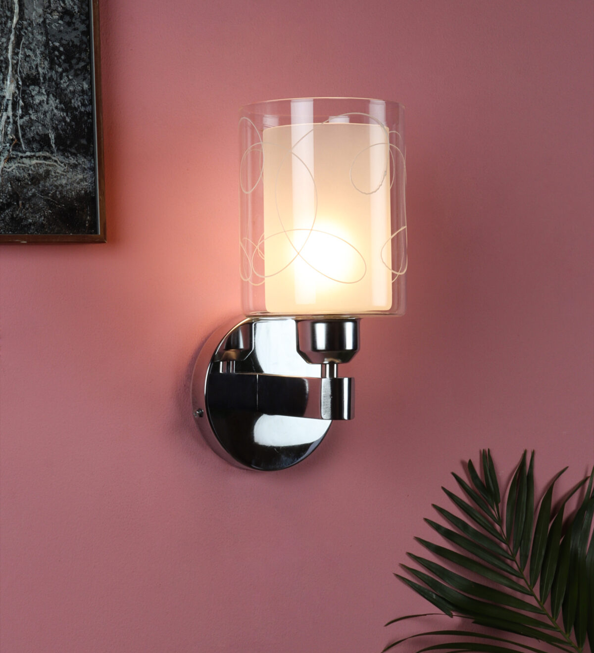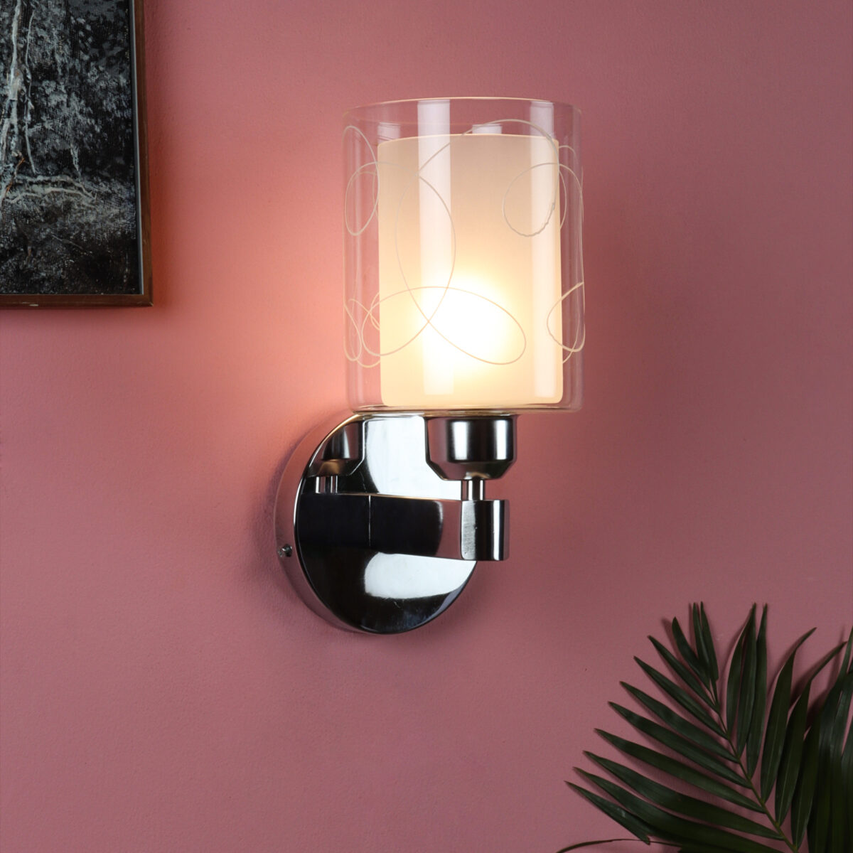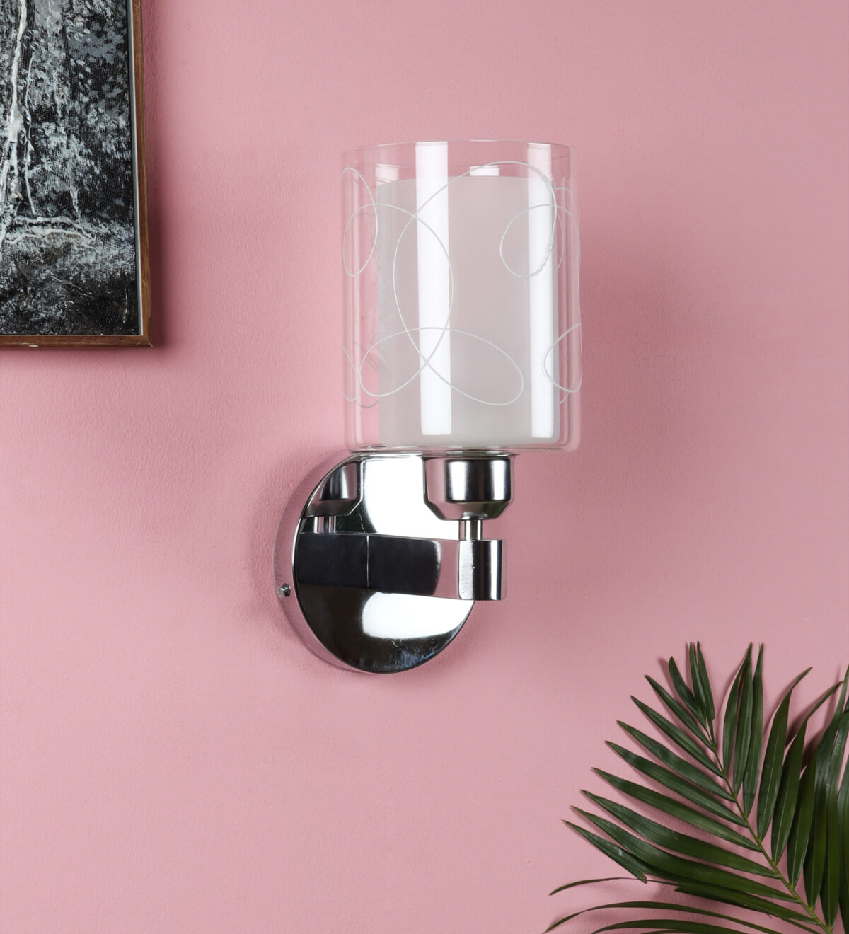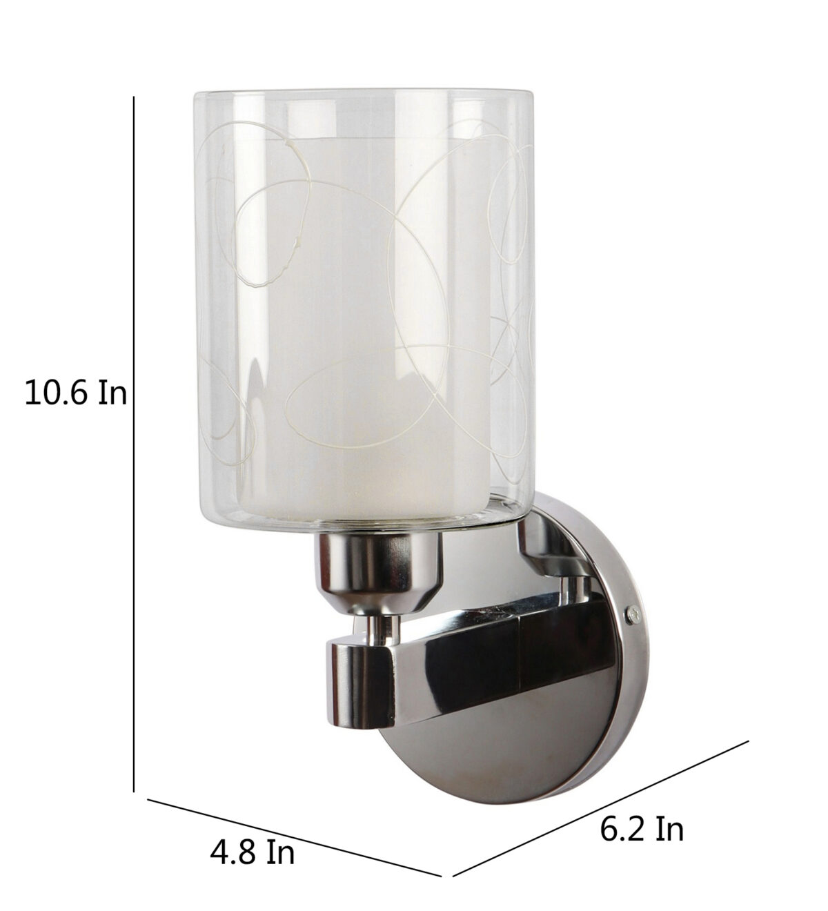Silver (chrome) finish single wall light with double layered white glass with printed design. It is maintenance free, comes with an E27 holder, only the change of lamp is required, which is available locally everywhere. Application includes both residential and commercial premises wherever it matches with your interiors. Matching double wall light code – WL2692. LAMP NOT INCLUDED.
