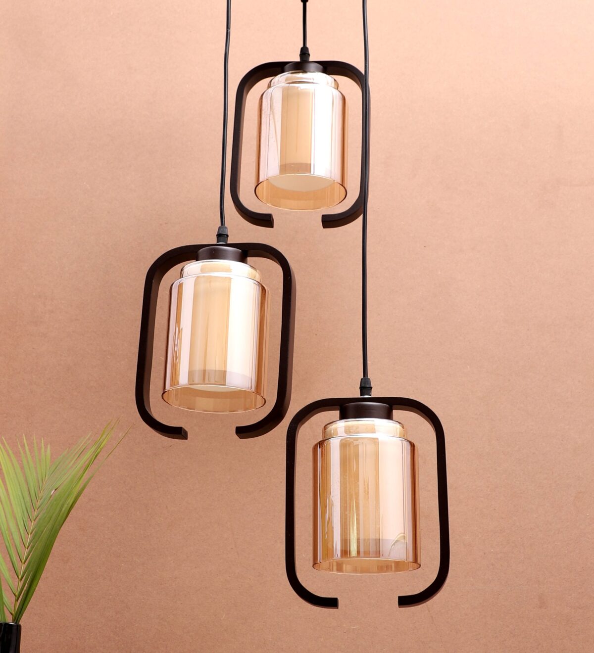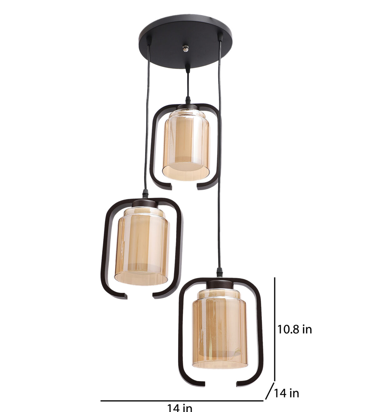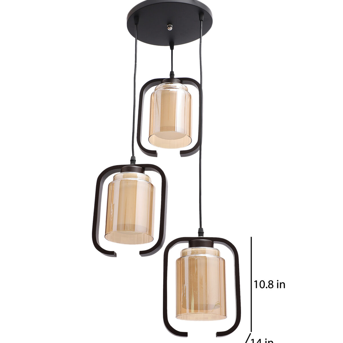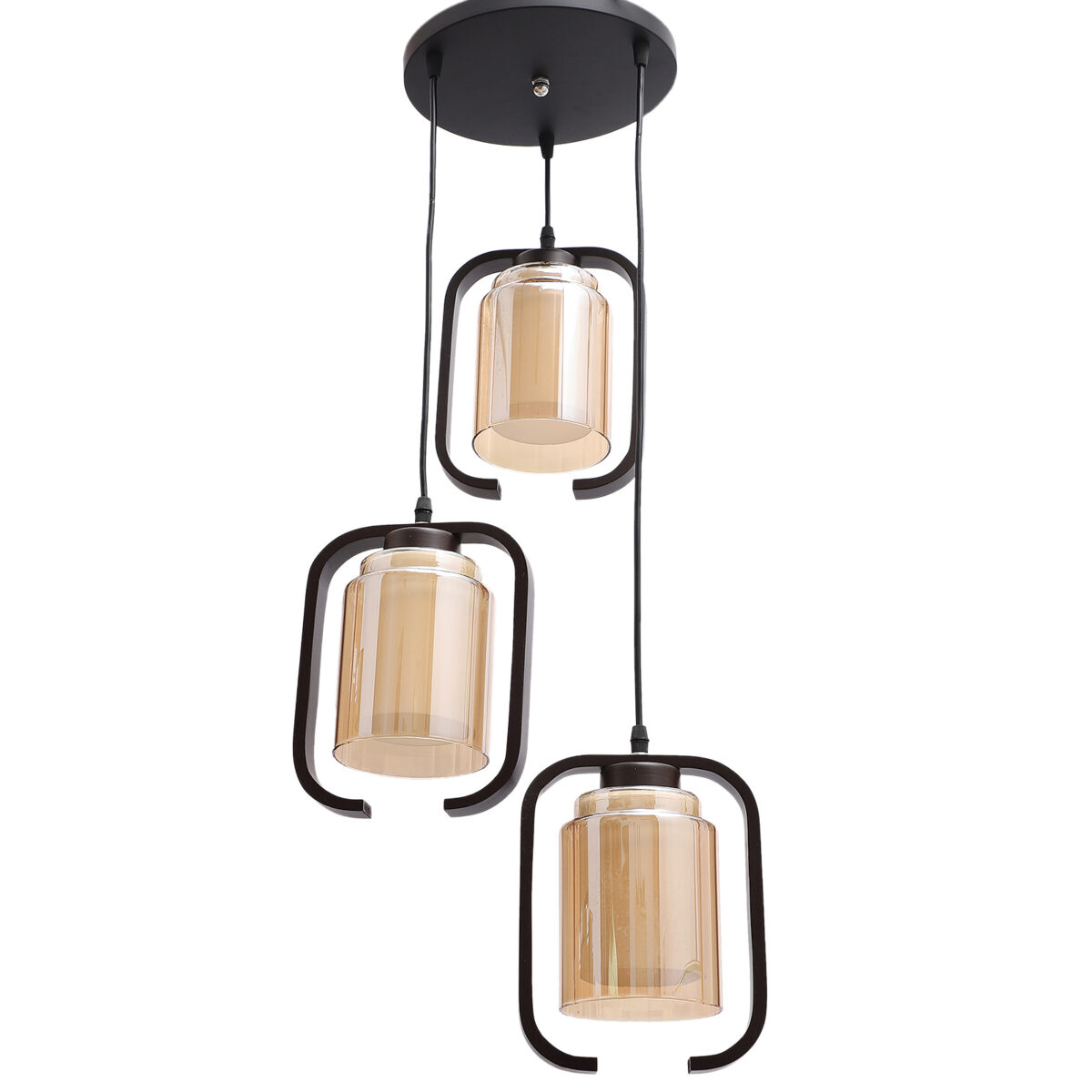Dark brown (wood) finish, champaign glass tripple hanging light, made of wood, mild steel and glass. The suspension can be adjusted at time of installation to the desired height. Can be customized as per requirement. LAMP NOT INCLUDED.