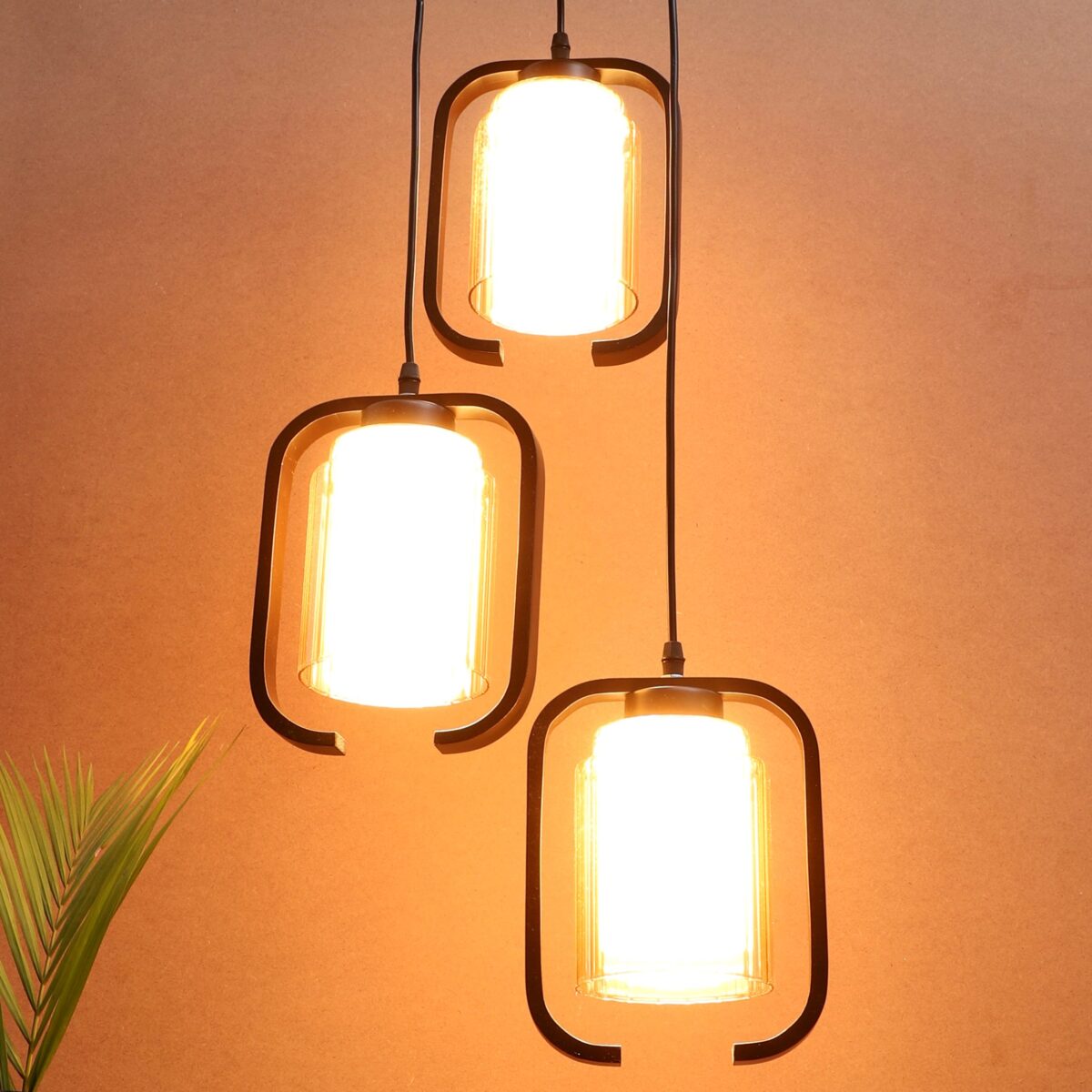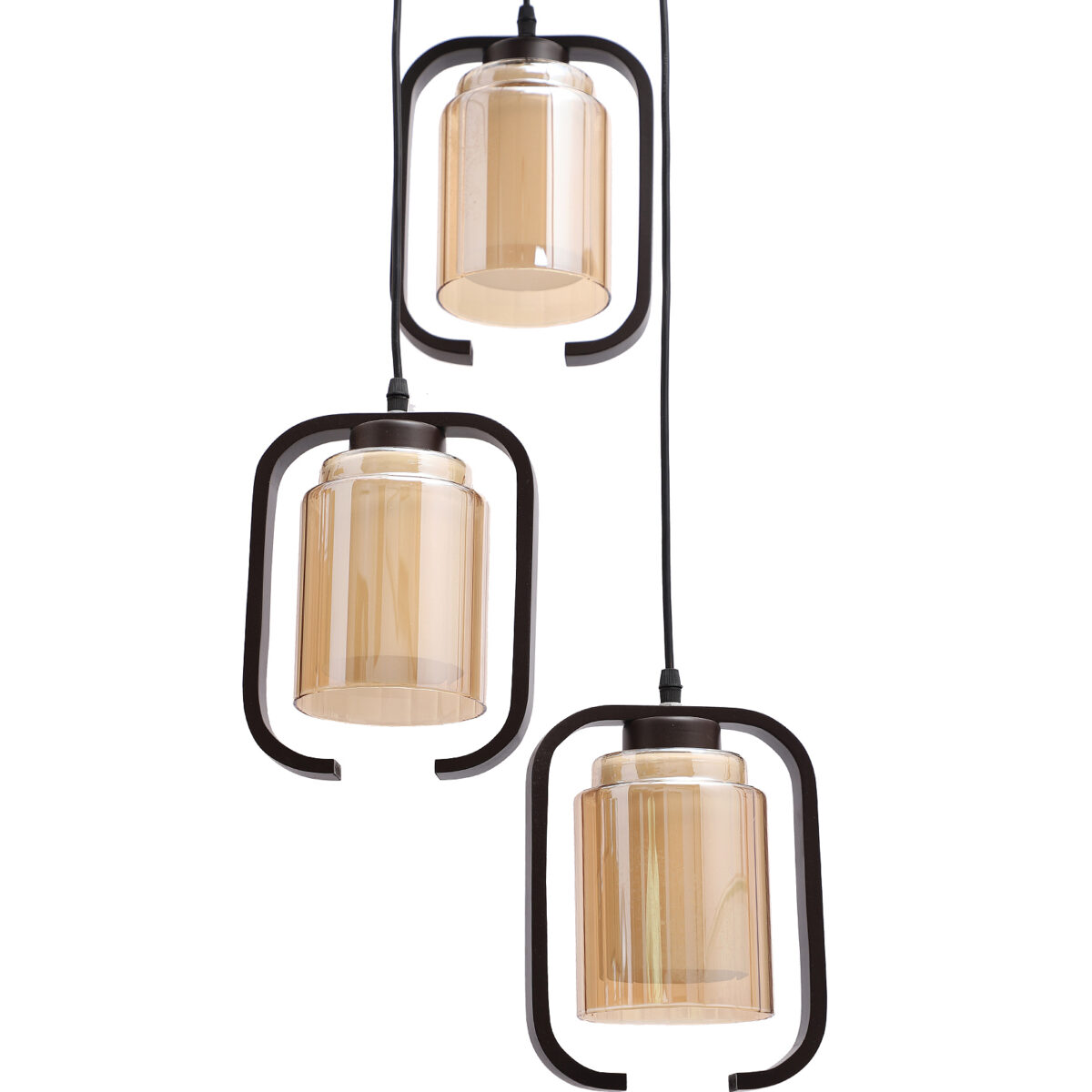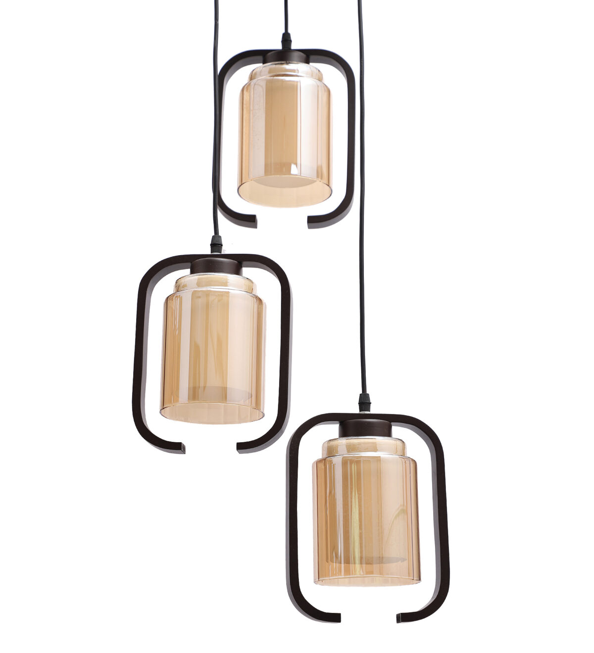 Dark brown (wood) finish, champaign glass tripple hanging light, made of wood, mild steel and glass. The suspension can be adjusted at time of installation to the desired height. Can be customized as per requirement. LAMP NOT INCLUDED.