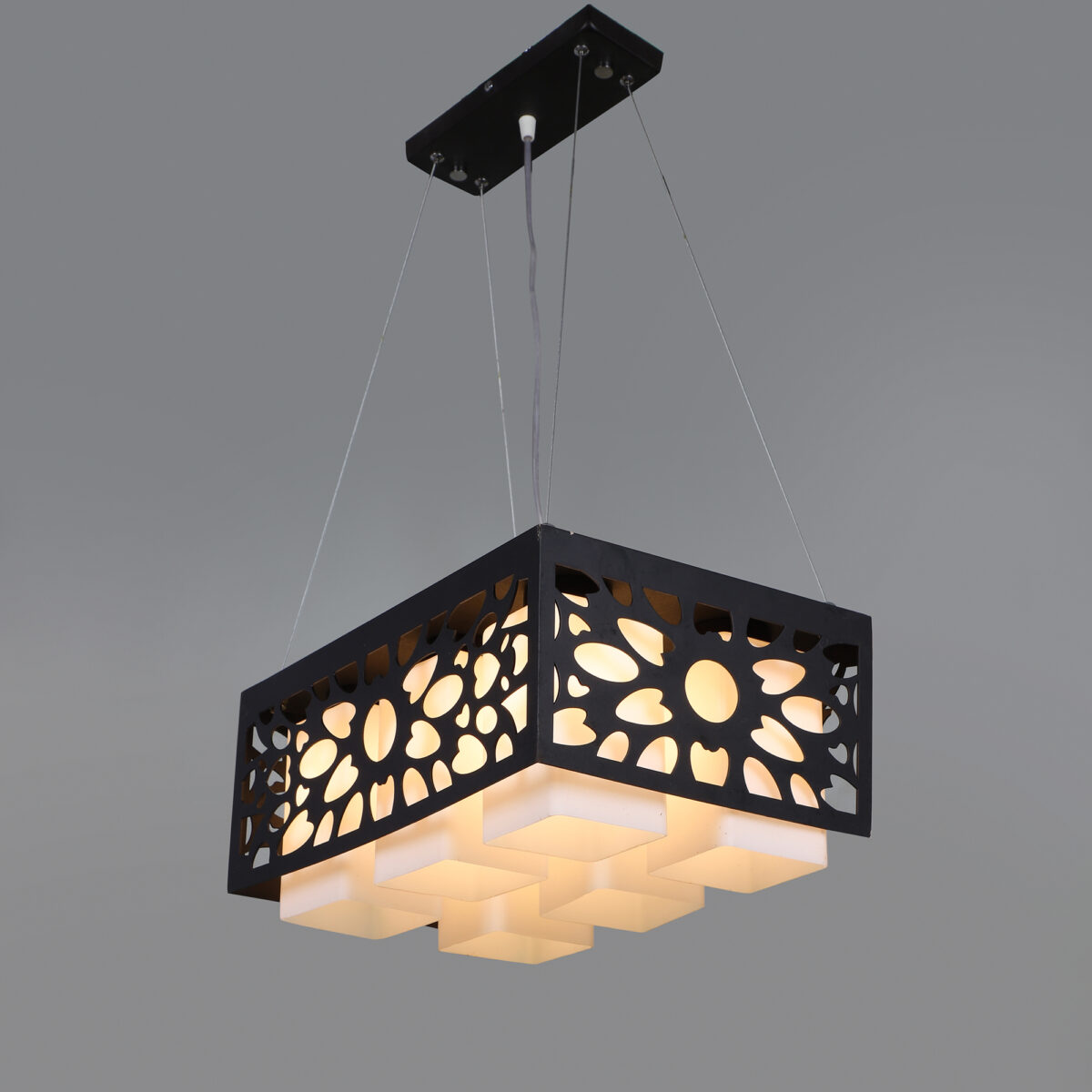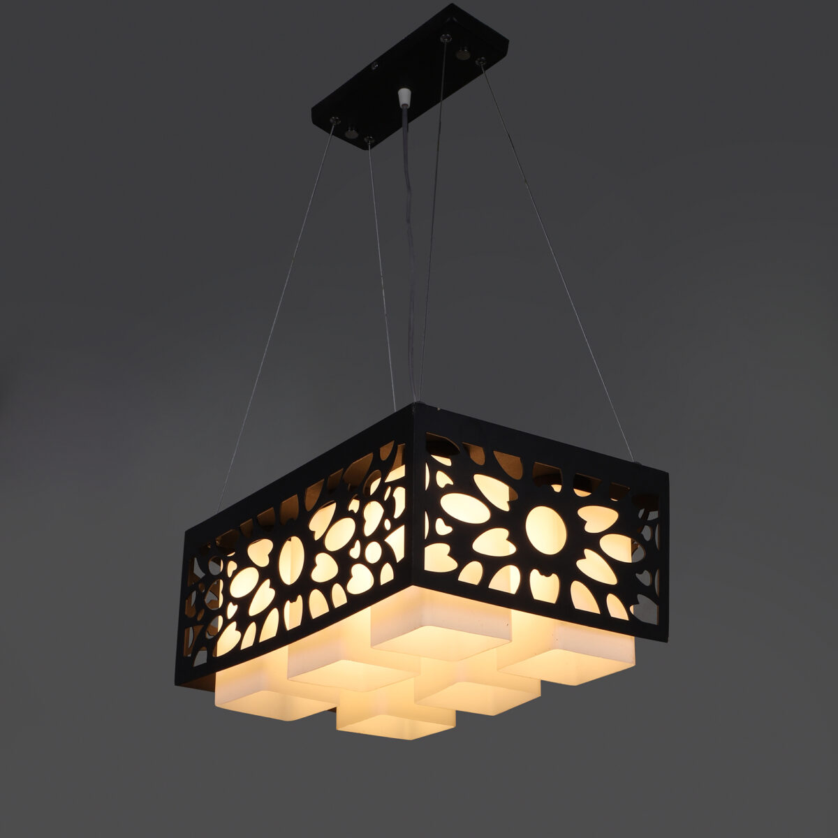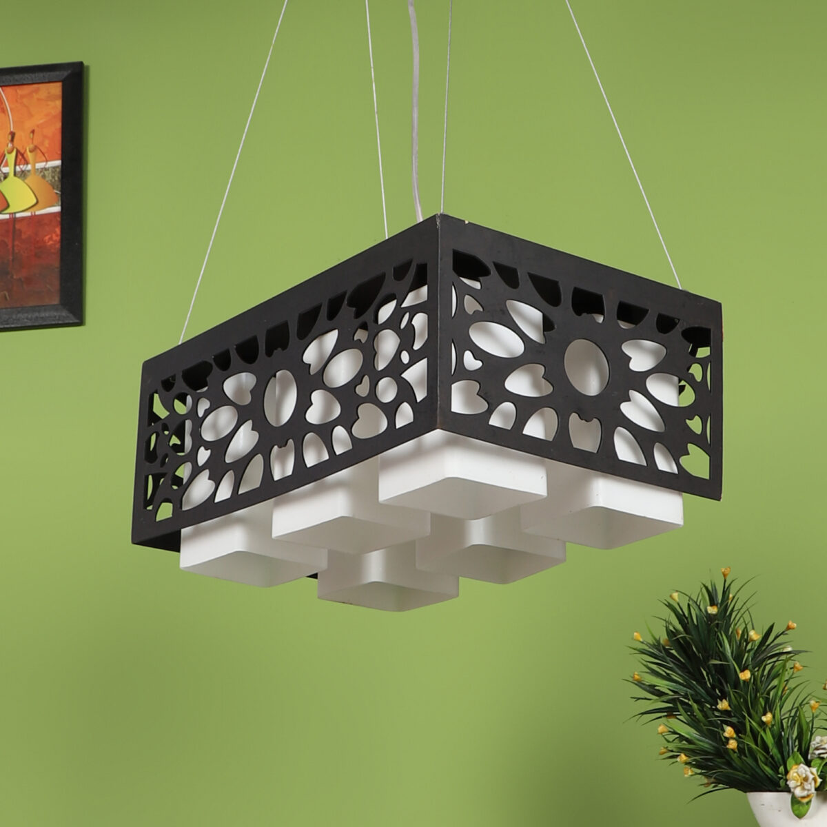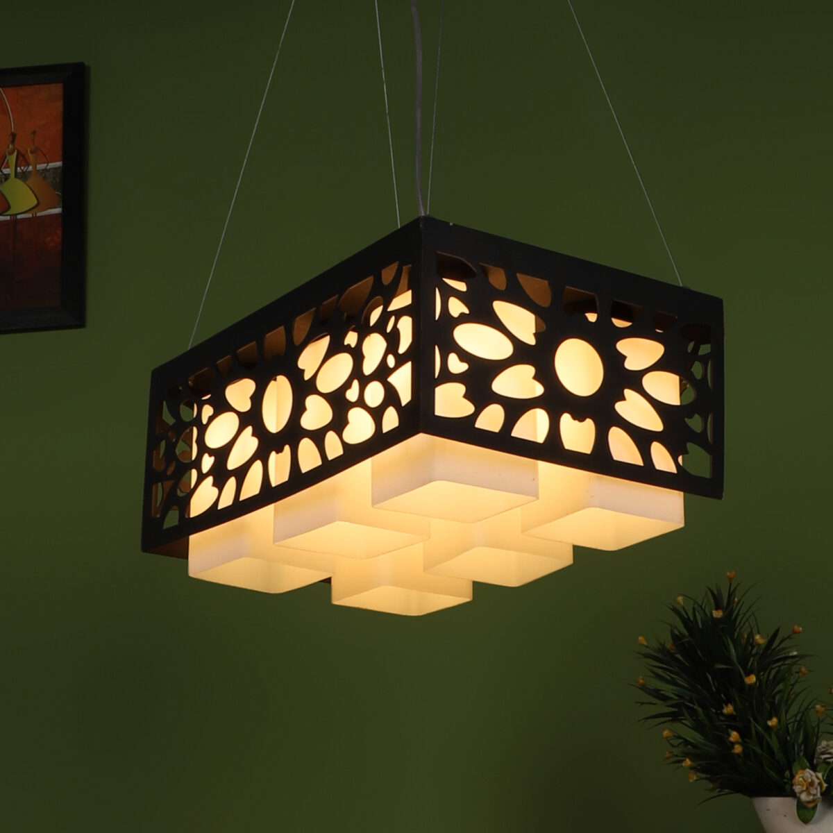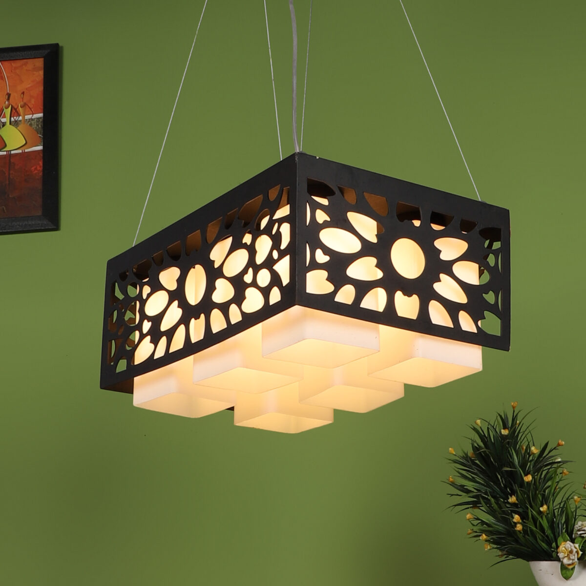 Dark brown (wood) finish, square glass with a designer wooden cover hanging light having six lamps made of wood, mild steel and glass. It is one of the regular design which is never out of trend. The suspension can be adjusted at time of installation to the desired height. It is maintenance free, easy to remove glass and wash them, comes with an E27 holder, only the change of lamp is required, which is available locally everywhere. Application includes both residential and commercial premises wherever it matches with your interiors. Matching hanging variations – HL3583, HL3579, HL3812-3. Matching wall light code – WL1813, WL1814. Can be customized as per requirement in case of bulk quantities. Lamp not included.