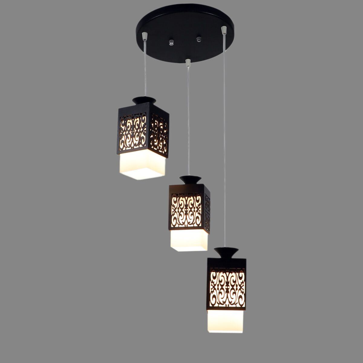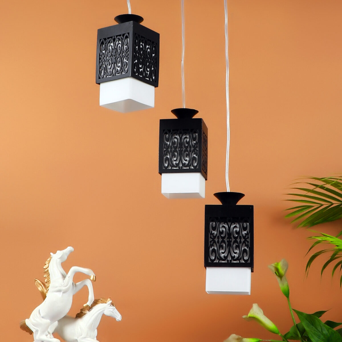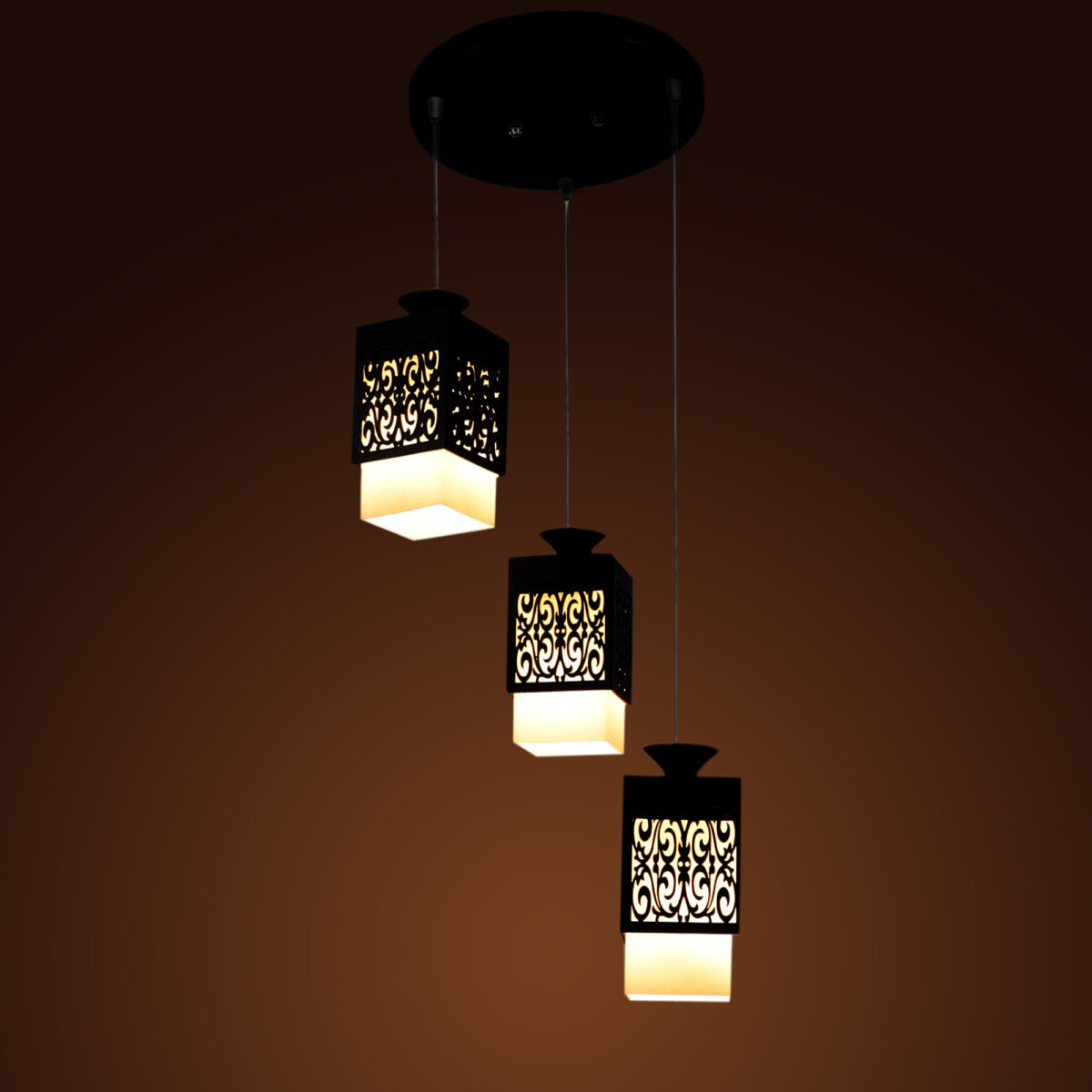 Dark brown (wood) finish, square glass with a designer wooden cover cluster hanging light having three lamps made of wood, mild steel and glass. It is one of the regular design which is never out of trend. The suspension can be adjusted at time of installation to the desired height. It is maintenance free, easy to remove glass and wash them, comes with an E27 holder, only the change of lamp is required, which is available locally everywhere. Application includes both residential and commercial premises wherever it matches with your interiors. Matching hanging variations -HL3921-1, HL3813-3, HL3813-6. Matching wall light code – WL1803, WL1804. Can be customized as per requirement in case of bulk quantities. Lamp not included.