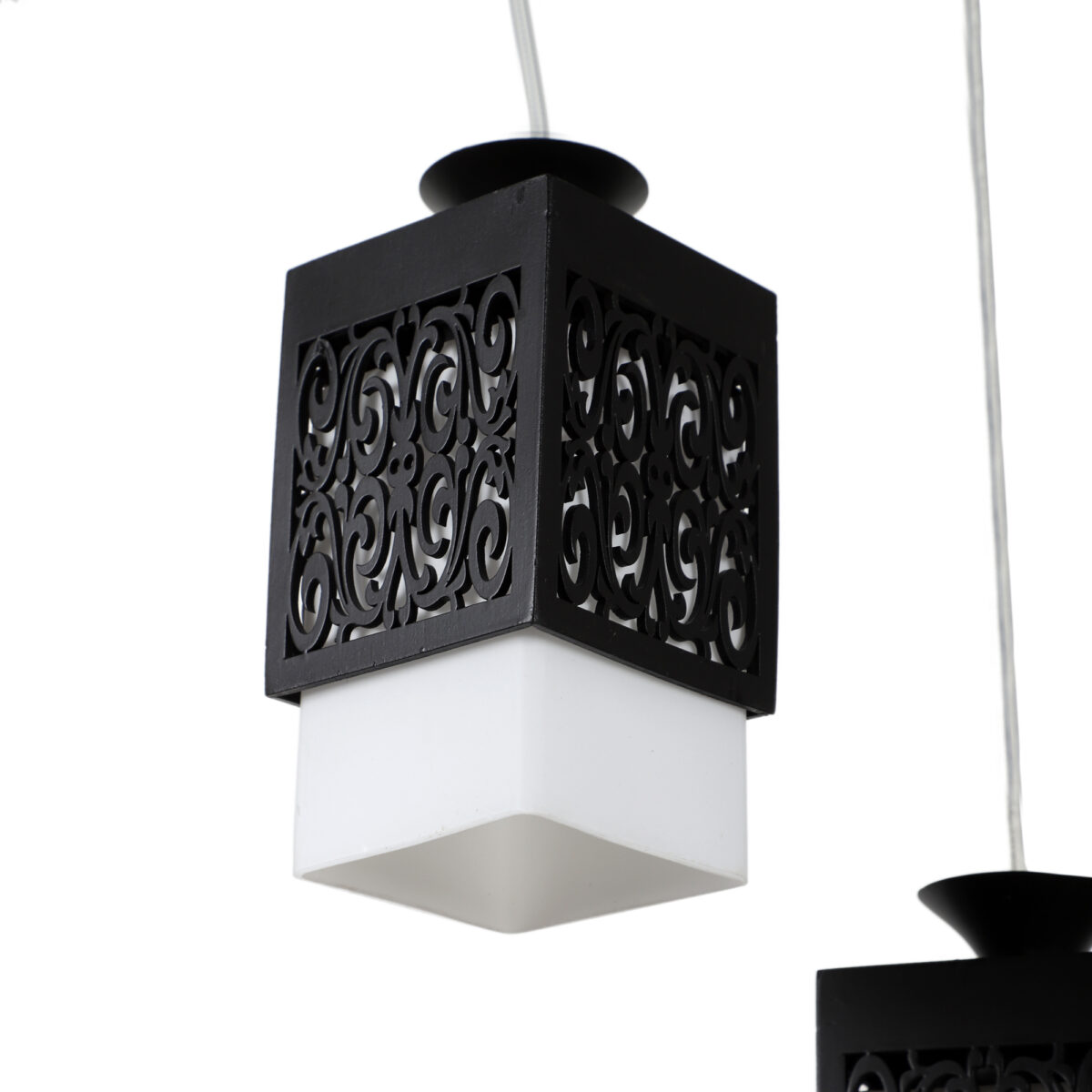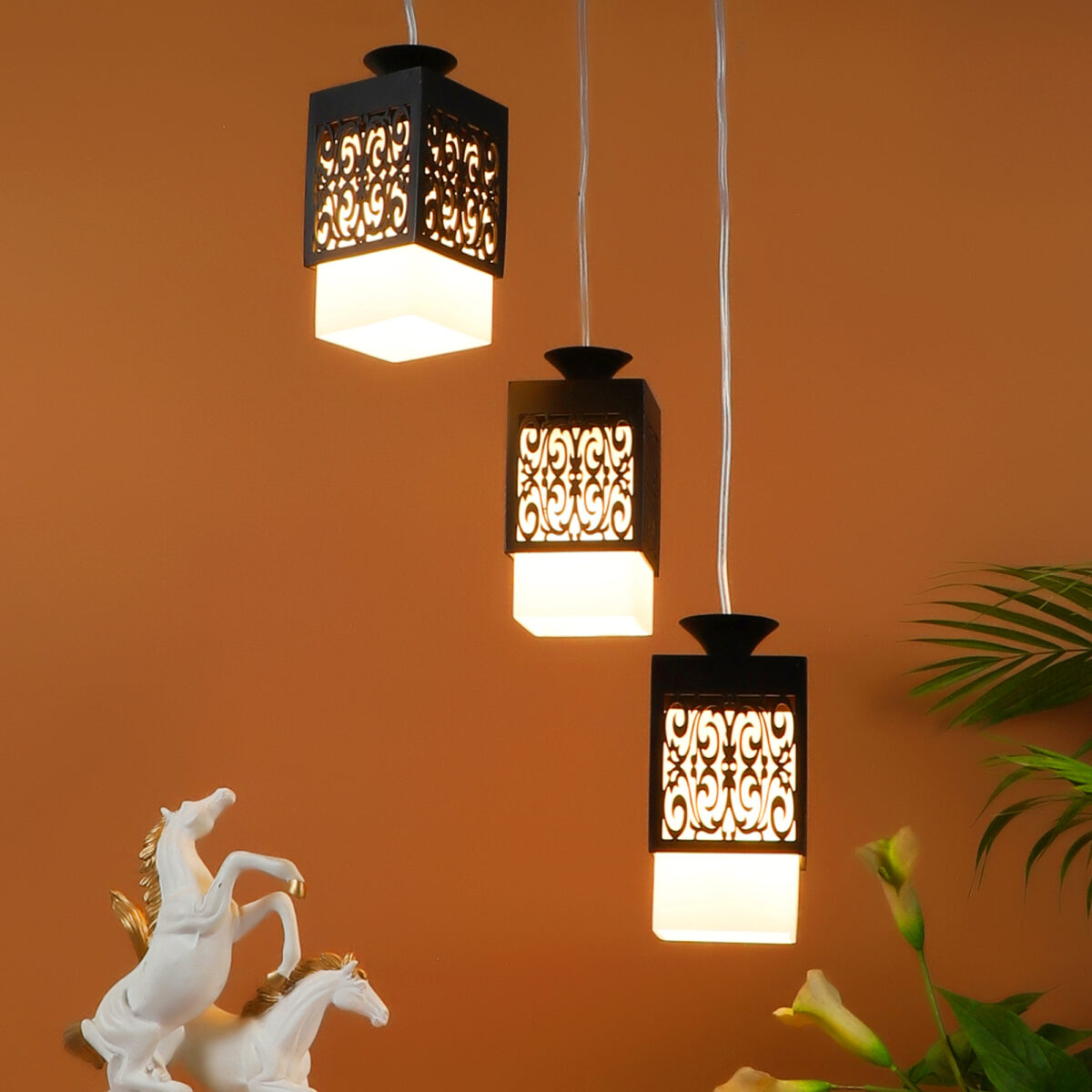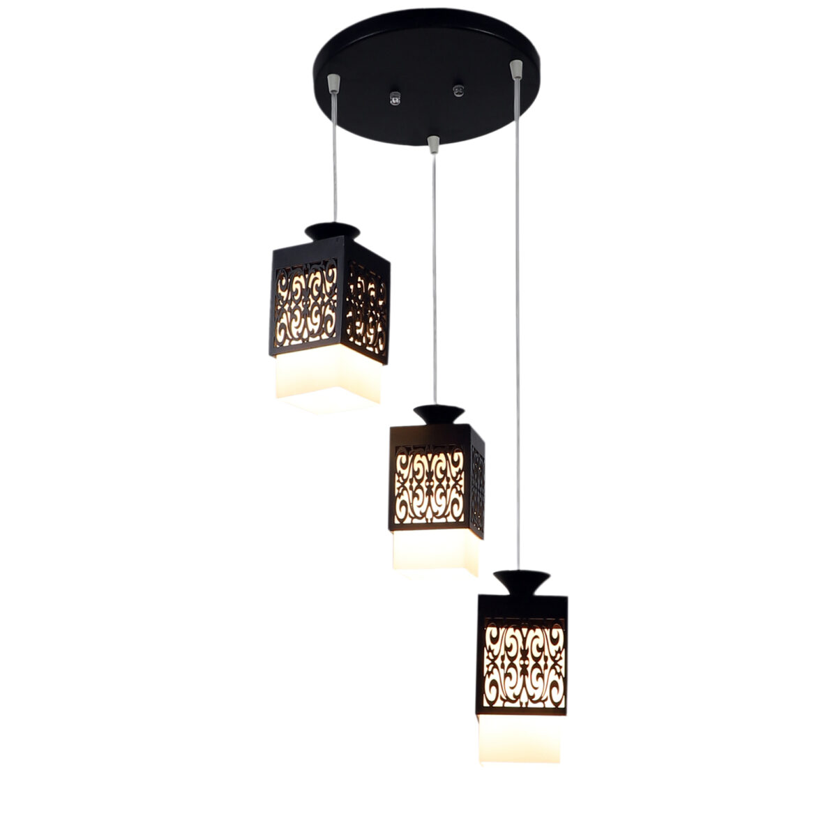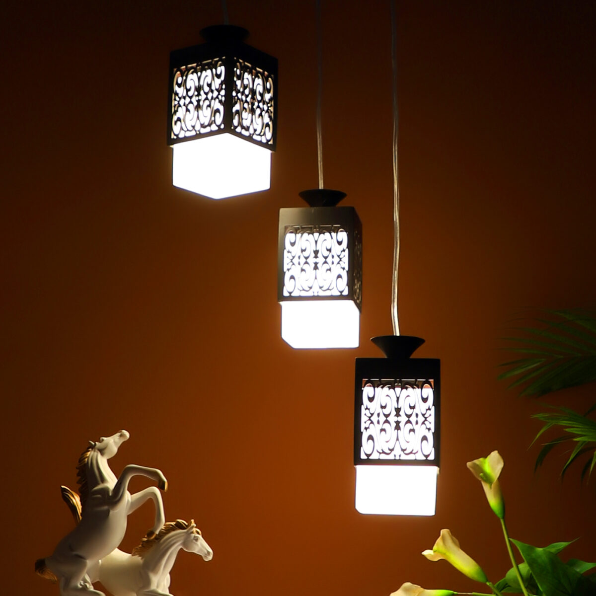 Dark brown (wood) finish, square glass with a designer wooden cover cluster hanging light having three lamps made of wood, mild steel and glass. It is one of the regular design which is never out of trend. The suspension can be adjusted at time of installation to the desired height. It is maintenance free, easy to remove glass and wash them, comes with an E27 holder, only the change of lamp is required, which is available locally everywhere. Application includes both residential and commercial premises wherever it matches with your interiors. Matching hanging variations -HL3921-1, HL3813-3, HL3813-6. Matching wall light code – WL1803, WL1804. Can be customized as per requirement in case of bulk quantities. Lamp not included.