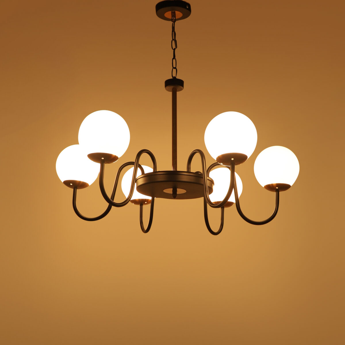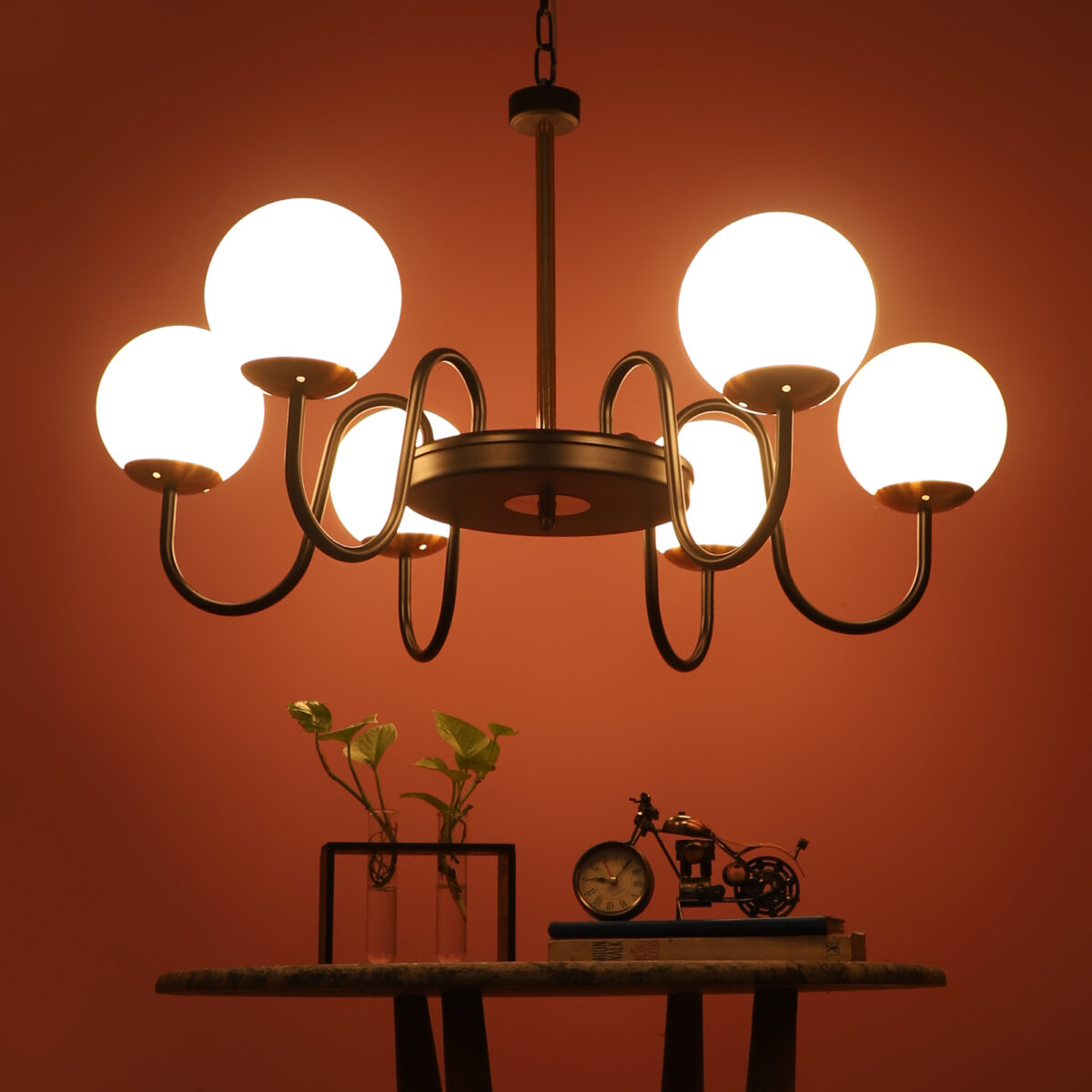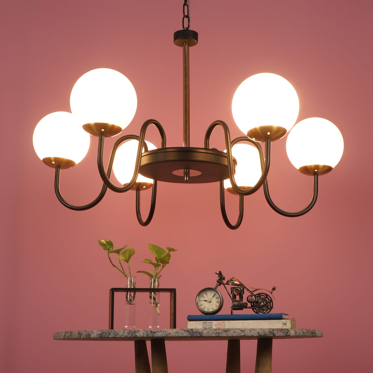 Brown gold finish chandellier having small, round globe (doom) white glass mounted on a designer frame made of mild steel having six lights. This is a hanging type chandelier in which the base plate is fixed to the ceiling with the help of straight clamp and screws. The suspension can be adjusted at time of installation to the desired height. It is maintenance free, easy to remove glasses and wash them, comes with an E27 holder, only the change of lamp is required, which is available locally everywhere. Application includes both residential and commercial premises wherever it matches with your interiors. Can be customized as per requirement. LAMP NOT INCLUDED.