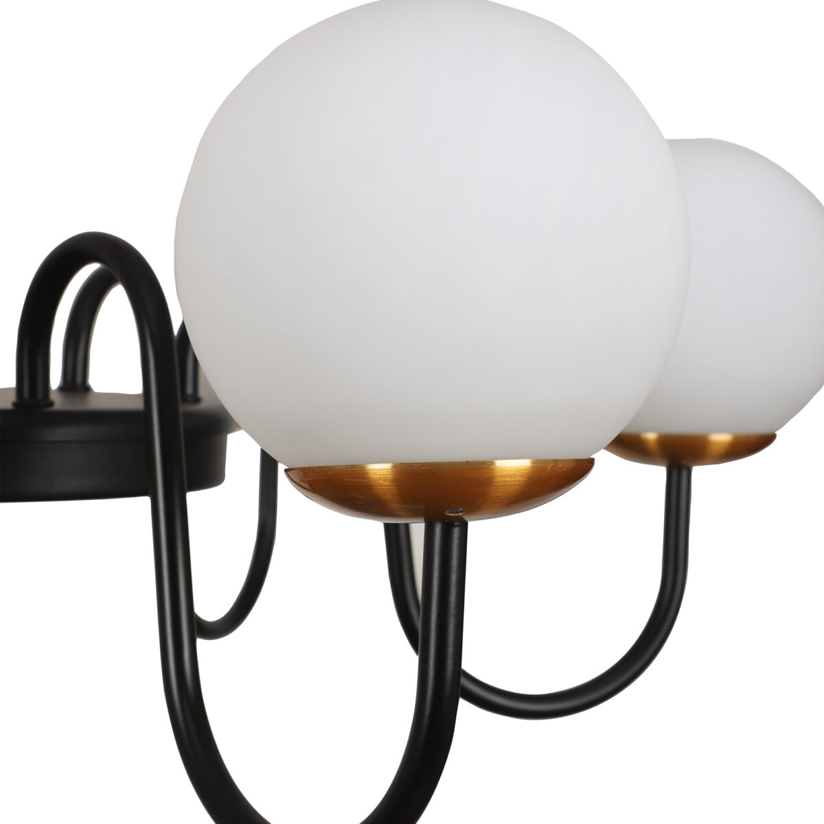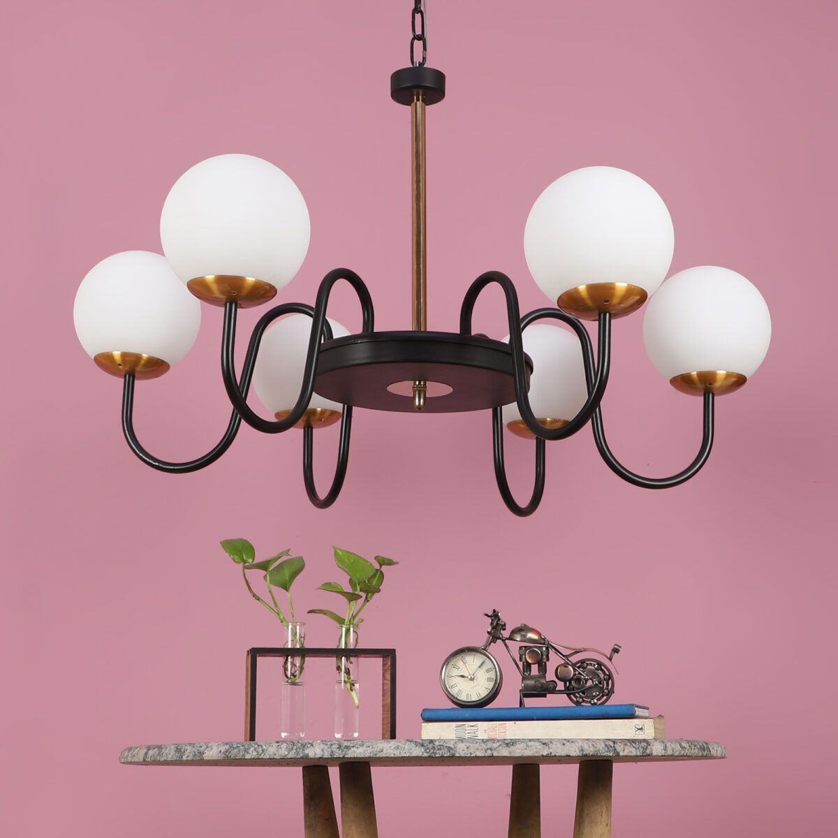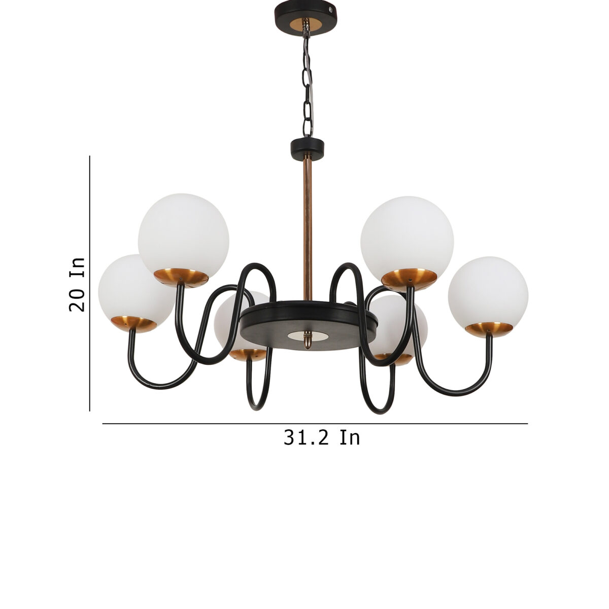 Brown gold finish chandellier having small, round globe (doom) white glass mounted on a designer frame made of mild steel having six lights. This is a hanging type chandelier in which the base plate is fixed to the ceiling with the help of straight clamp and screws. The suspension can be adjusted at time of installation to the desired height. It is maintenance free, easy to remove glasses and wash them, comes with an E27 holder, only the change of lamp is required, which is available locally everywhere. Application includes both residential and commercial premises wherever it matches with your interiors. Can be customized as per requirement. LAMP NOT INCLUDED.