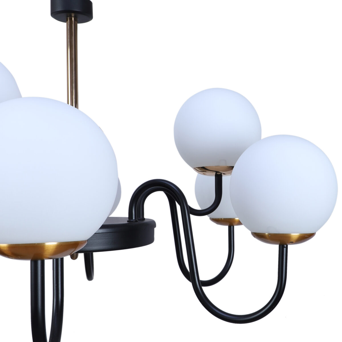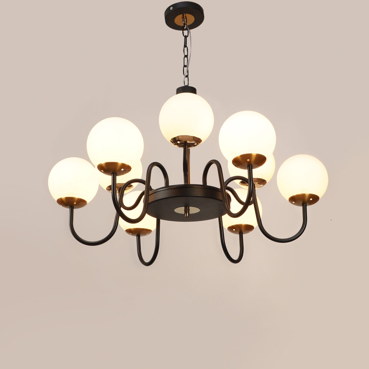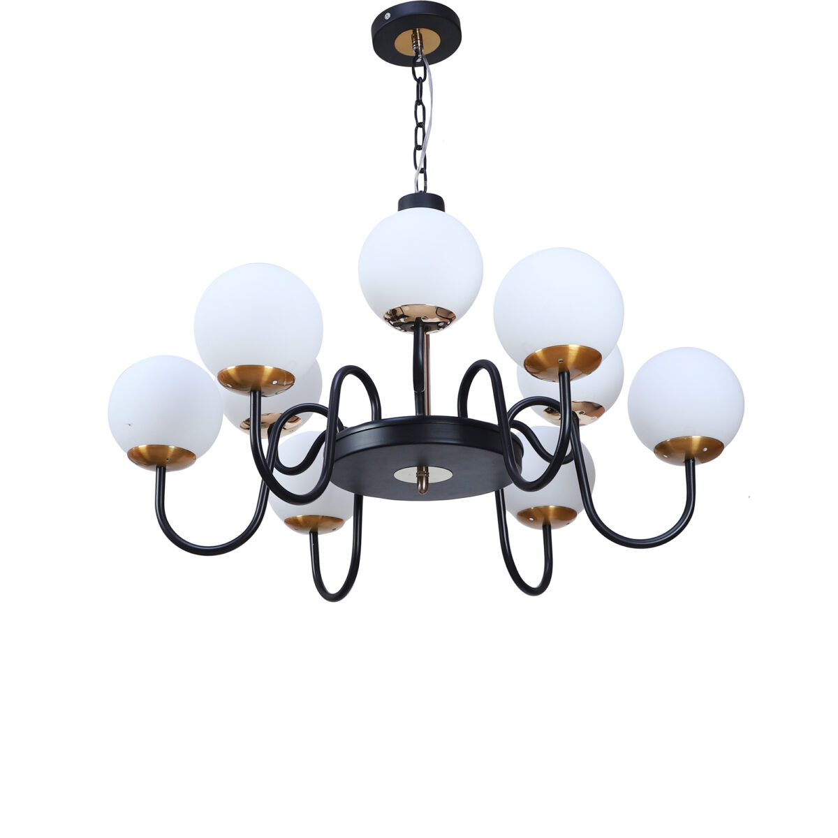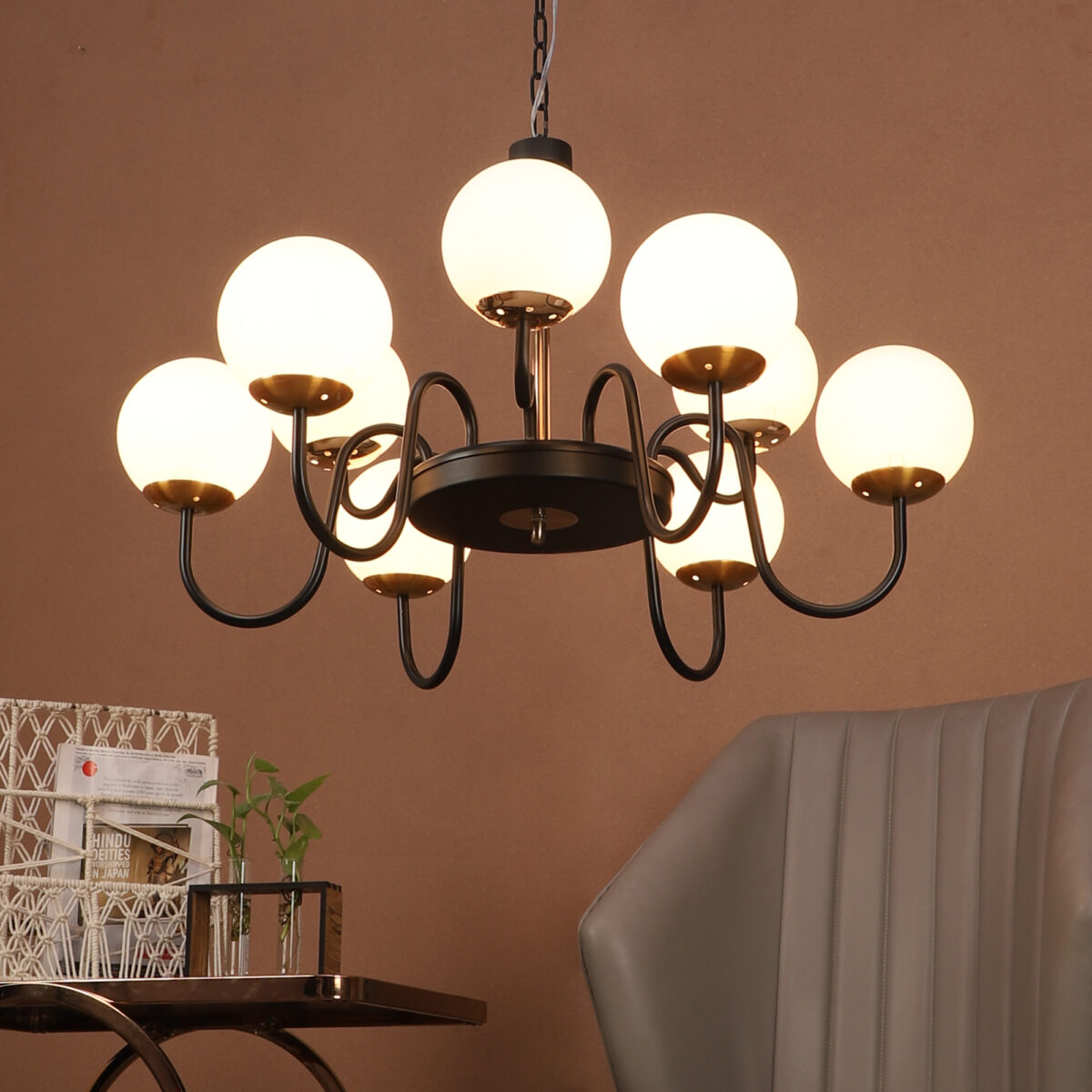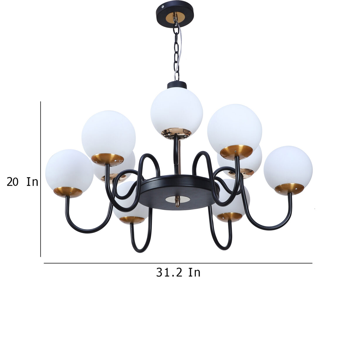 Brown gold finish chandellier having small, round globe (doom) white glass mounted on a designer frame made of mild steel and wood having nine lights (6+3). This is a hanging type chandelier in which the base plate is fixed to the ceiling with the help of straight clamp and screws. The suspension can be adjusted at time of installation to the desired height. It is maintenance free, easy to remove glasses and wash them, comes with an E27 holder, only the change of lamp is required, which is available locally everywhere. Application includes both residential and commercial premises wherever it matches with your interiors. Can be customized as per requirement. LAMP NOT INCLUDED.