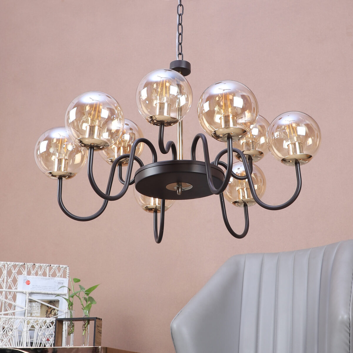 Brown gold finish, small, round globe (doom) champaign coloured glass mounted on a designer frame made of mild steel and wood having nine lights (6+3). This is a hanging type chandelier in which the base plate is fixed to the ceiling with the help of straight clamp and screws. The suspension can be adjusted at time of installation to the desired height. It is maintenance free, easy to remove glasses and wash them, comes with an E27 holder, only the change of lamp is required, which is available locally everywhere. Filament lamp is recommended to enhance its beauty. Application includes both residential and commercial premises wherever it matches with your interiors. Can be customized as per requirement. LAMP NOT INCLUDED.