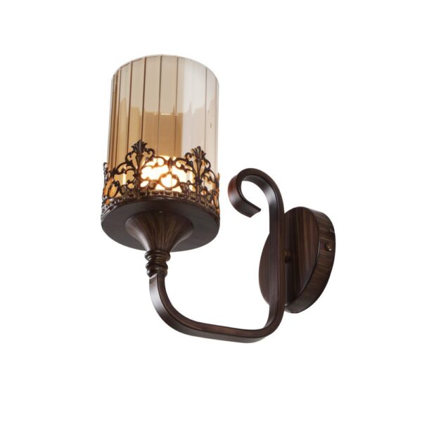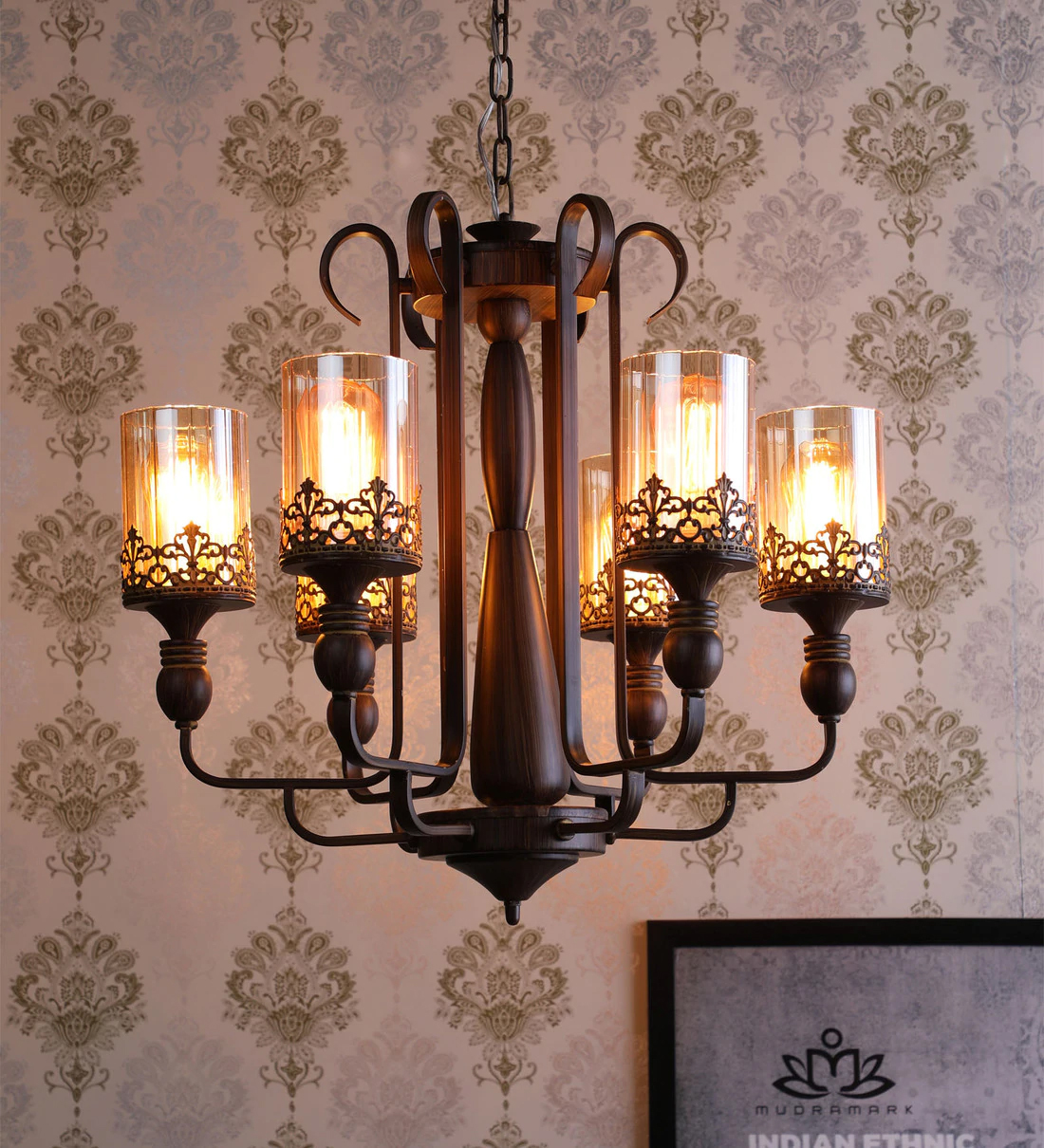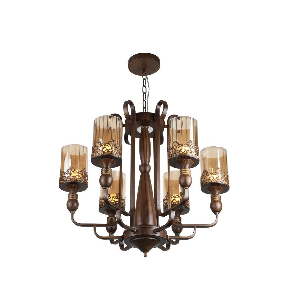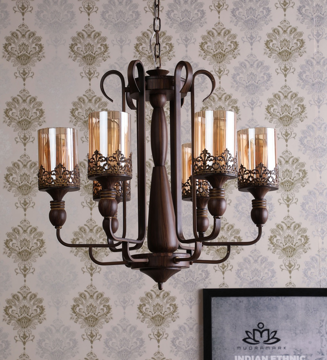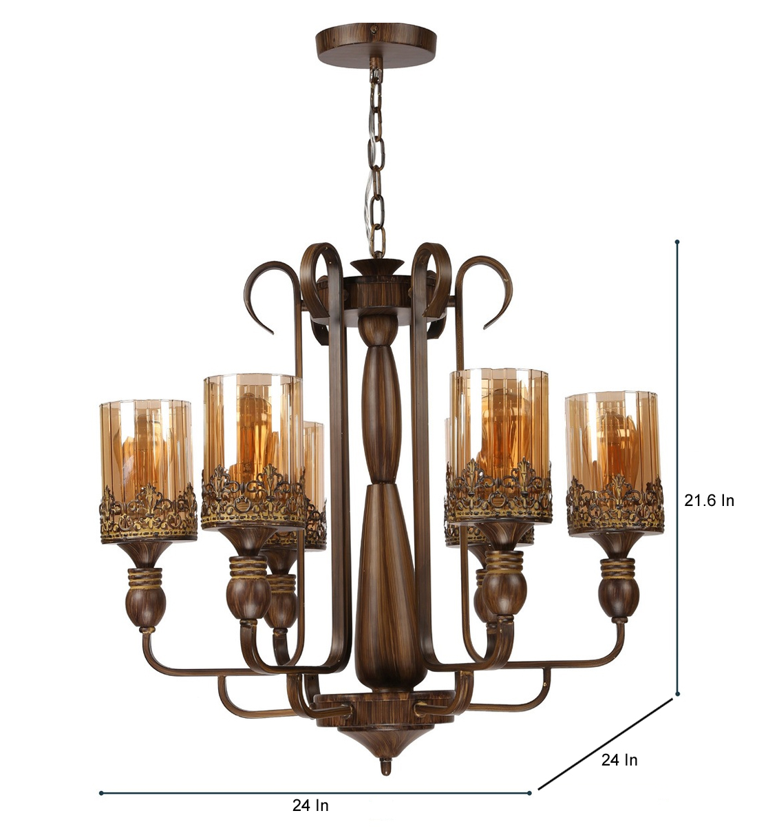 Brown (wood) finish, round, cylindrical champagne coloured glass mounted on a designer frame made of mild steel having six lights. This is a hanging type chandelier in which the base plate is fixed to the ceiling with the help of straight clamp and screws. The suspension can be adjusted at time of installation to the desired height. It is maintenance free, it is easy to remove glass and wash them. Comes with an E27 holder, only the change of lamp is required, which is available locally everywhere. Application includes both residential and commercial premises wherever it matches with your interiors. Matching wall light code CW390-1, CW390-2. Can be customized as per requirement in case of bulk quantities. LAMP NOT INCLUDED.