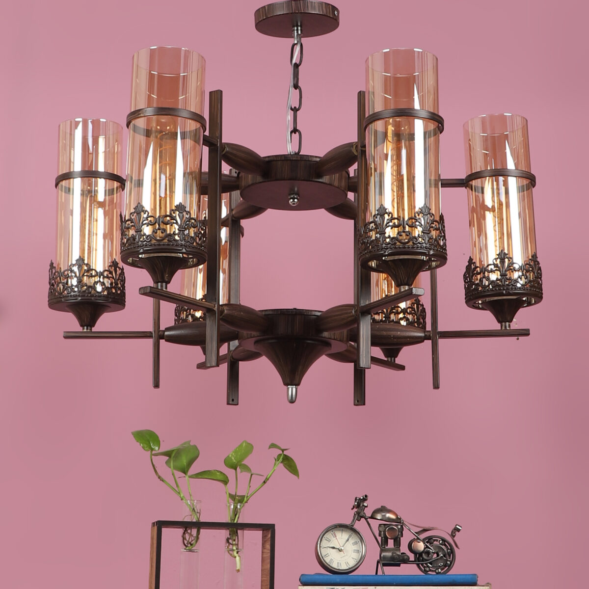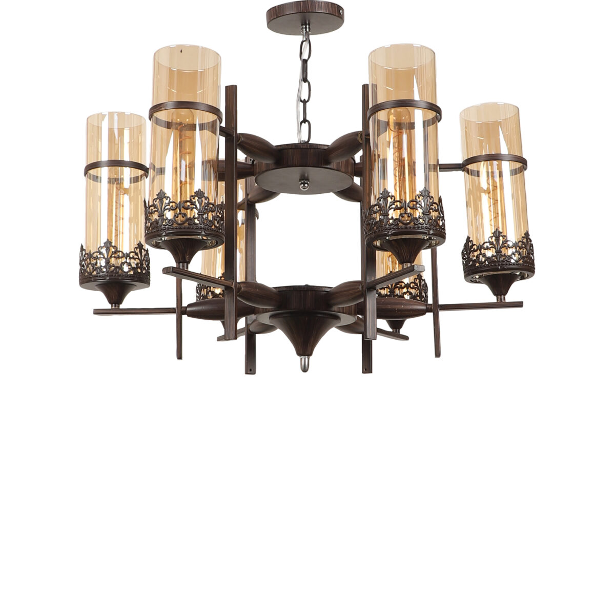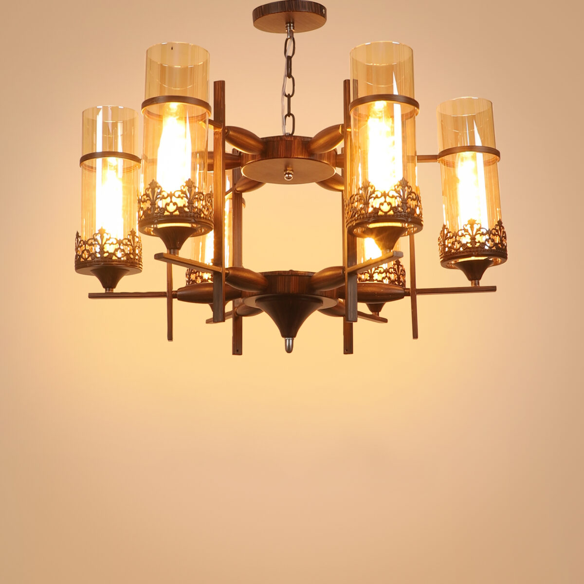 Brown (wood) finish, round, cylindrical champagne coloured glass mounted on a designer frame made of mild steel having six lights. This is a hanging type chandelier in which the base plate is fixed to the ceiling with the help of straight clamp and screws. The suspension can be adjusted at time of installation to the desired height. It is maintenance free, it is easy to remove glass and wash them. Comes with an E27 holder, only the change of lamp is required, which is available locally everywhere. Application includes both residential and commercial premises wherever it matches with your interiors. Matching wall light code WL2299, WL2317. Matching hanging light code – HL4083. Can be customized as per requirement in case of bulk quantities. This along with its variants are the best selling products in our catalogue. LAMP NOT INCLUDED.
