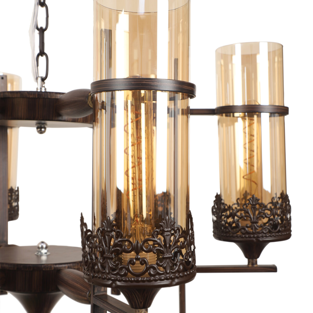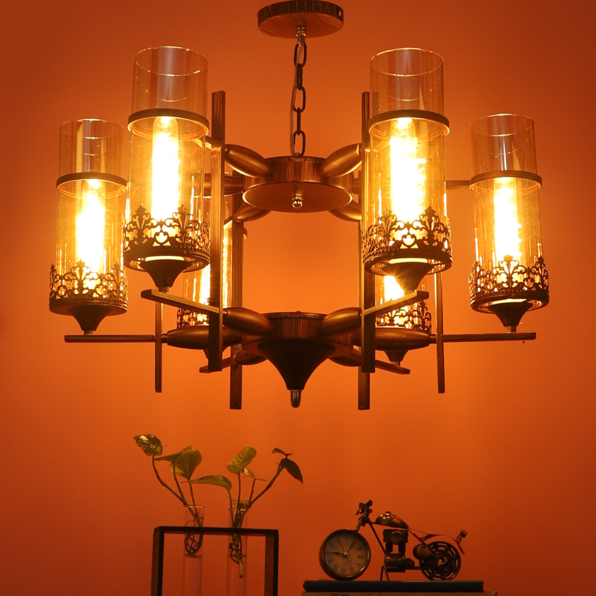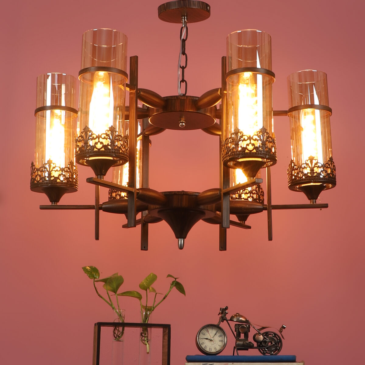 Brown (wood) finish, round, cylindrical champagne coloured glass mounted on a designer frame made of mild steel having six lights. This is a hanging type chandelier in which the base plate is fixed to the ceiling with the help of straight clamp and screws. The suspension can be adjusted at time of installation to the desired height. It is maintenance free, it is easy to remove glass and wash them. Comes with an E27 holder, only the change of lamp is required, which is available locally everywhere. Application includes both residential and commercial premises wherever it matches with your interiors. Matching wall light code WL2299, WL2317. Matching hanging light code – HL4083. Can be customized as per requirement in case of bulk quantities. This along with its variants are the best selling products in our catalogue. LAMP NOT INCLUDED.