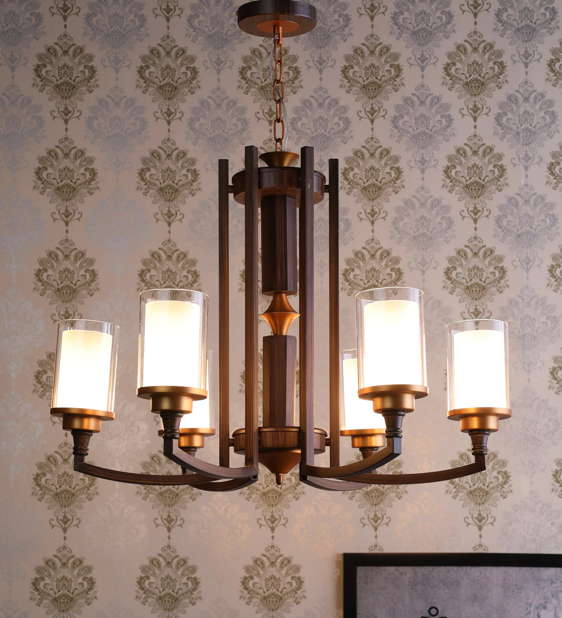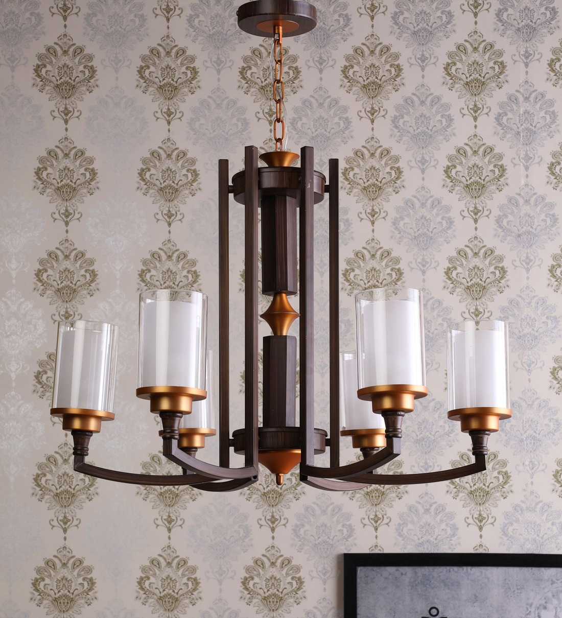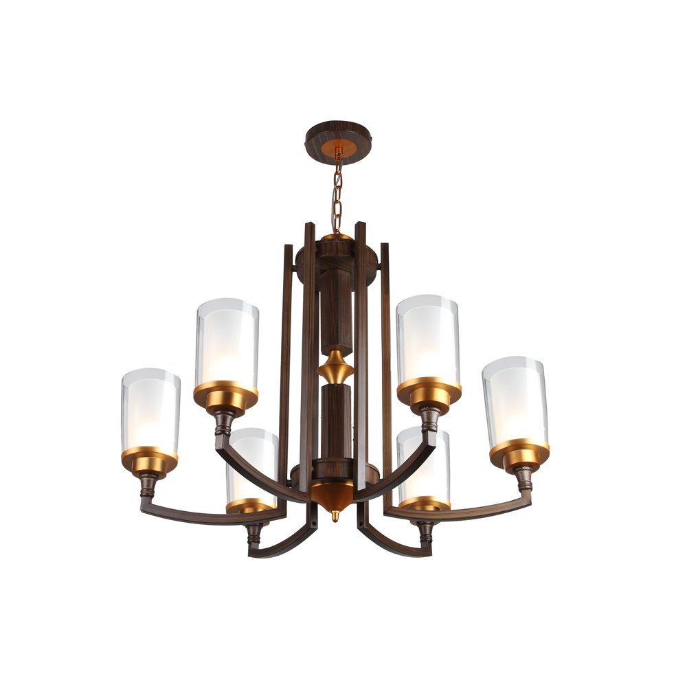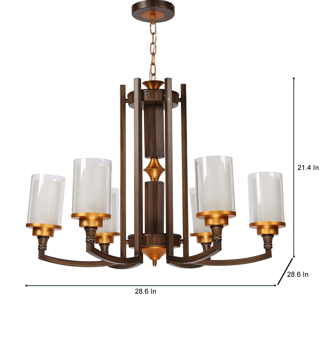 Dark brown (wood), gold finish, round, cylindrical two layered glass mounted on a designer frame made of mild steel having six lights. This is a hanging type chandelier in which the base plate is fixed to the ceiling with the help of straight clamp and screws. The suspension can be adjusted at time of installation to the desired height. It is maintenance free, easy to remove glass and wash them. Comes with an E27 holder, only the change of lamp is required, which is available locally everywhere. Application includes both residential and commercial premises wherever it matches with your interiors. Matching wall light code WL2405, WL2406. Can be customized as per requirement in case of bulk quantities. LAMP NOT INCLUDED.