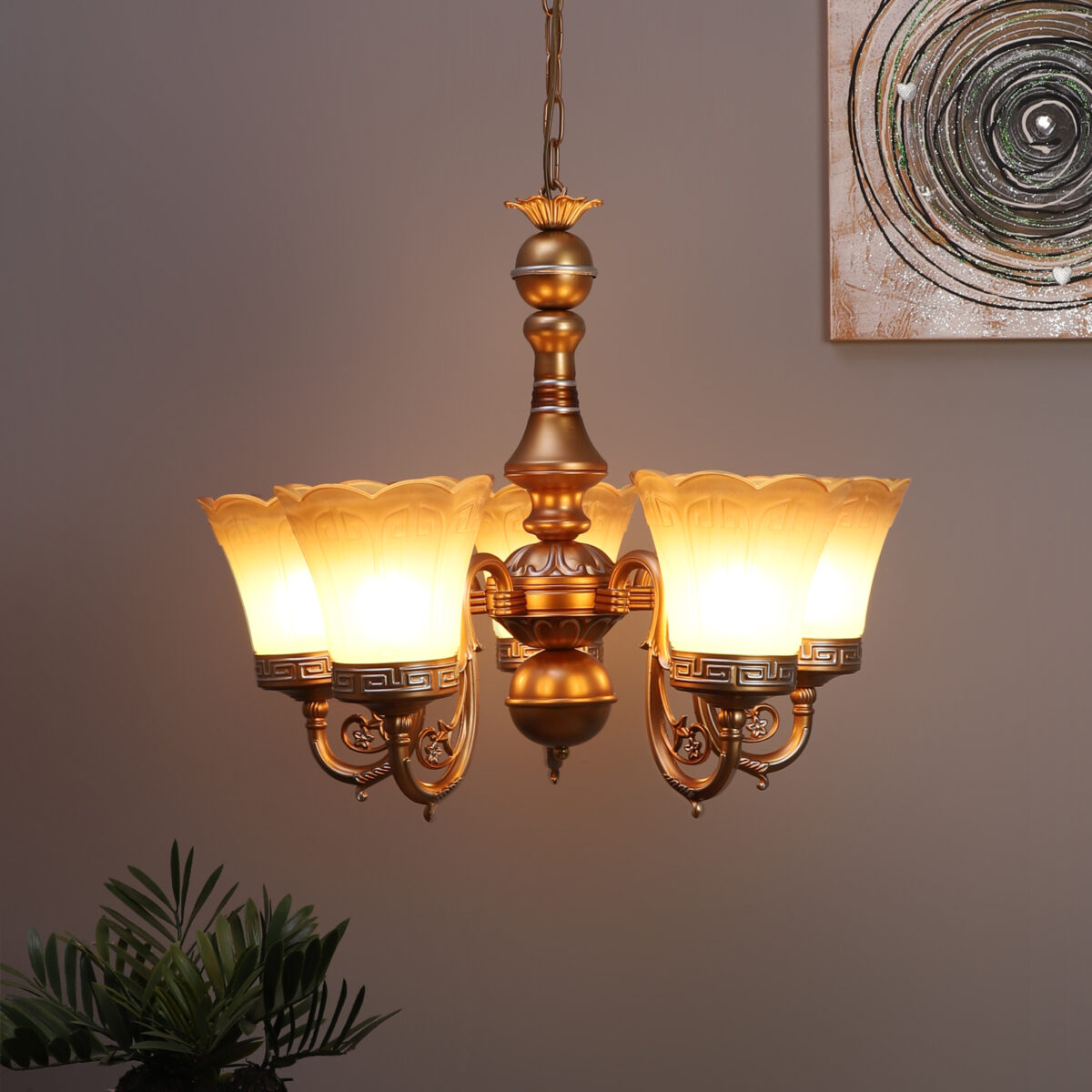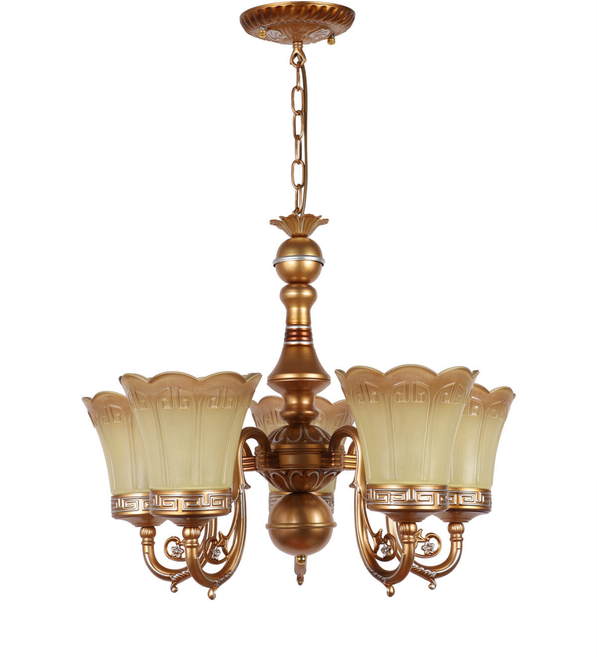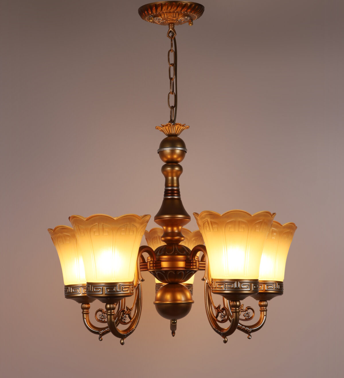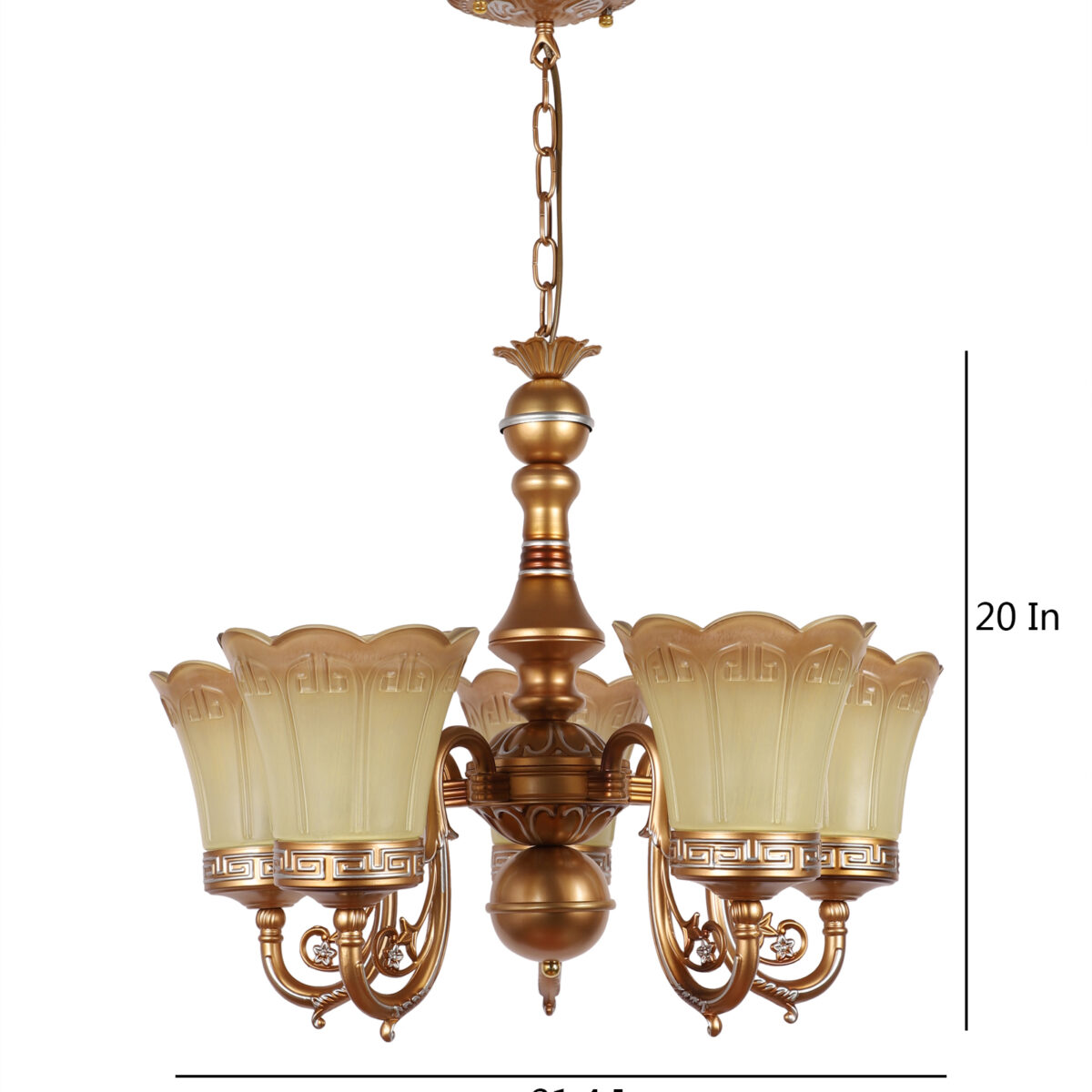 Dull gold finish, flower shaped yellowish brown glass having a self textured design mounted on a designer frame made of mild steel having five lights. This is a hanging type chandelier in which the base plate is fixed to the ceiling with the help of straight clamp and screws. The suspension can be adjusted at time of installation to the desired height. It is maintenance free. It is easy to remove glass and wash them. Comes with an E27 holder, only the change of lamp is required, which is available locally everywhere. Application includes both residential and commercial premises wherever it matches with your interiors. Matching wall light code CW430-1. Also available in bIg size having 6+3 lights with code CH430-9. This along with its variants are the best selling products in our catalogue. LAMP NOT INCLUDED.