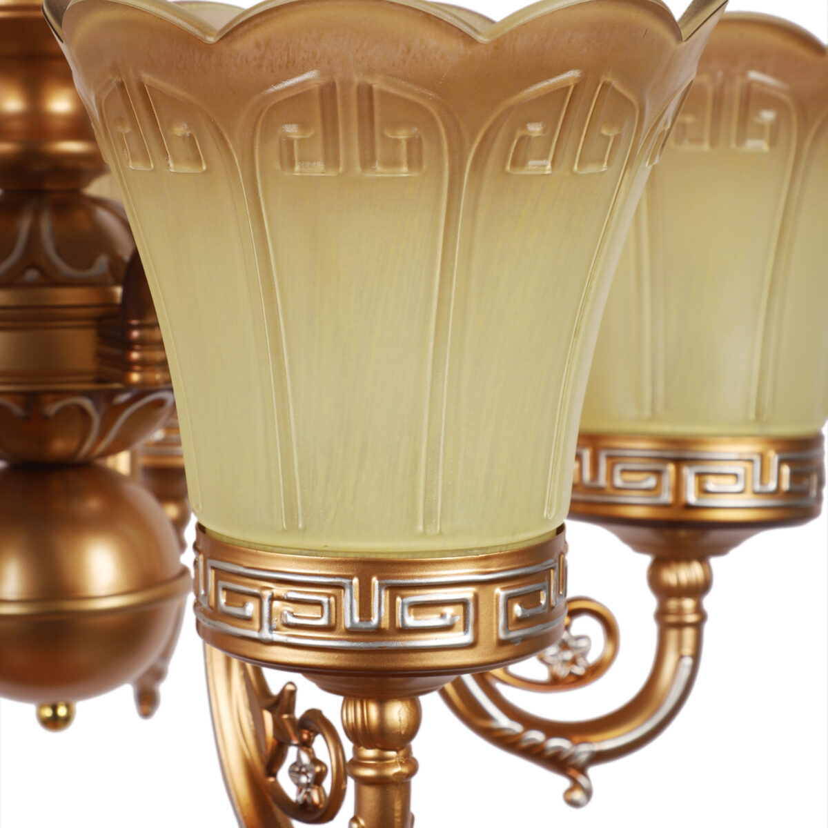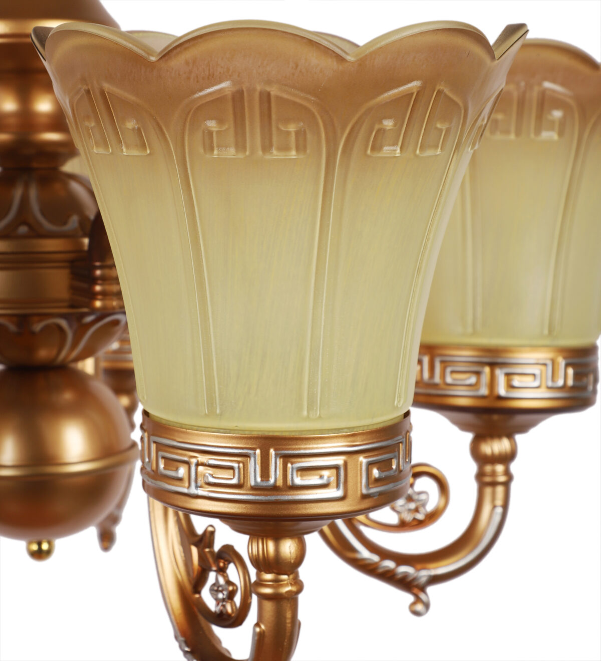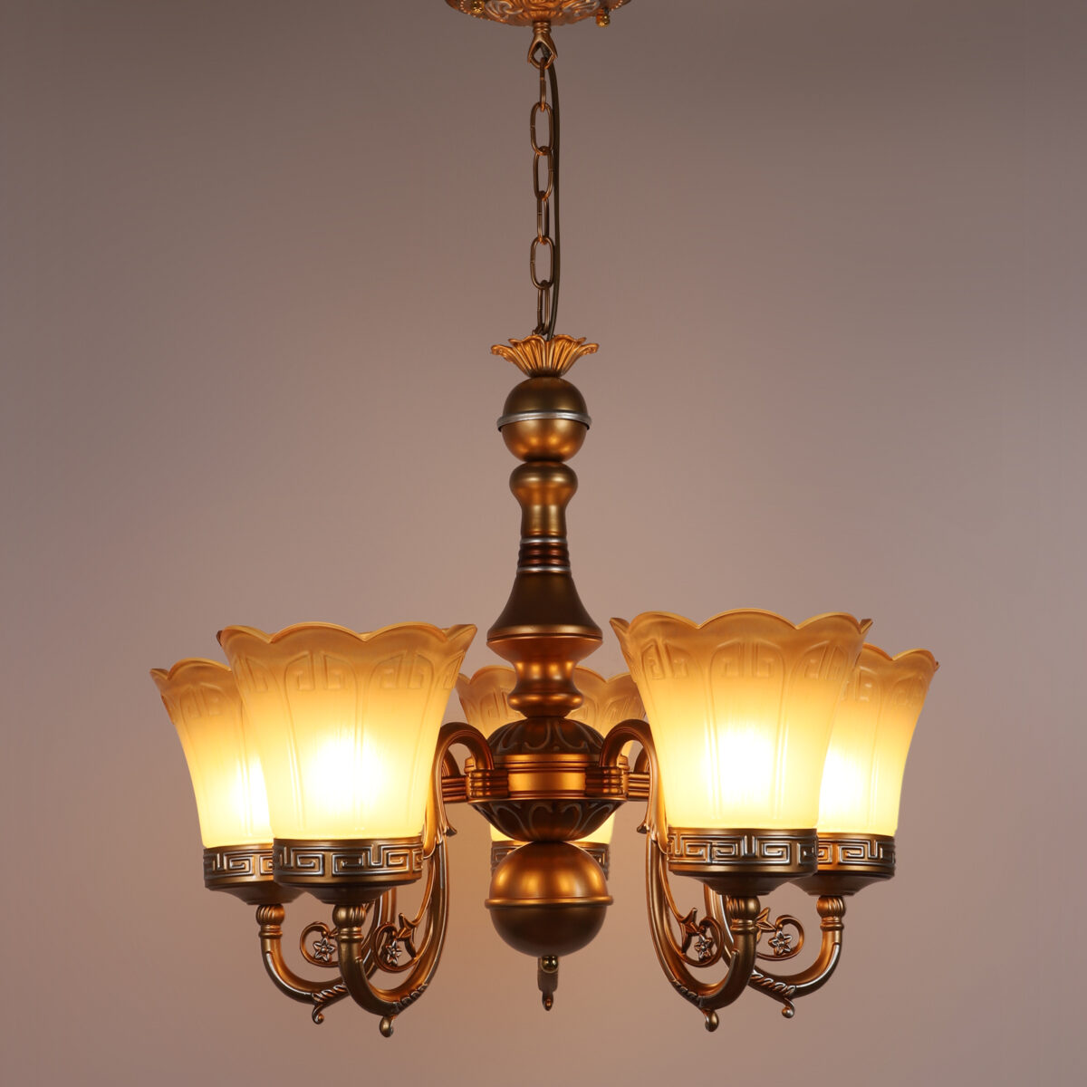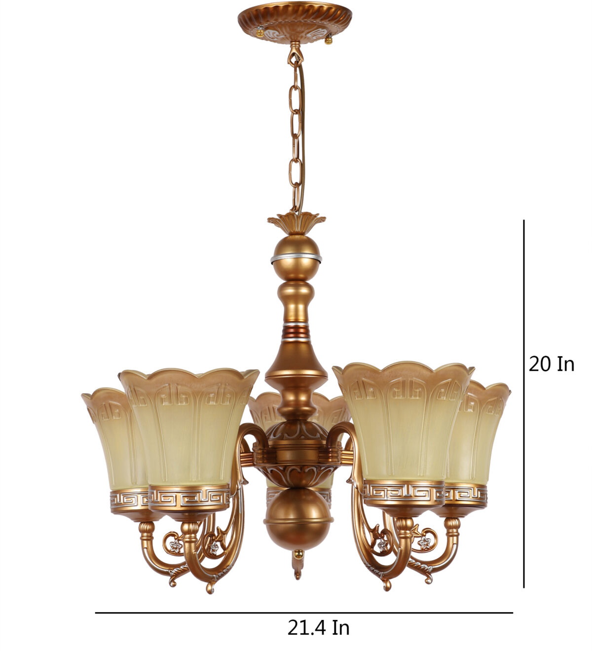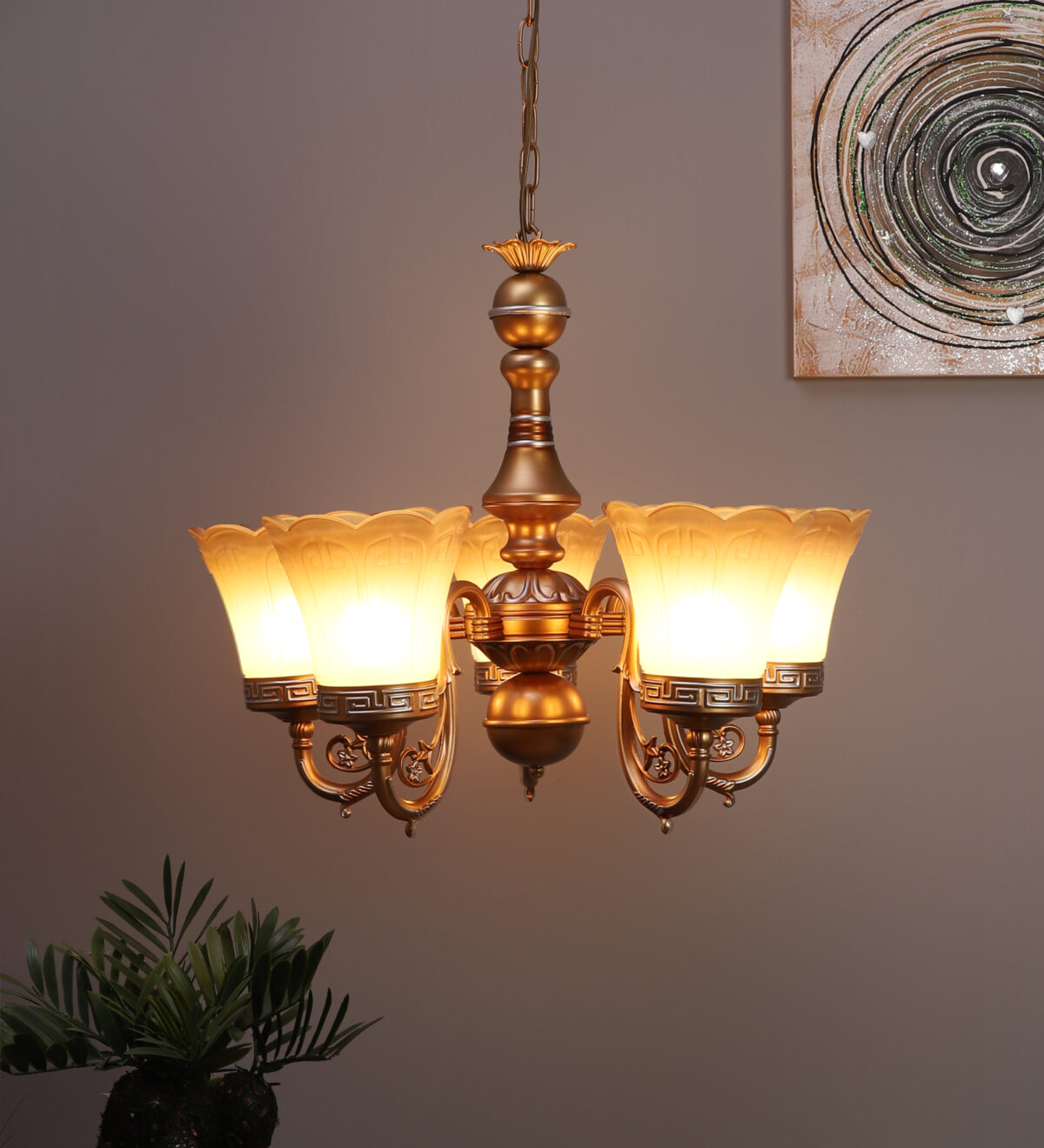 Dull gold finish, flower shaped yellowish brown glass having a self textured design mounted on a designer frame made of mild steel having five lights. This is a hanging type chandelier in which the base plate is fixed to the ceiling with the help of straight clamp and screws. The suspension can be adjusted at time of installation to the desired height. It is maintenance free. It is easy to remove glass and wash them. Comes with an E27 holder, only the change of lamp is required, which is available locally everywhere. Application includes both residential and commercial premises wherever it matches with your interiors. Matching wall light code CW430-1. Also available in bIg size having 6+3 lights with code CH430-9. This along with its variants are the best selling products in our catalogue. LAMP NOT INCLUDED.