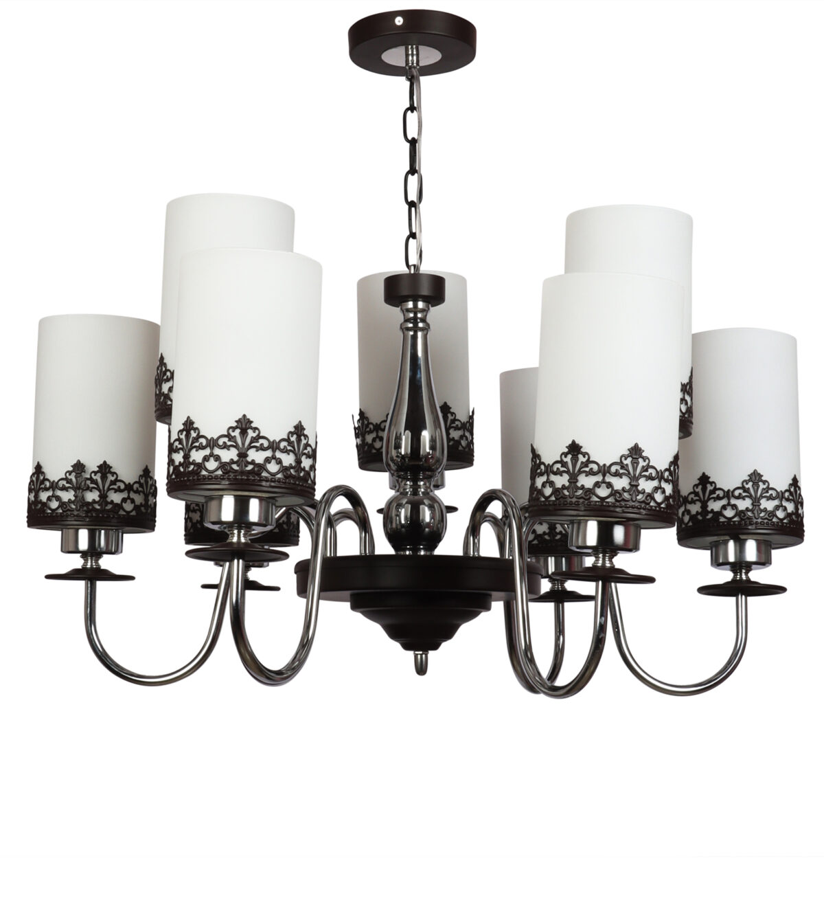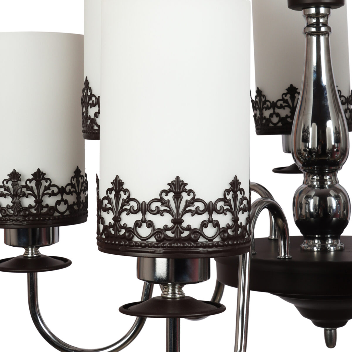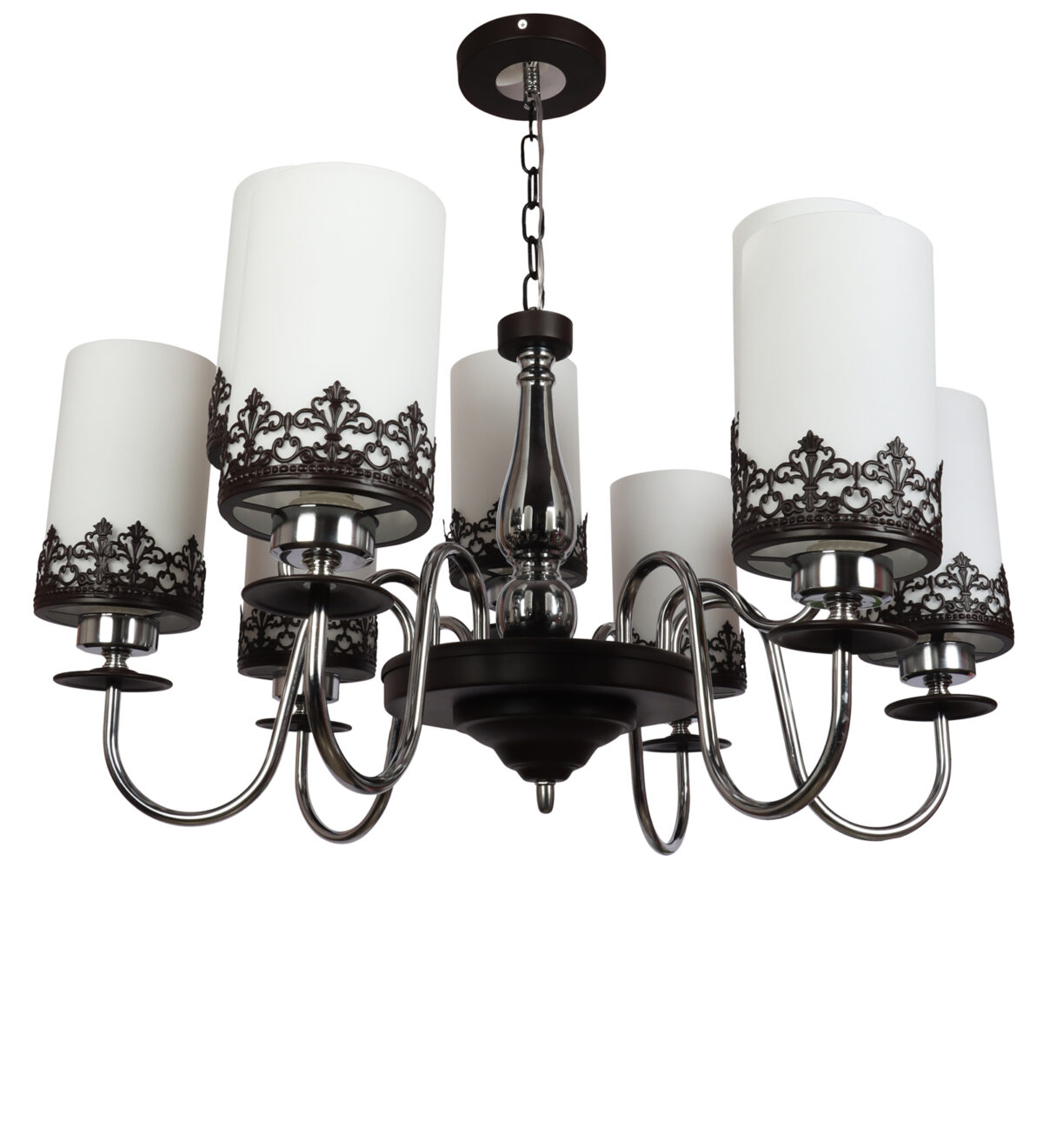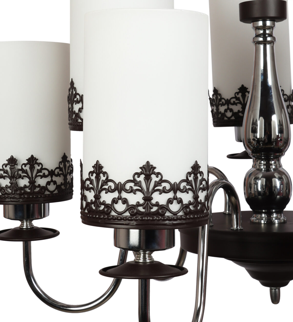 Dark brown (wood) finish, round culinderical white glass mounted on a designer frame made of mild steel having six lights. This is a hanging type chandelier in which the base cap is fixed to the ceiling with the help of straight clamp and screws. The suspension can be adjusted at time of installation to the desired height. It is maintenance free, it is easy to remove glass and wash them. Comes with an E27 holder, only the change of lamp is required, which is available locally everywhere. Application includes both residential and commercial premises wherever it matches with your interiors. Also available in six lights having code CH462-6. Matching wall light code WL2727, WL2728. Can be customized as per requirement in case of bulk quantities. LAMP NOT INCLUDED.
