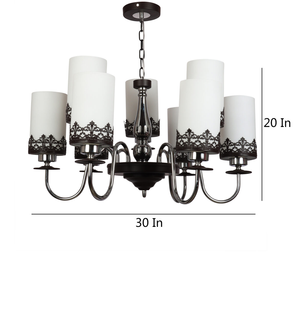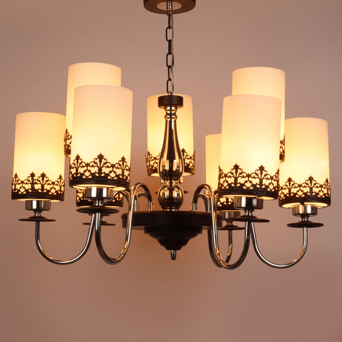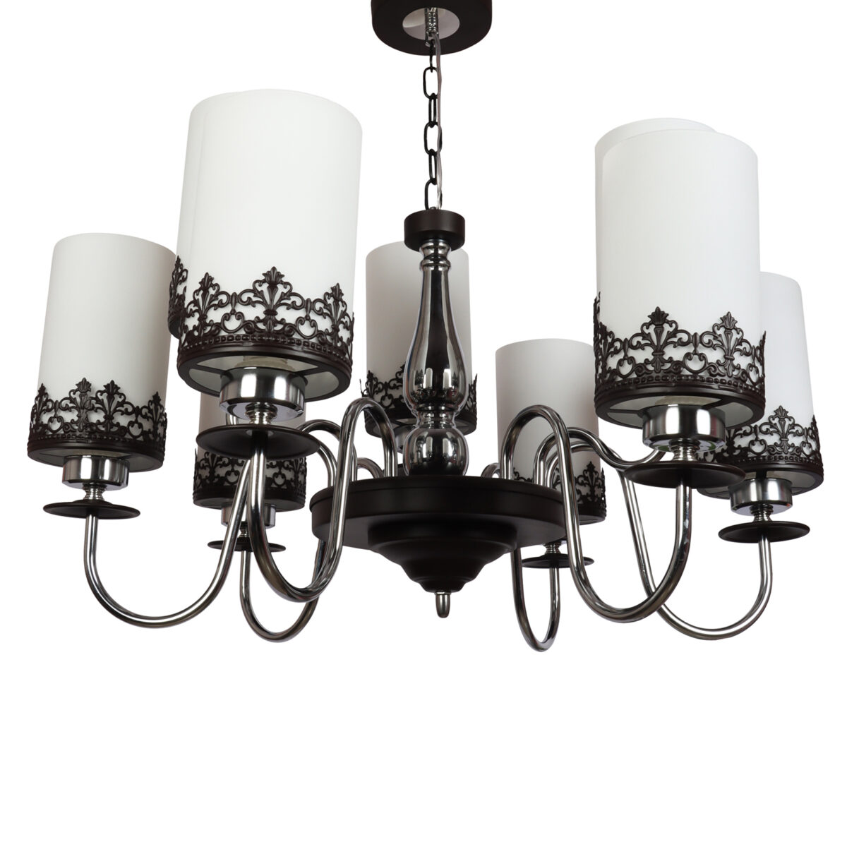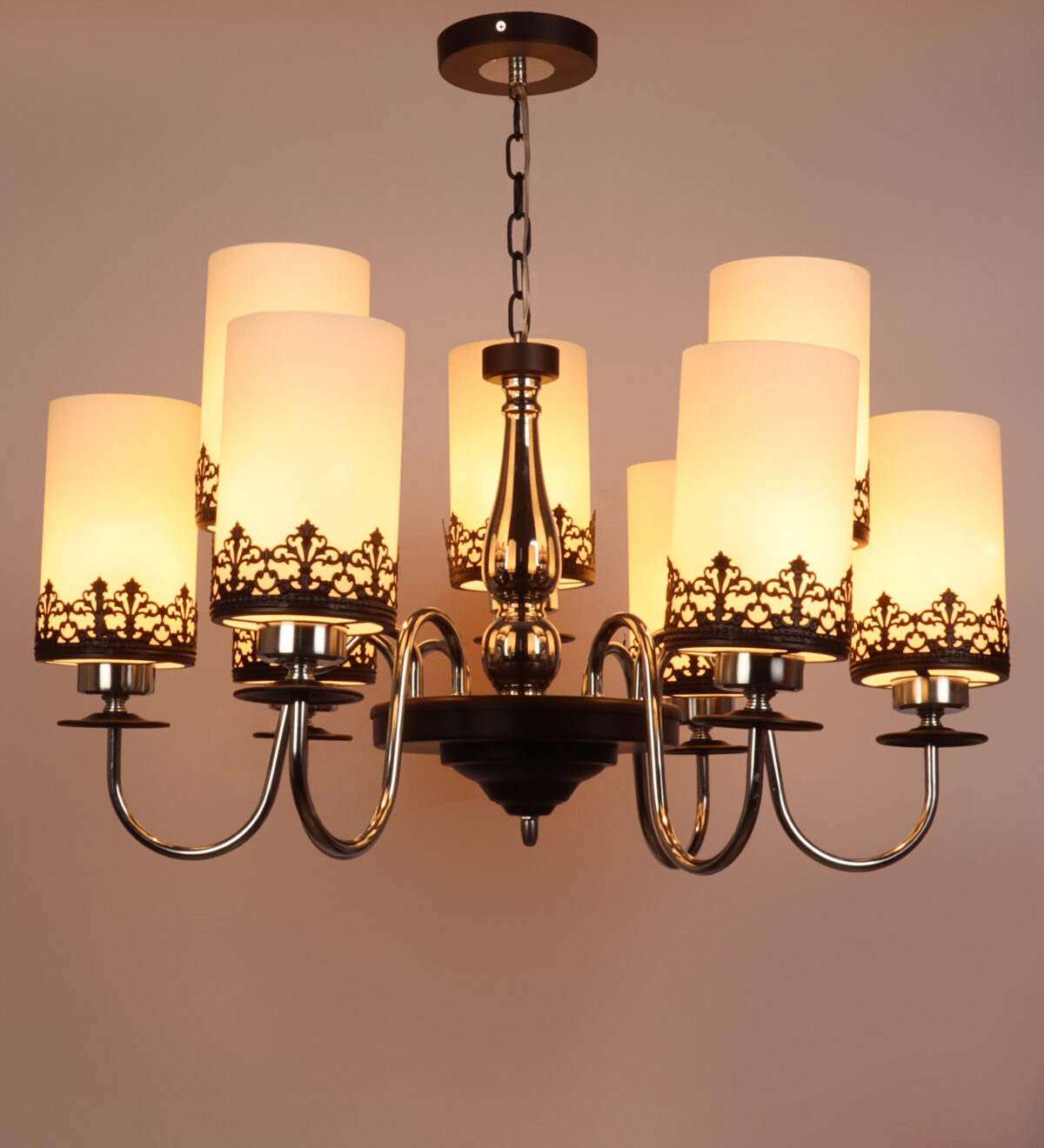 Dark brown (wood) finish, round culinderical white glass mounted on a designer frame made of mild steel having six lights. This is a hanging type chandelier in which the base cap is fixed to the ceiling with the help of straight clamp and screws. The suspension can be adjusted at time of installation to the desired height. It is maintenance free, it is easy to remove glass and wash them. Comes with an E27 holder, only the change of lamp is required, which is available locally everywhere. Application includes both residential and commercial premises wherever it matches with your interiors. Also available in six lights having code CH462-6. Matching wall light code WL2727, WL2728. Can be customized as per requirement in case of bulk quantities. LAMP NOT INCLUDED.