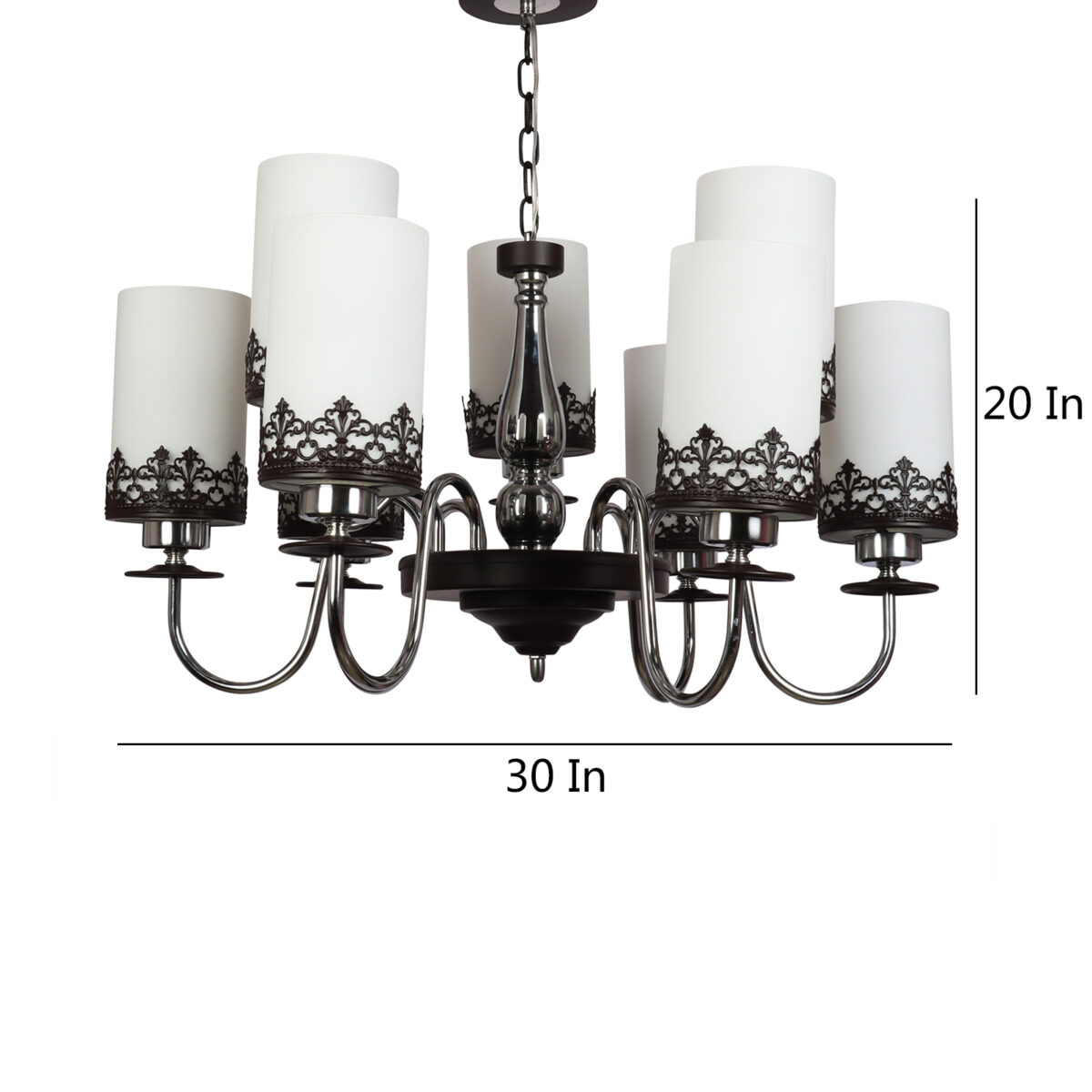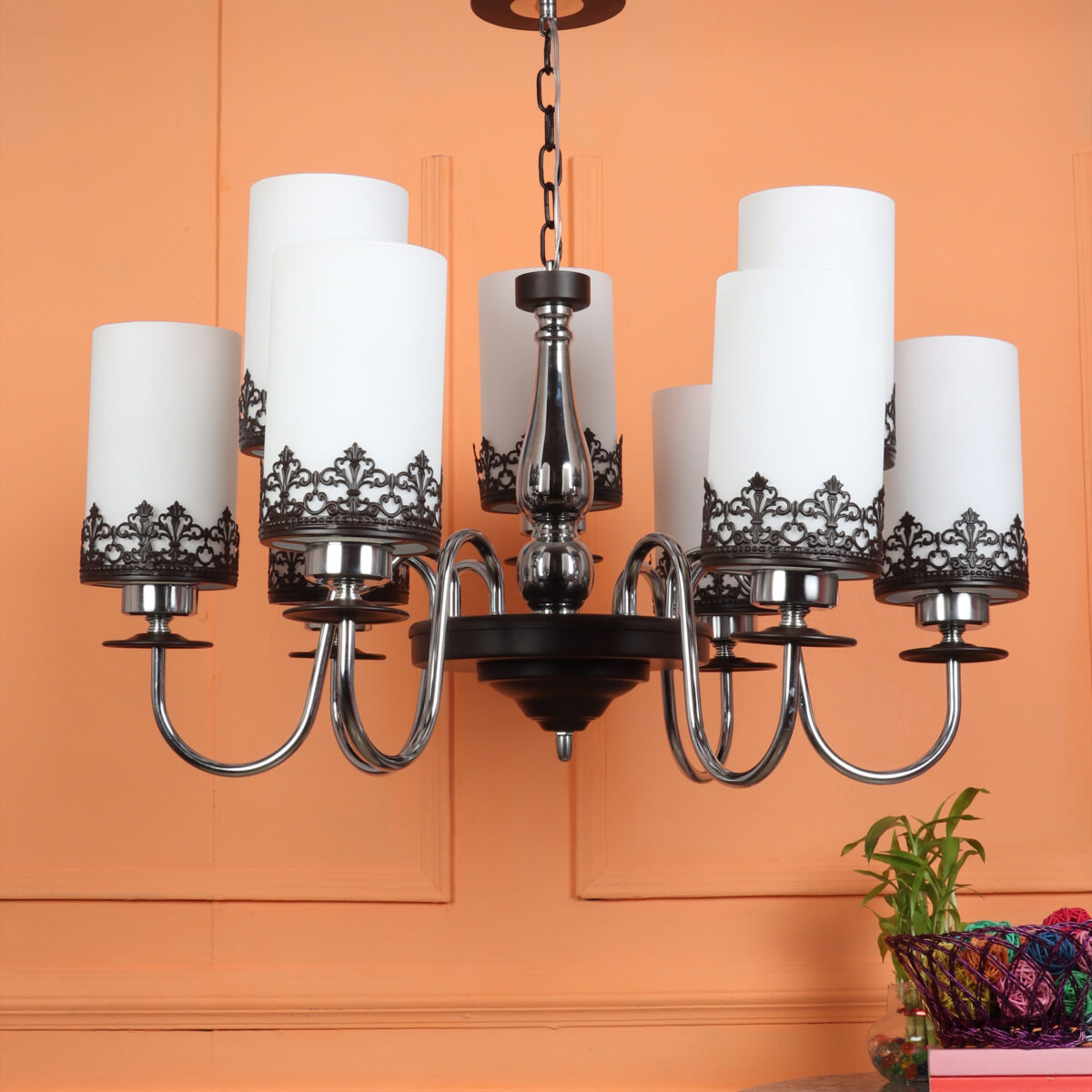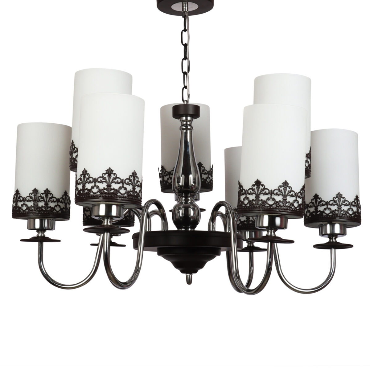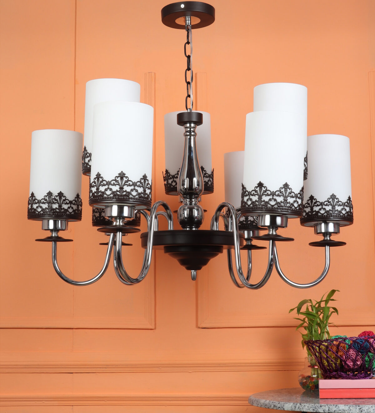 Dark brown (wood) finish, round culinderical white glass mounted on a designer frame made of mild steel having six lights. This is a hanging type chandelier in which the base cap is fixed to the ceiling with the help of straight clamp and screws. The suspension can be adjusted at time of installation to the desired height. It is maintenance free, it is easy to remove glass and wash them. Comes with an E27 holder, only the change of lamp is required, which is available locally everywhere. Application includes both residential and commercial premises wherever it matches with your interiors. Also available in six lights having code CH462-6. Matching wall light code WL2727, WL2728. Can be customized as per requirement in case of bulk quantities. LAMP NOT INCLUDED.