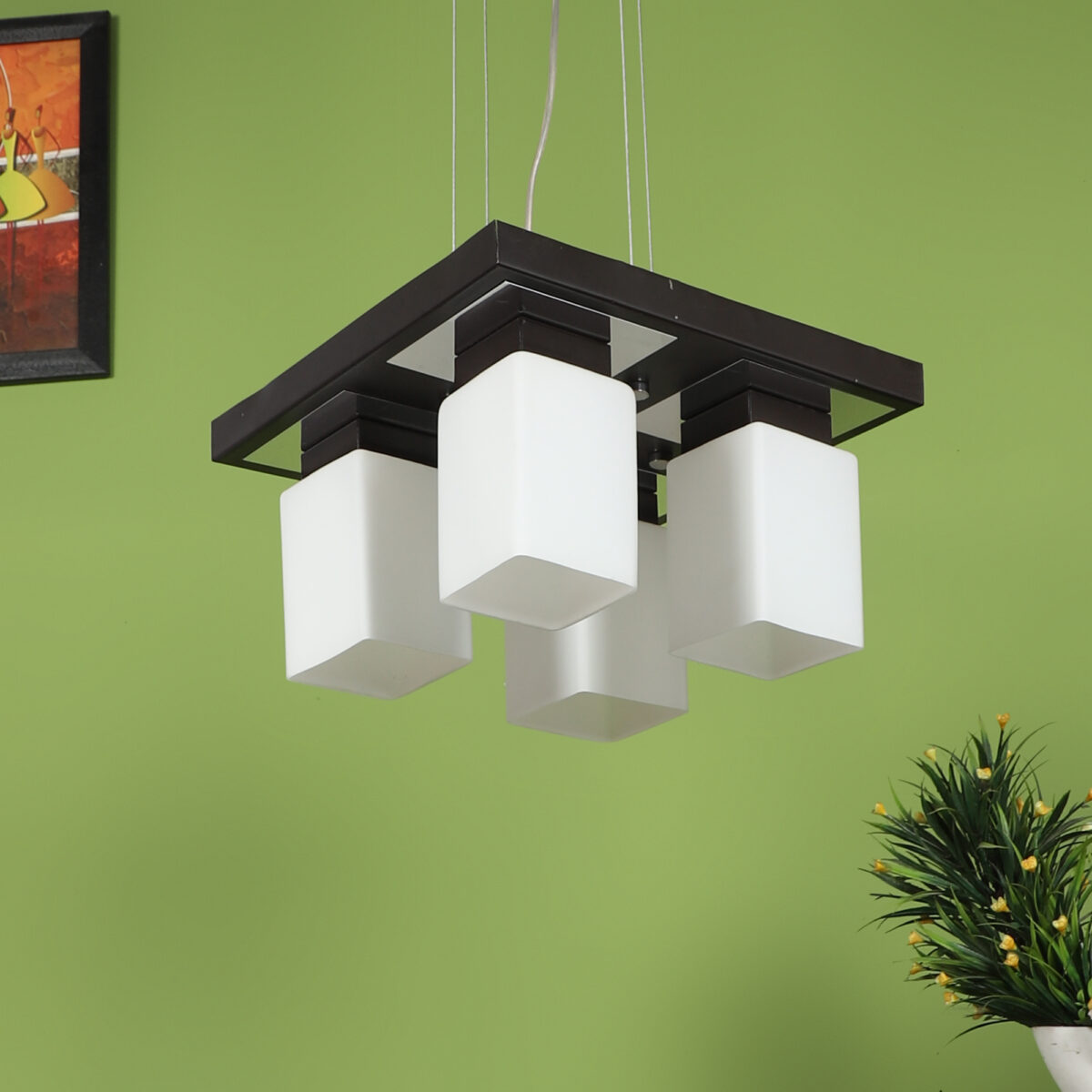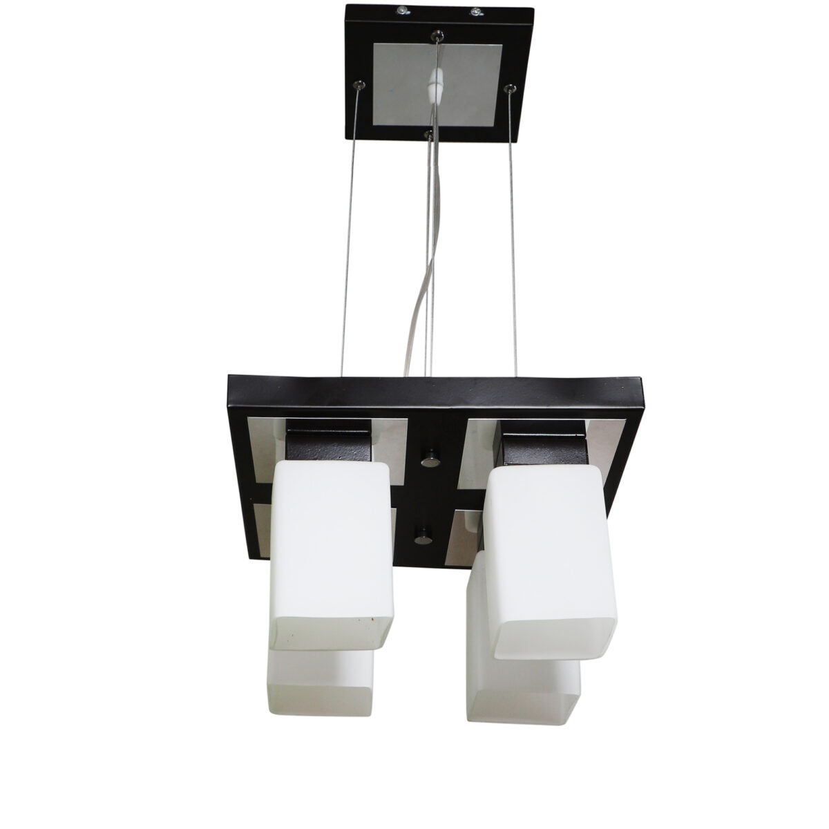 Dark brown(wood – chrome) finish, square long glass mounted on a mild steel plate having four lamps made of mild steel and glass. It is one of the regular design which is never out of trend and is among one of the best sellers. The suspension can be adjusted at time of installation to the desired height. It is maintenance free, easy to remove glass and wash them, comes with an E27 holder, only the change of lamp is required, which is available locally everywhere. Application includes both residential and commercial premises wherever it matches with your interiors. Other variations (color and size) in hanging light – HL3678, HL3679, HL3652. Related chandeliers – CH188, CH189, CH172, CH173. Matching wall light code -WL1775, WL1776. Lamp not included.