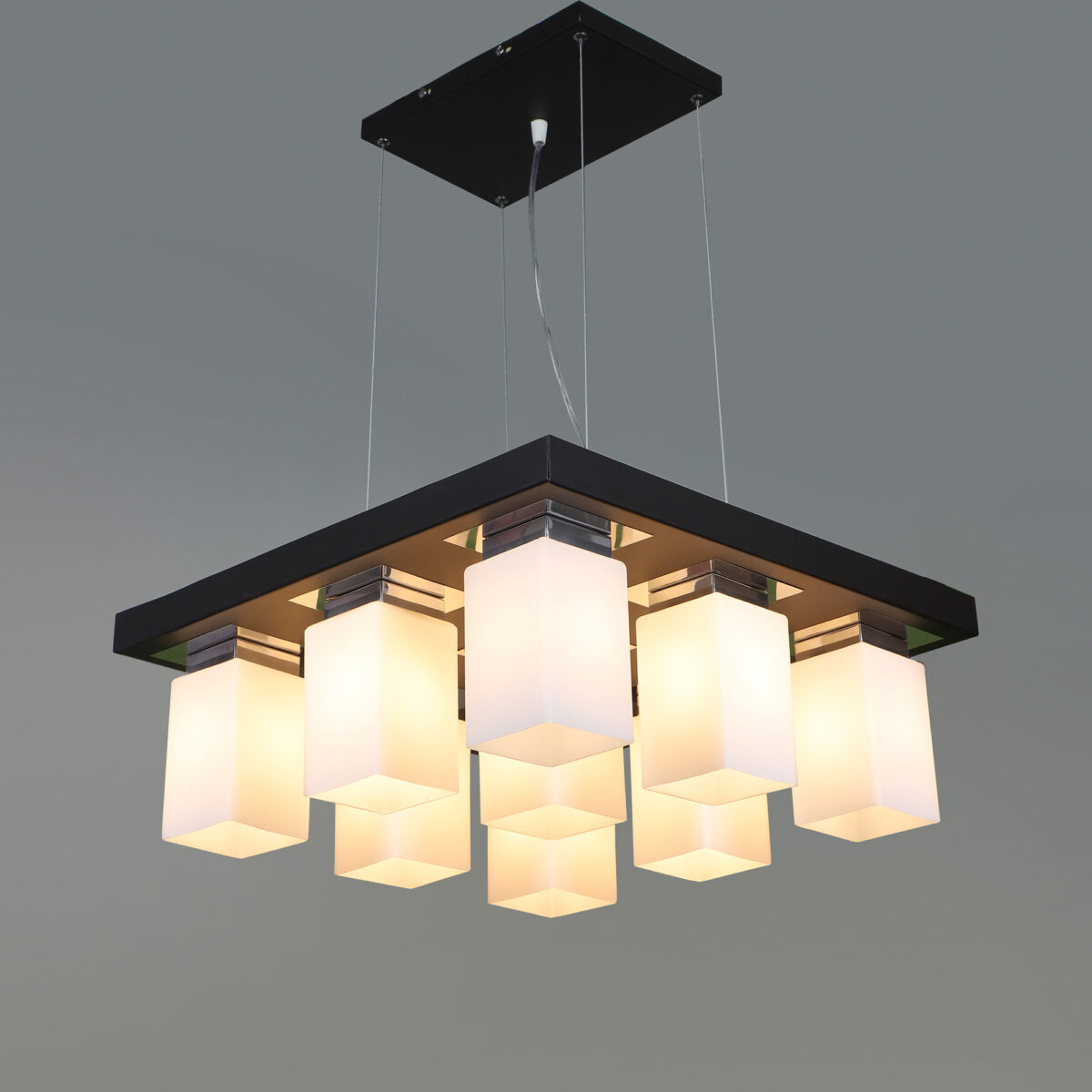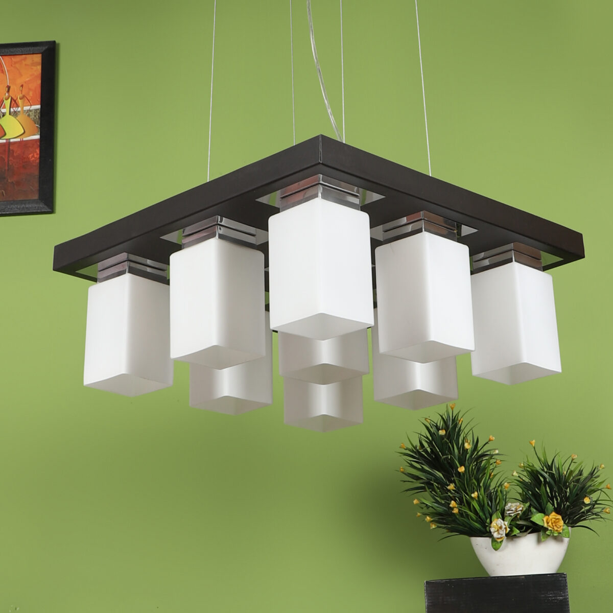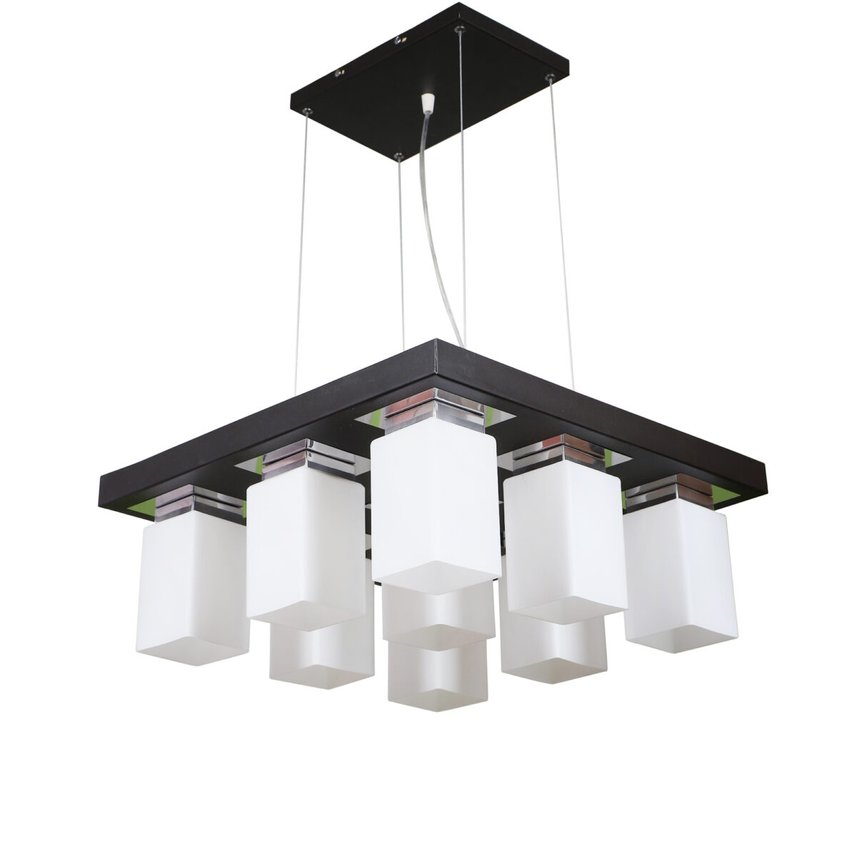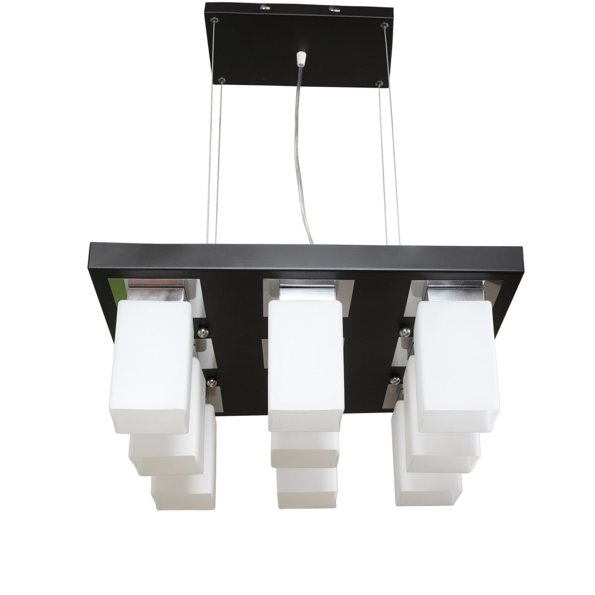 Dark brown(wood – chrome) finish, square long glass mounted on a mild steel plate having nine lamps made of mild steel and glass. It is one of the regular design which is never out of trend and is among one of the best sellers. The suspension can be adjusted at time of installation to the desired height. It is maintenance free, easy to remove glass and wash them, comes with an E27 holder, only the change of lamp is required, which is available locally everywhere. Application includes both residential and commercial premises wherever it matches with your interiors. Other variations (color and size) in hanging light – HL3678, HL3679, HL3651. Related chandeliers – CH188, CH189, CH172, CH173. Matching wall light code -WL1775, WL1776. Lamp not included.