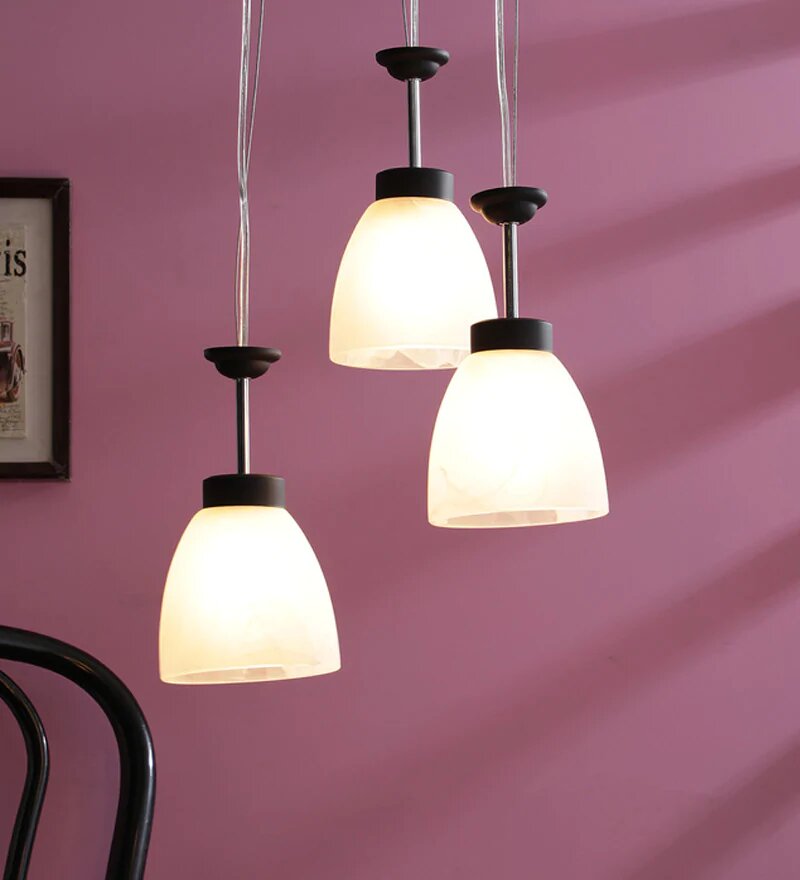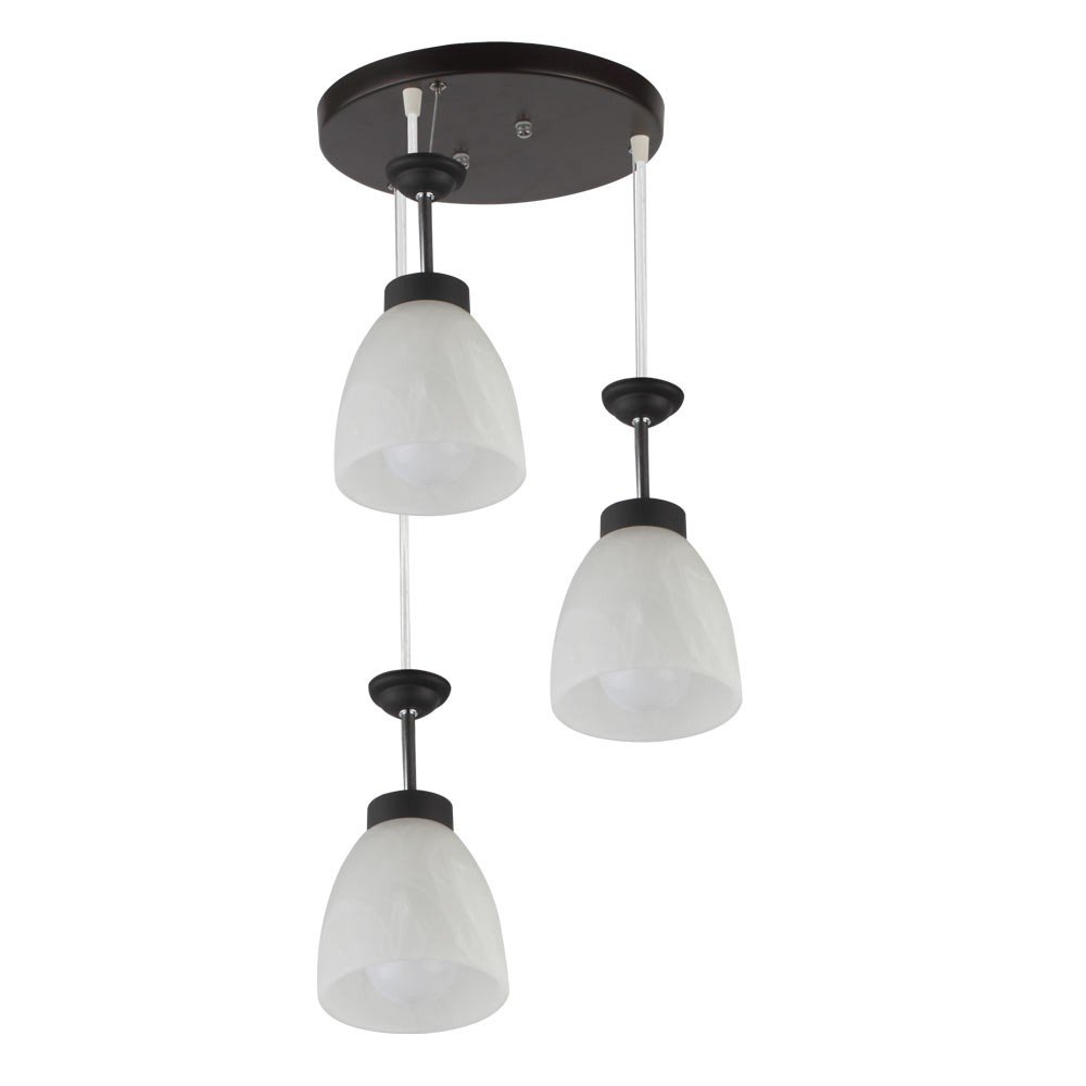 Dark brown (wood) finish, bell shaped glass cluster hanging light having three lamps made of mild steel and glass. The glass is having a nice self design. The suspension can be adjusted at time of installation to the desired height. It is maintenance free, easy to remove glass and wash them, comes with an E27 holder, only the change of lamp is required, which is available locally everywhere. Application includes both residential and commercial premises wherever it matches with your interiors. Also available in single lamp option with code HL3931-1. Matching wall light code – WL2081, WL2082. Matching Chandelier code – CH318. Can be customized as per requirement in case of bulk quantities. Lamp not included.
