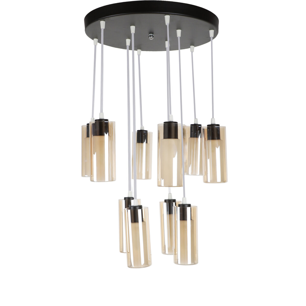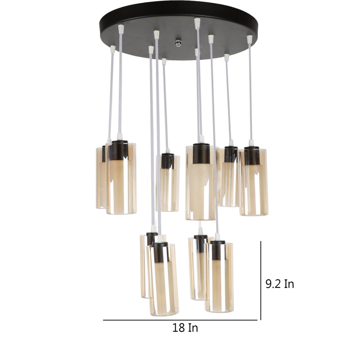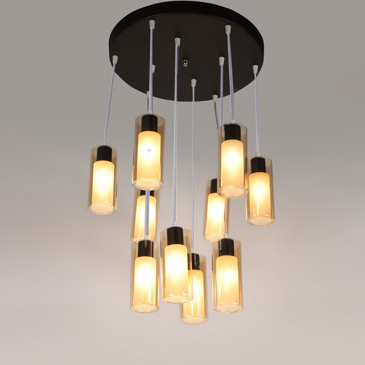Dark brown (wood) finish, round glass in campaign color, cluster hanging light having ten lamps made of mild steel and glass. Each light is having two layers in glass, inner glass is frosted and outer glass is transparent making this light unique. The suspension can be adjusted at time of installation to the desired height. It is maintenance free, easy to remove glass and wash them, comes with an E14 holder, only the change of lamp is required, which is available locally everywhere. Application includes both residential and commercial premises wherever it matches with your interiors. Matching similar hanging codes -HL3980-1, HL3980-3, HL3980-6. Matching chandelier codes – CH353-3, CH353-6, CH353-10. Matching wall light – WL2211, WL2212. All designs available in silver (chrome) also. Can be customized as per requirement in case of bulk quantities. Lamp not included.