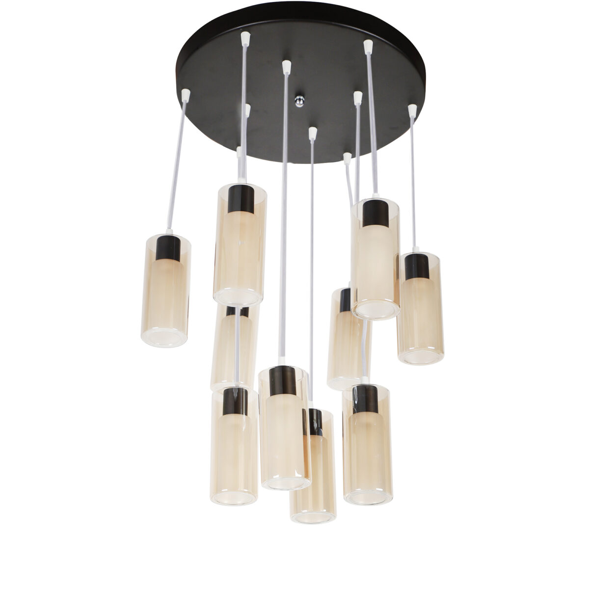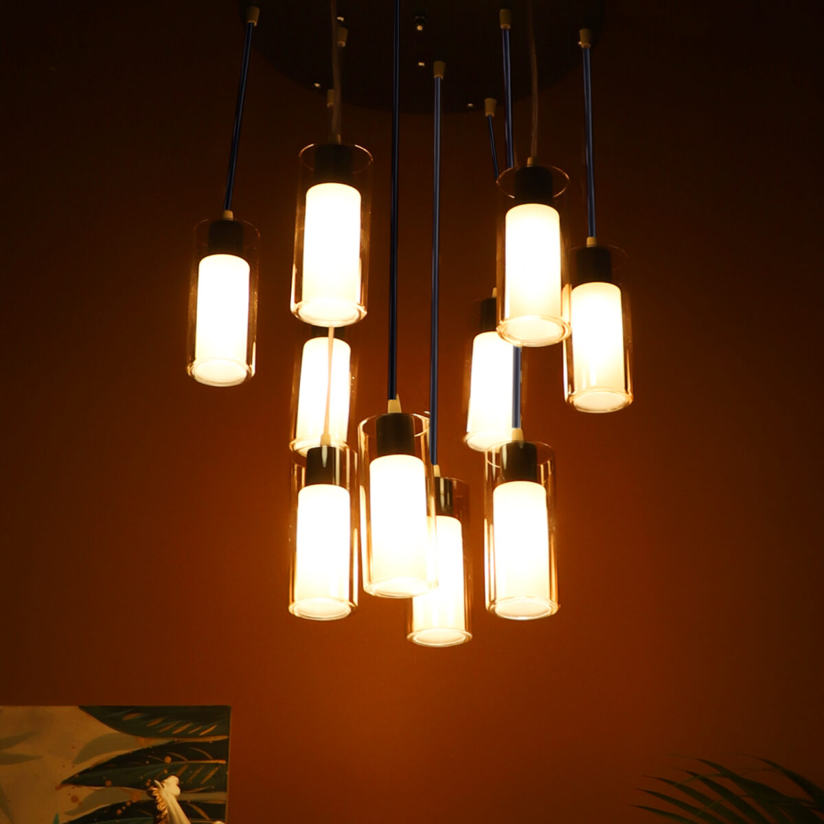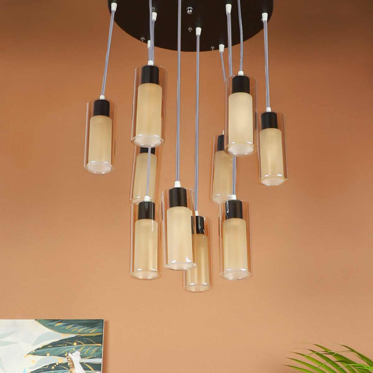 Dark brown (wood) finish, round glass in campaign color, cluster hanging light having ten lamps made of mild steel and glass. Each light is having two layers in glass, inner glass is frosted and outer glass is transparent making this light unique. The suspension can be adjusted at time of installation to the desired height. It is maintenance free, easy to remove glass and wash them, comes with an E14 holder, only the change of lamp is required, which is available locally everywhere. Application includes both residential and commercial premises wherever it matches with your interiors. Matching similar hanging codes -HL3980-1, HL3980-3, HL3980-6. Matching chandelier codes – CH353-3, CH353-6, CH353-10. Matching wall light – WL2211, WL2212. All designs available in silver (chrome) also. Can be customized as per requirement in case of bulk quantities. Lamp not included.