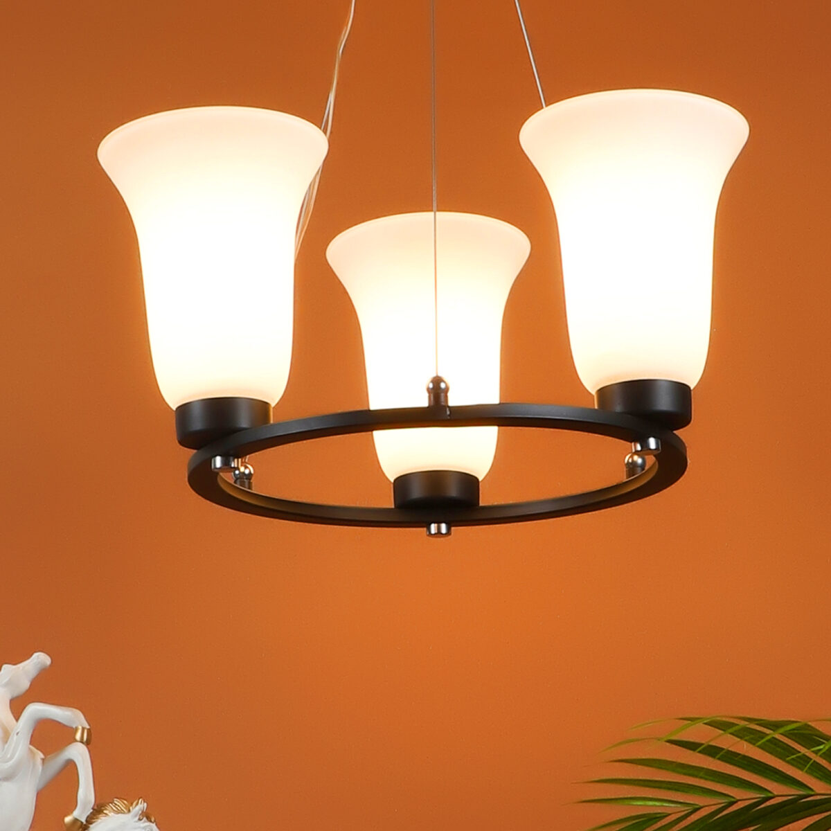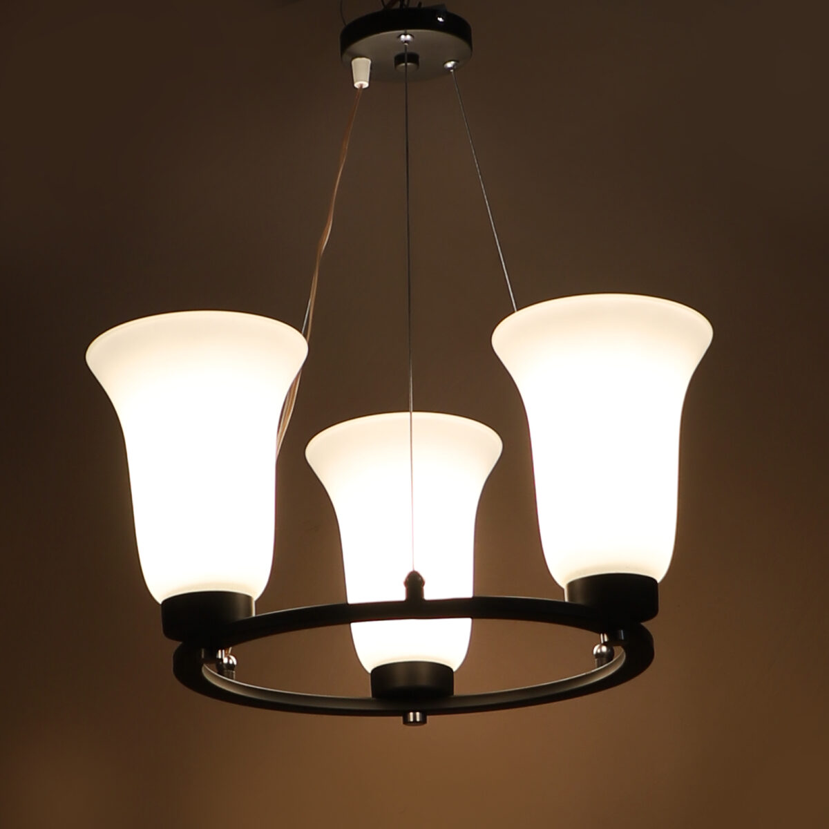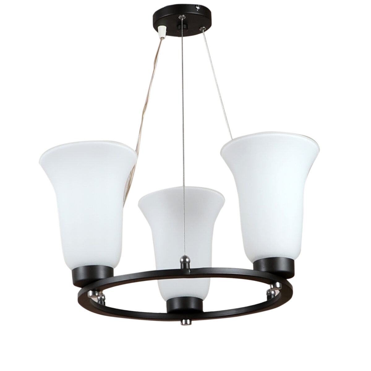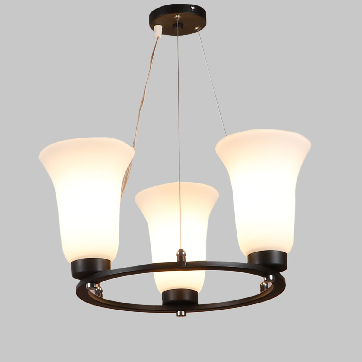 Dark brown ( wood) finish, modern bell shaped long glass mounted on a mild steel round ring having three lamps made of mild steel and glass. The suspension can be adjusted at time of installation to the desired height. It is maintenance free, easy to remove glass and wash them, comes with an E27 holder, only the change of lamp is required, which is available locally everywhere. Application includes both residential and commercial premises wherever it matches with your interiors. Lamp not included.
