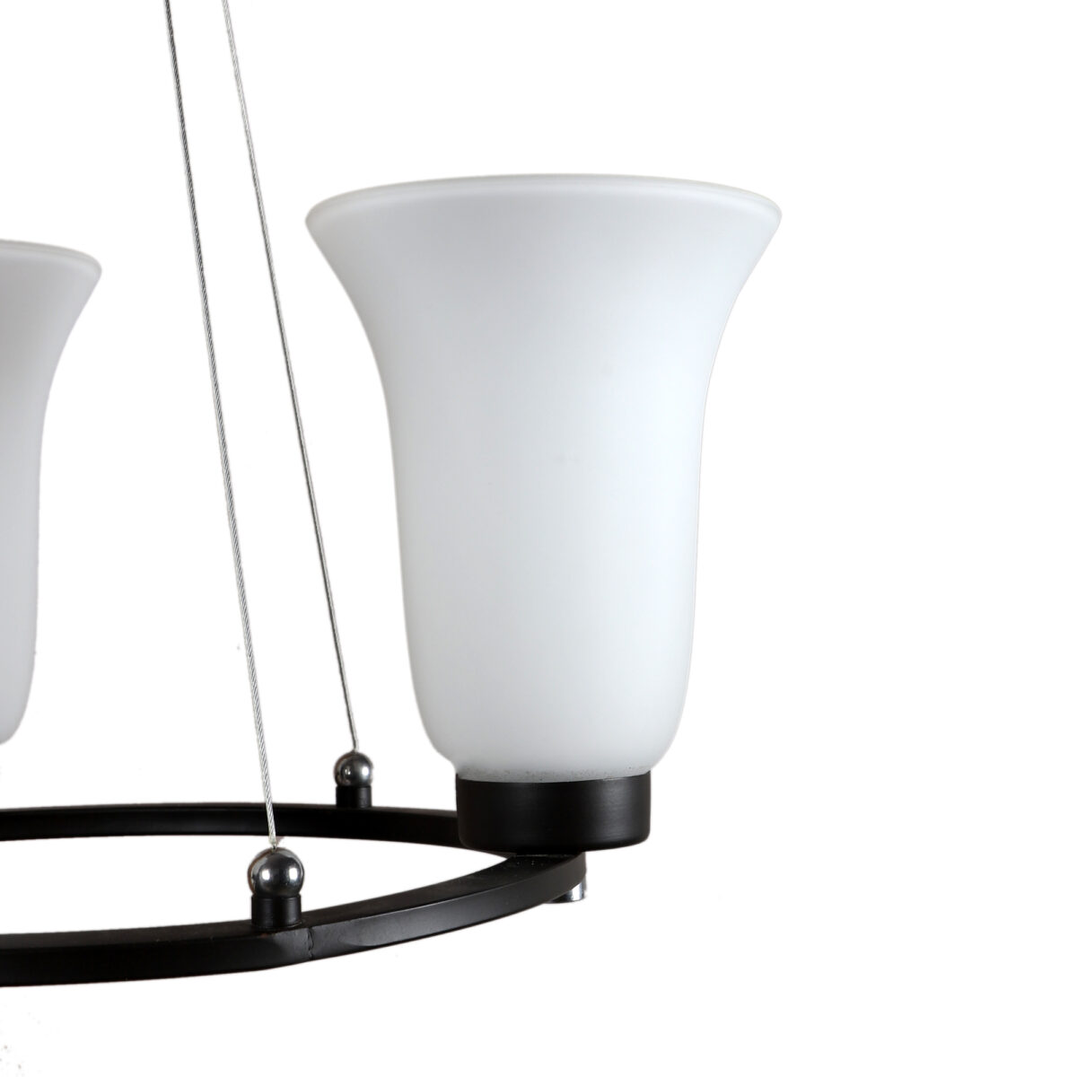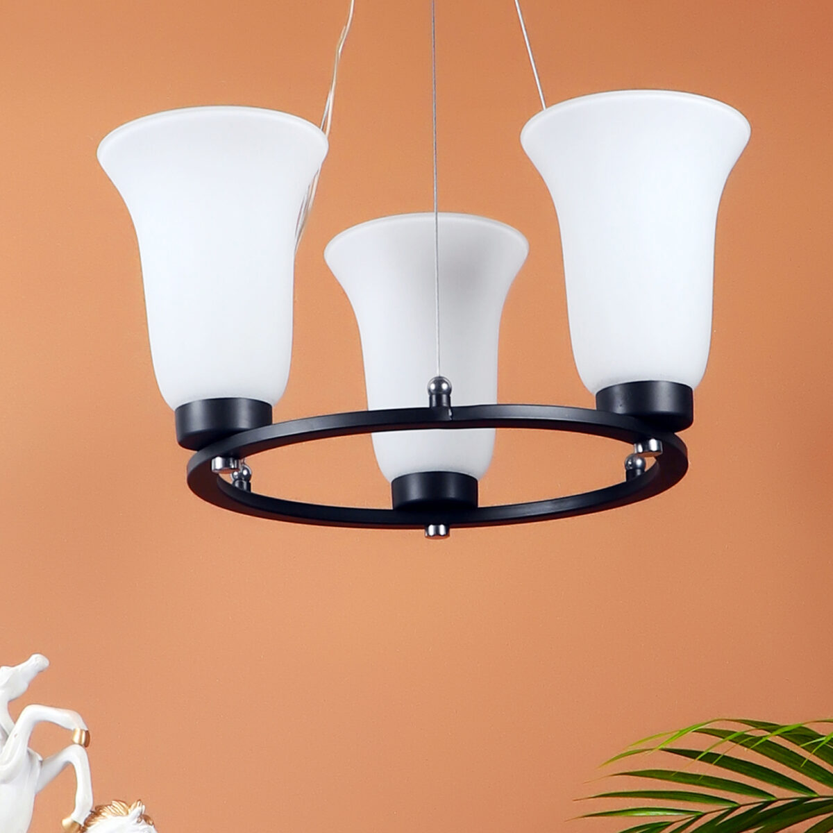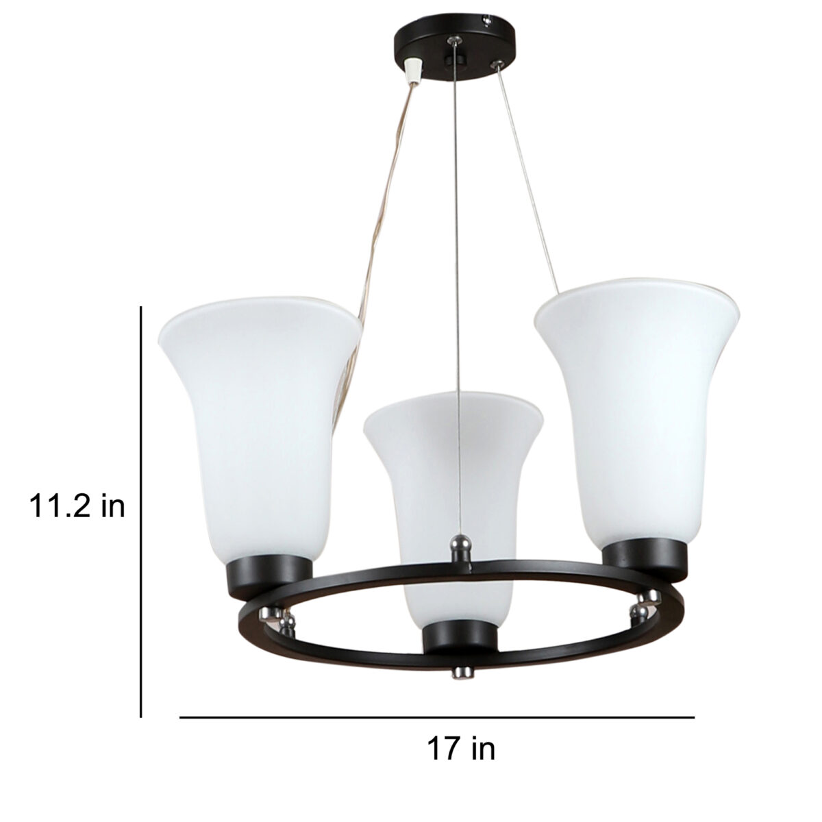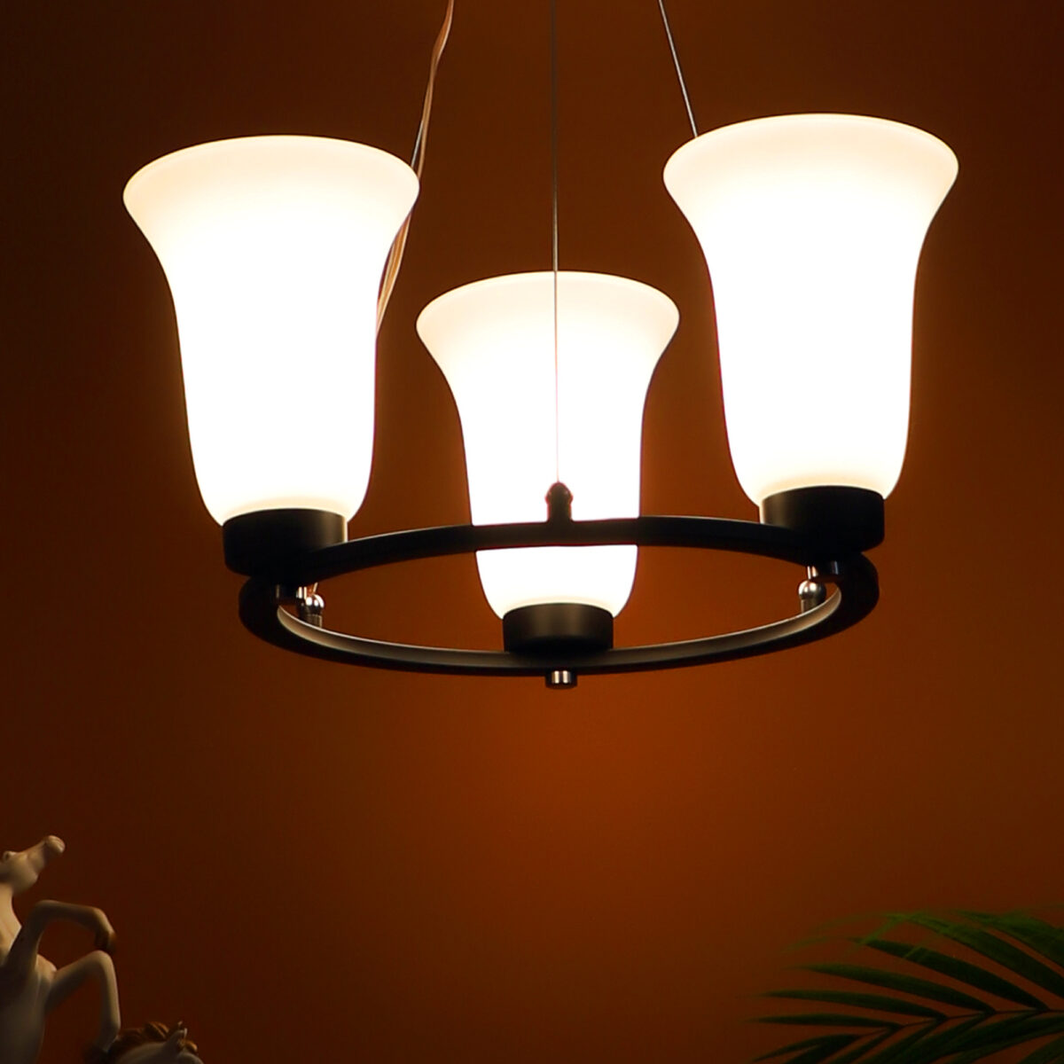 Dark brown ( wood) finish, modern bell shaped long glass mounted on a mild steel round ring having three lamps made of mild steel and glass. The suspension can be adjusted at time of installation to the desired height. It is maintenance free, easy to remove glass and wash them, comes with an E27 holder, only the change of lamp is required, which is available locally everywhere. Application includes both residential and commercial premises wherever it matches with your interiors. Lamp not included.