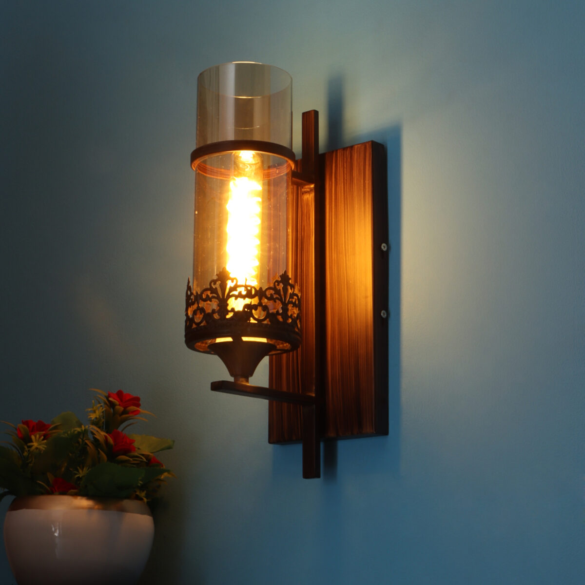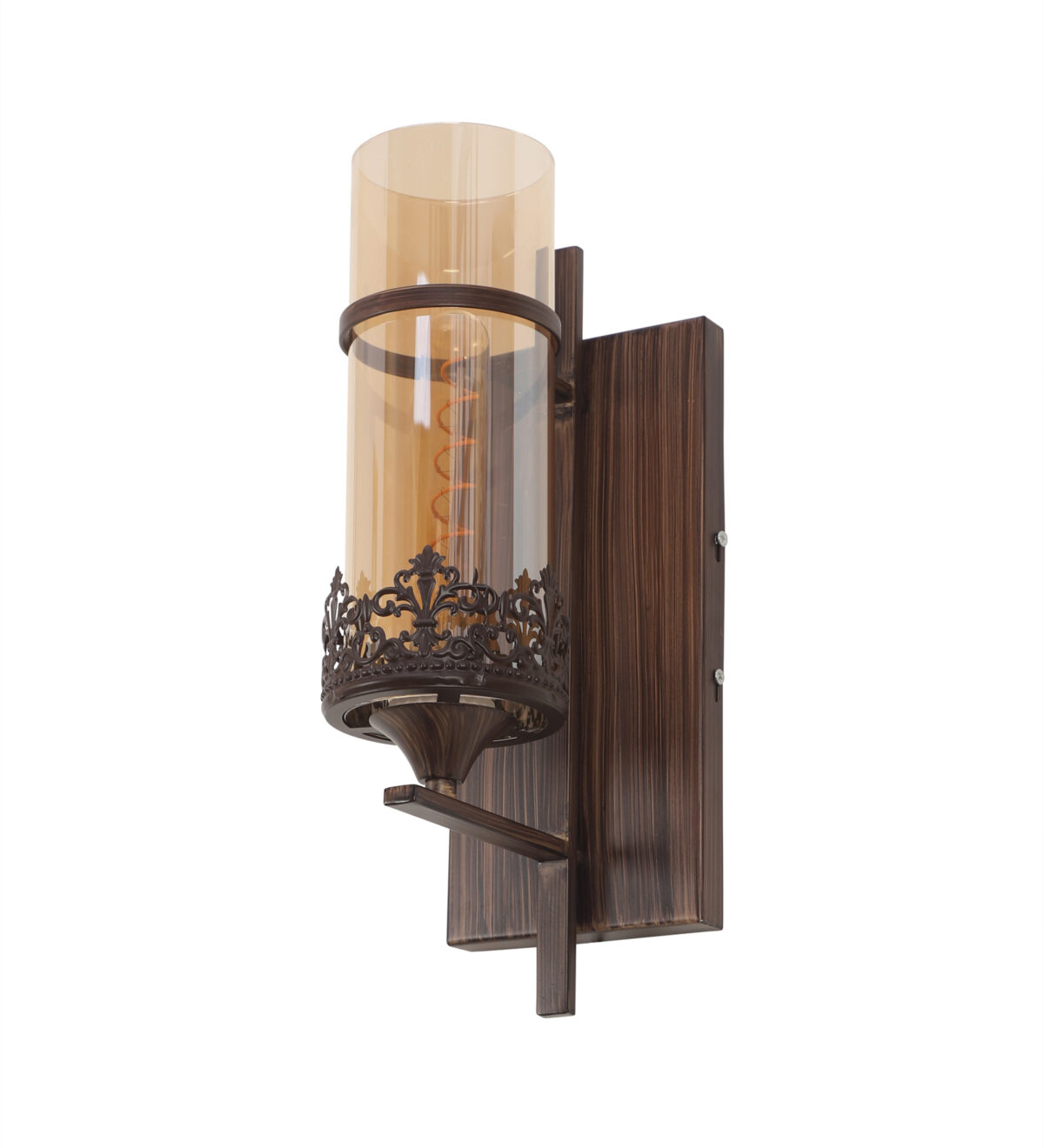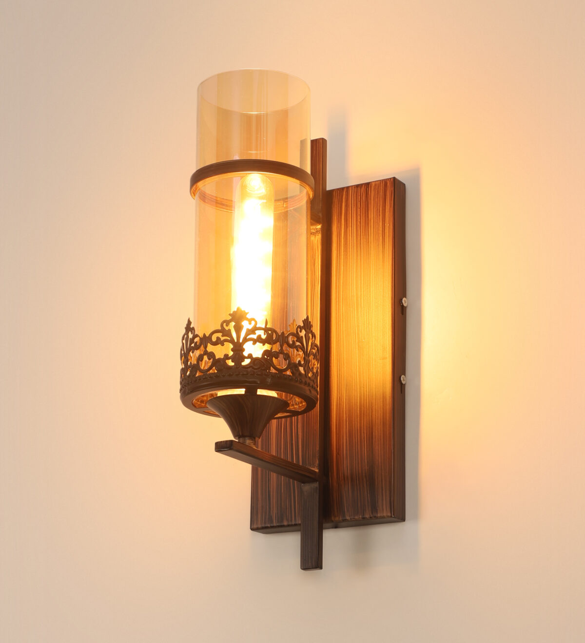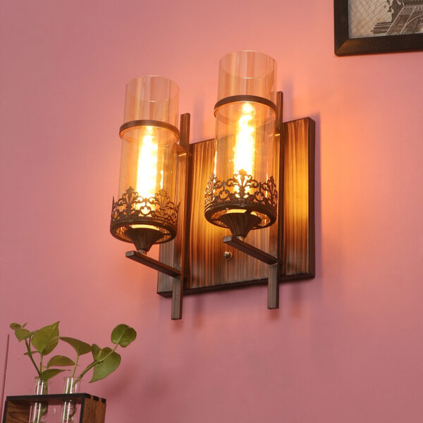 Brown (wood) finish single wall light having round, cylindrical Champaign colored glass mounted on a designer frame made of mild steel . It is maintenance free, it is easy to remove glass and wash it. Comes with an E27 holder, only the change of lamp is required, which is available locally everywhere. Application includes both residential and commercial premises wherever it matches with your interiors. Matching double wall light code – WL2317. Matching hanging light code – HL4083. Matching chandelier code – CH392. Can be customized as per requirement in case of bulk quantities. This along with its variants are the best selling products in our catalogue. Lamp not included.