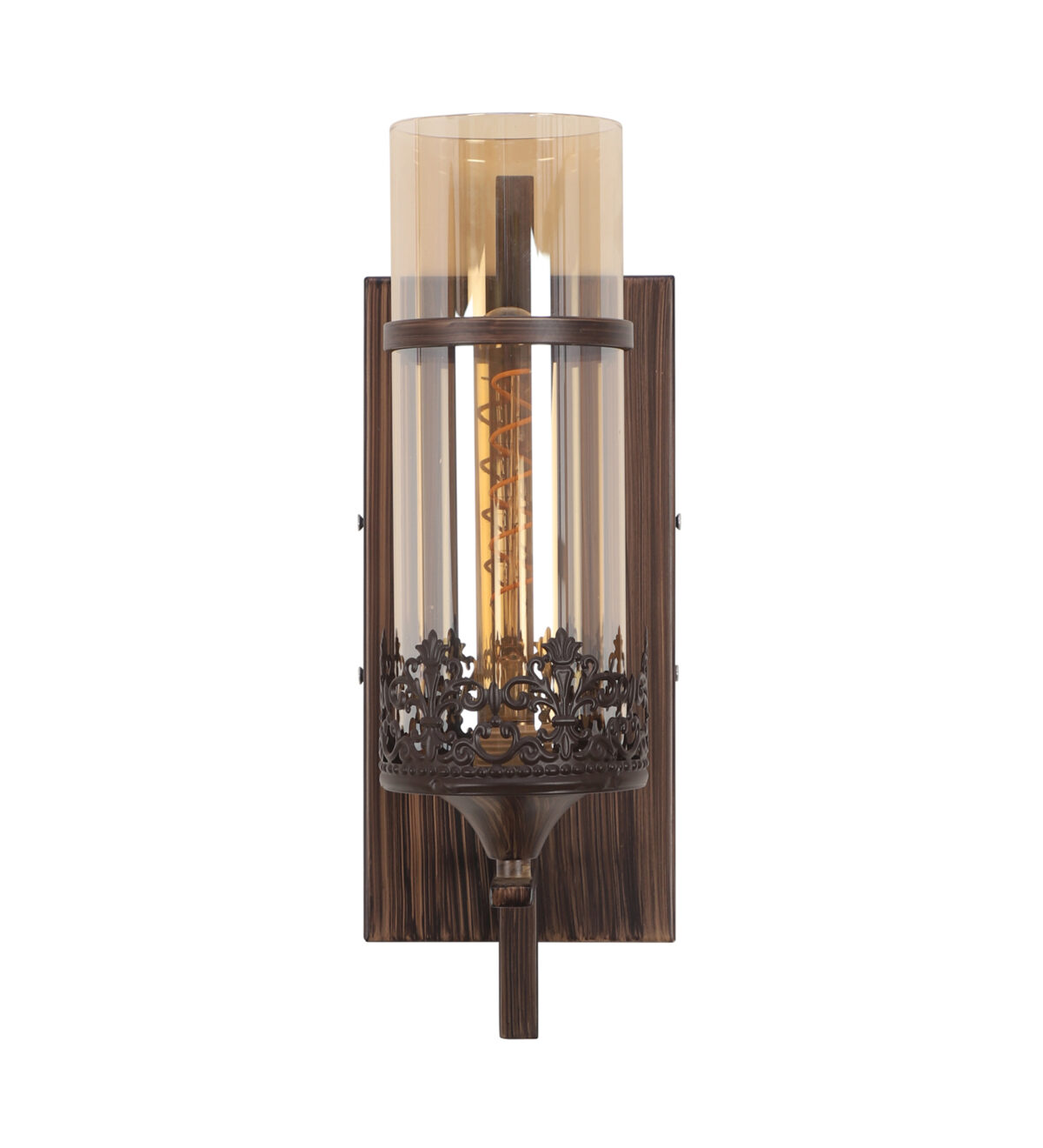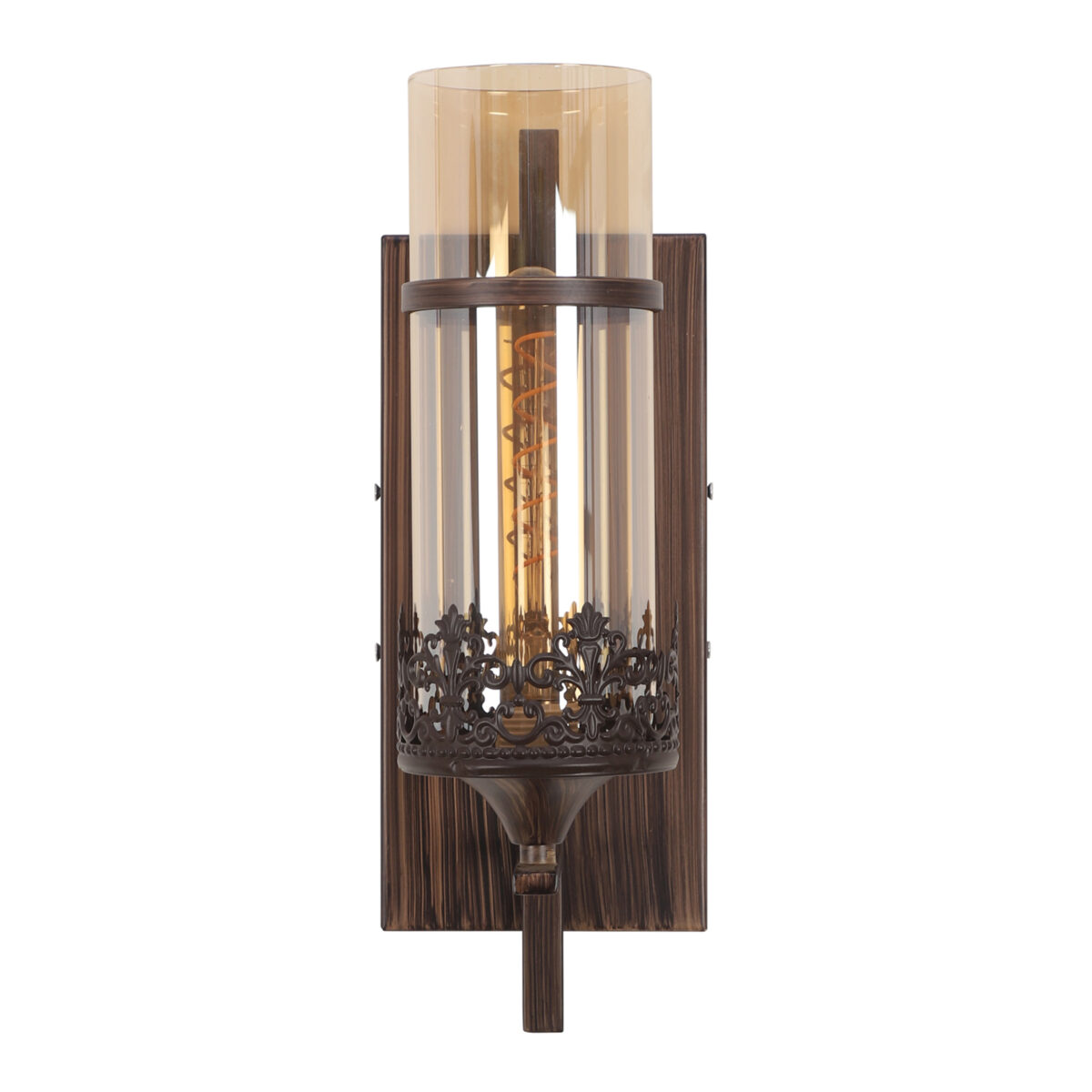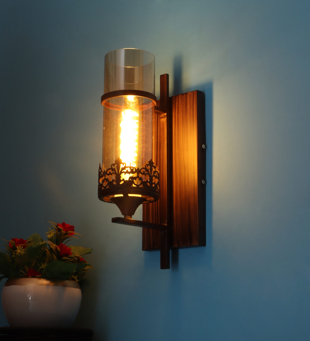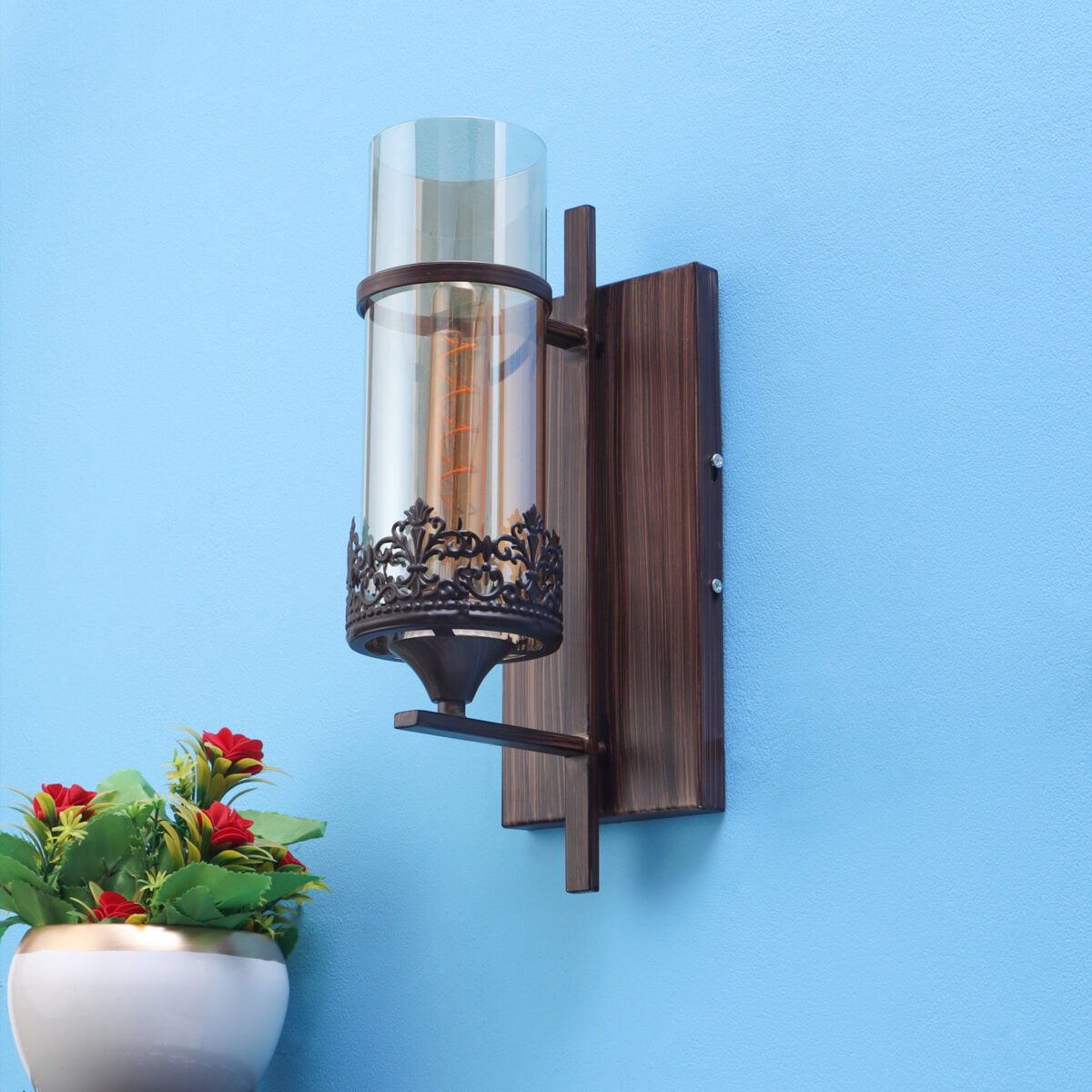 Brown (wood) finish single wall light having round, cylindrical Champaign colored glass mounted on a designer frame made of mild steel . It is maintenance free, it is easy to remove glass and wash it. Comes with an E27 holder, only the change of lamp is required, which is available locally everywhere. Application includes both residential and commercial premises wherever it matches with your interiors. Matching double wall light code – WL2317. Matching hanging light code – HL4083. Matching chandelier code – CH392. Can be customized as per requirement in case of bulk quantities. This along with its variants are the best selling products in our catalogue. Lamp not included.