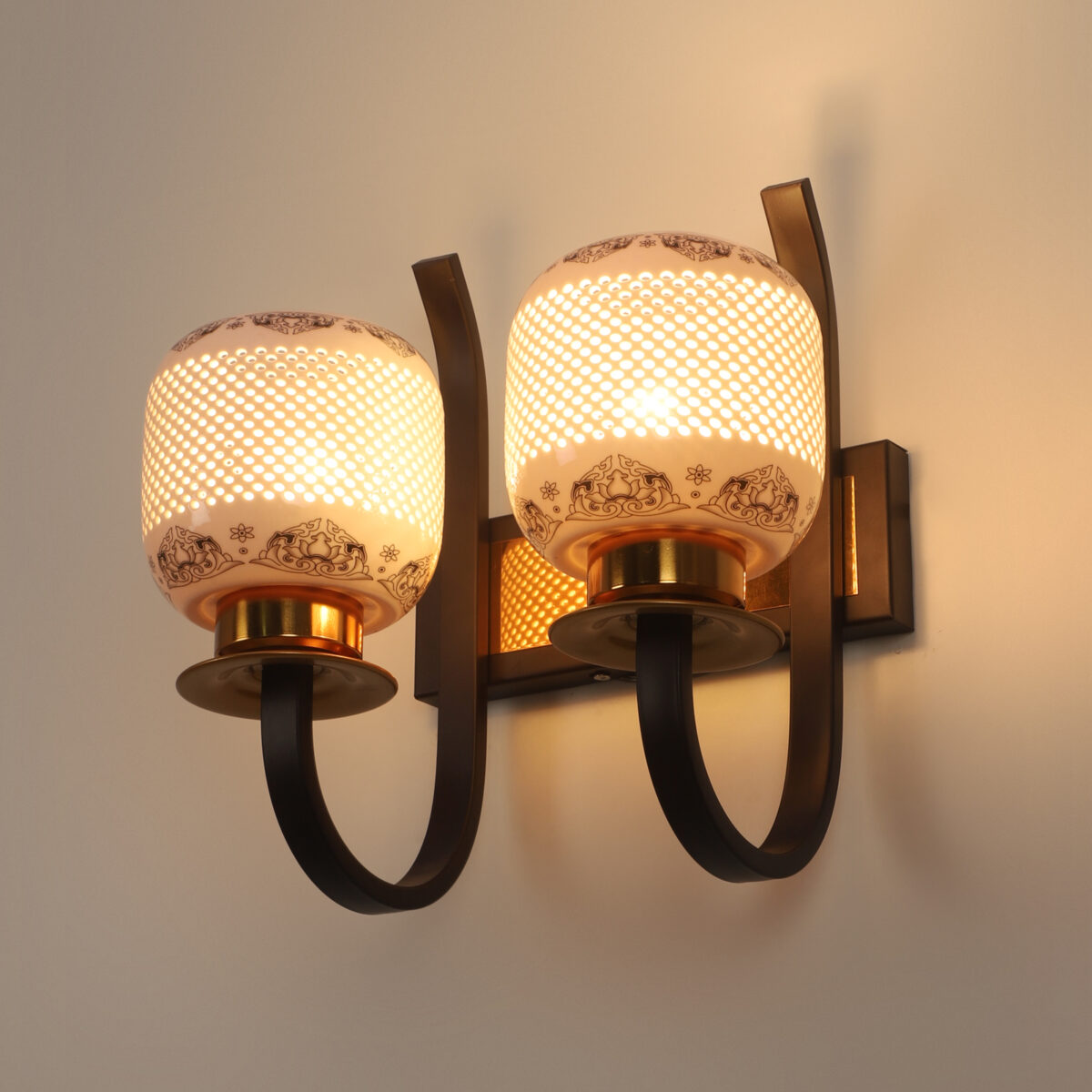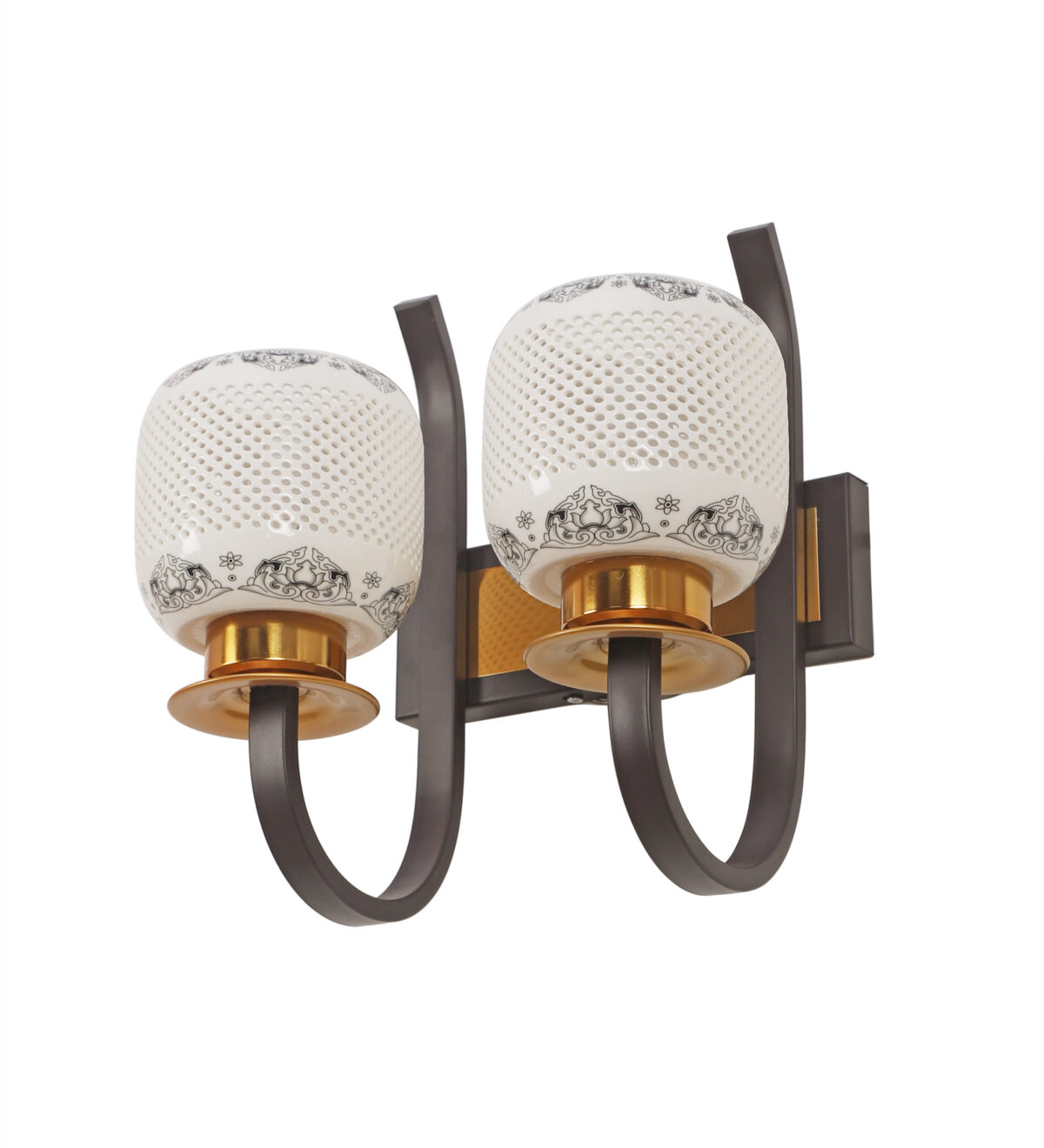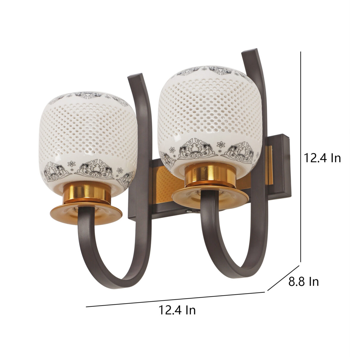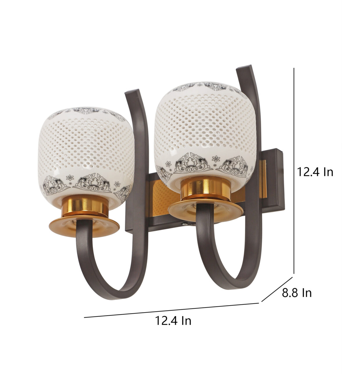 Dark brown,designer, traditional, mild steel double wall light with ceramic shade. It is maintenance free, comes with an E27 holder, only the change of lamp is required, which is available locally everywhere. Application includes both residential and commercial premises wherever it matches with your interiors. Can be customized as per requirement. LAMPS NOT INCLUDED.