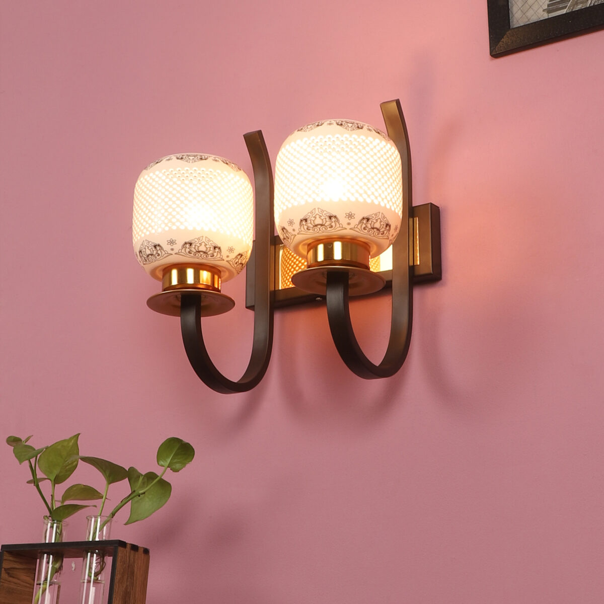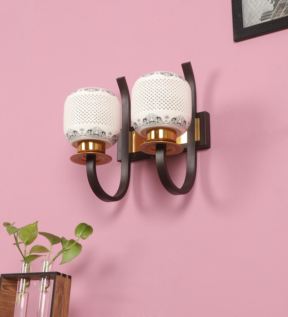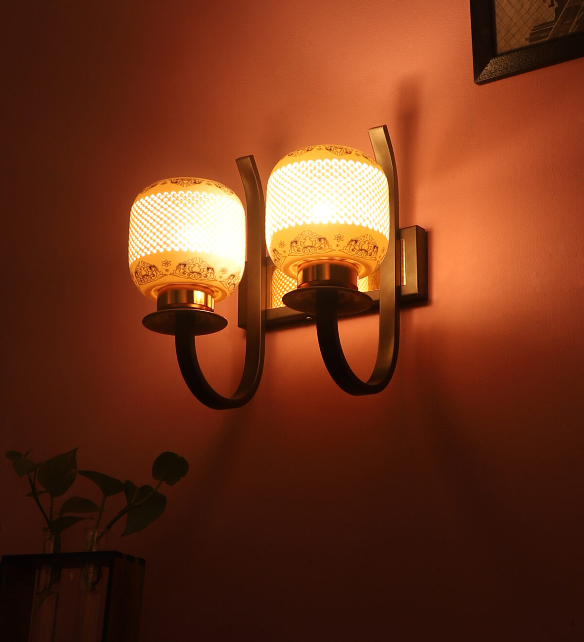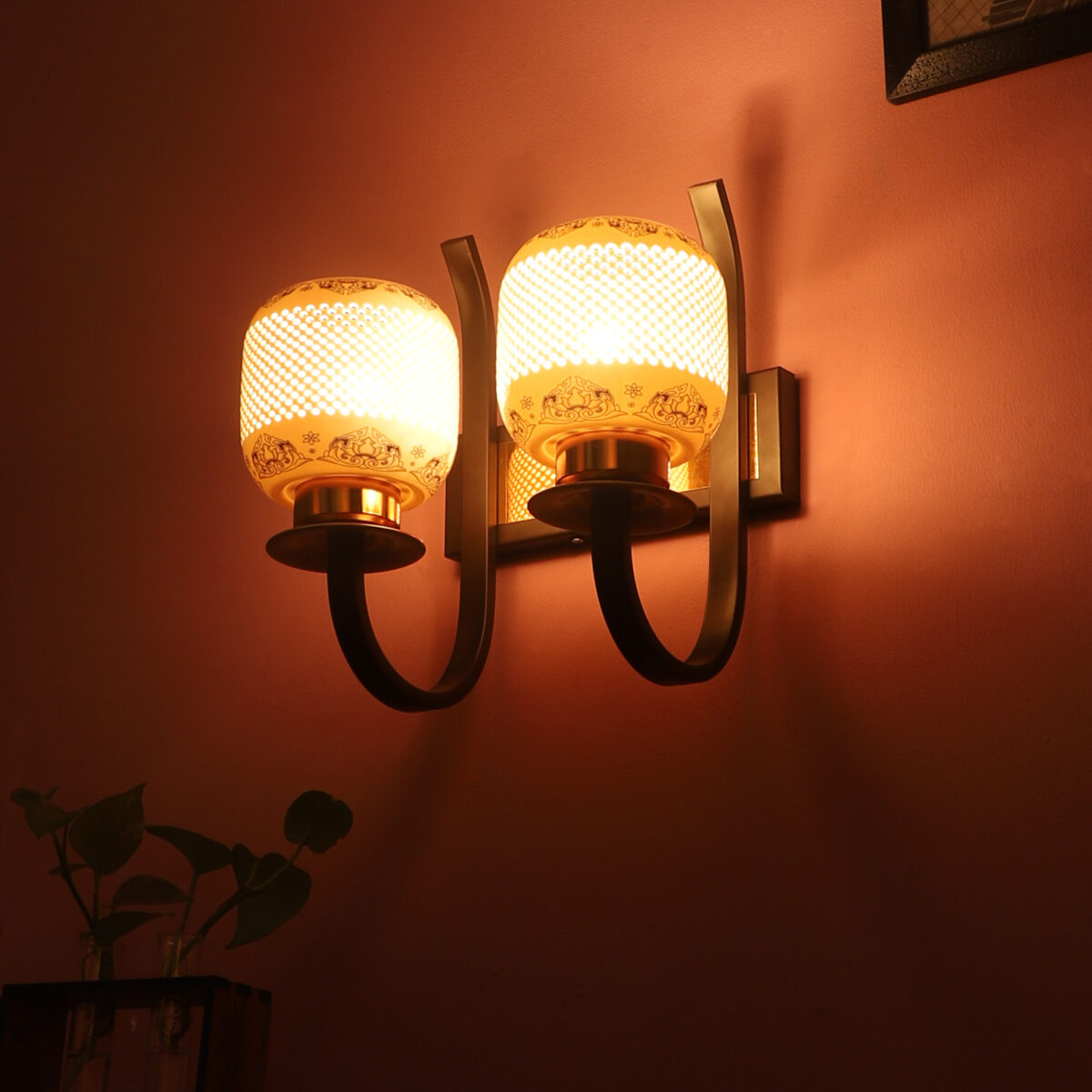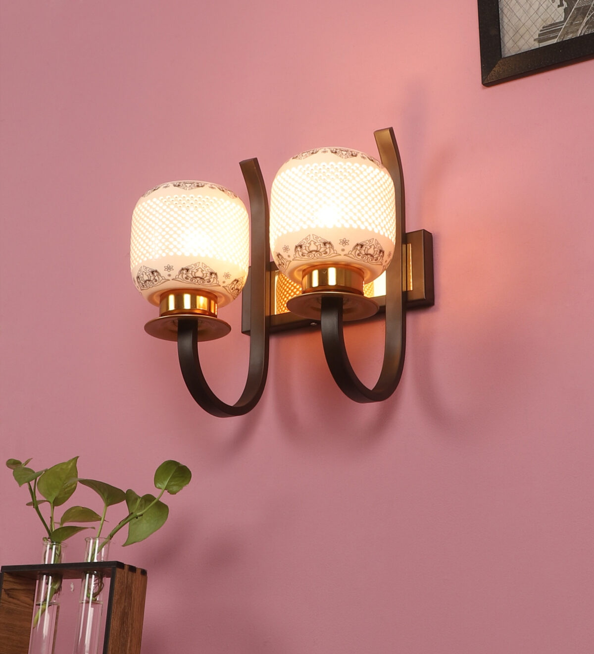 Dark brown,designer, traditional, mild steel double wall light with ceramic shade. It is maintenance free, comes with an E27 holder, only the change of lamp is required, which is available locally everywhere. Application includes both residential and commercial premises wherever it matches with your interiors. Can be customized as per requirement. LAMPS NOT INCLUDED.
