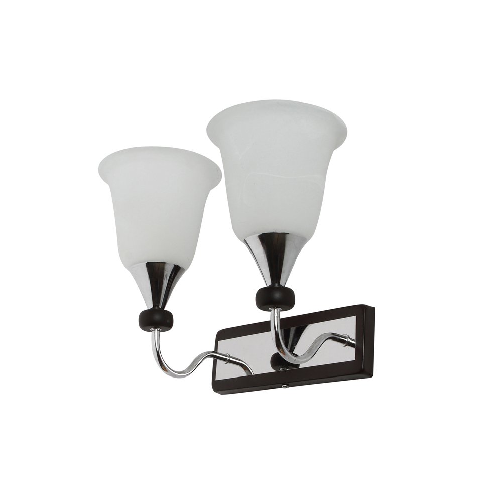 Dark brown silver (wood chrome) finish double wall light made of mild steel, with a bell shaped long white textured glass. Looks amazing when lit. It is maintenance free, easy to remove glass and wash it, comes with an E27 holder, only the change of lamp is required, which is available locally everywhere. You can of course swap out the bulb for one that is dimmable, has a higher light output or a different color temperature. Application includes both residential and commercial premises wherever it matches with your interiors. Matching single wall light code – WL2453. Can be customized as per requirement in case of bulk quantities. Lamp not included.