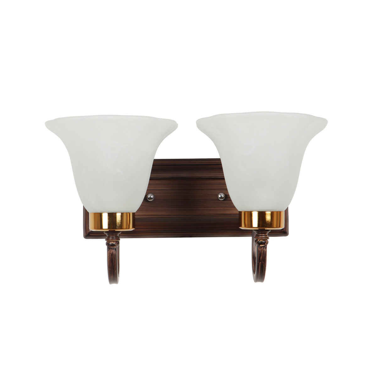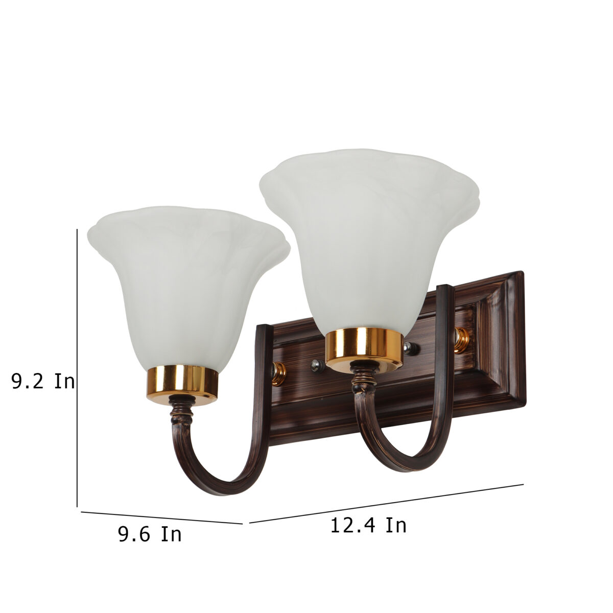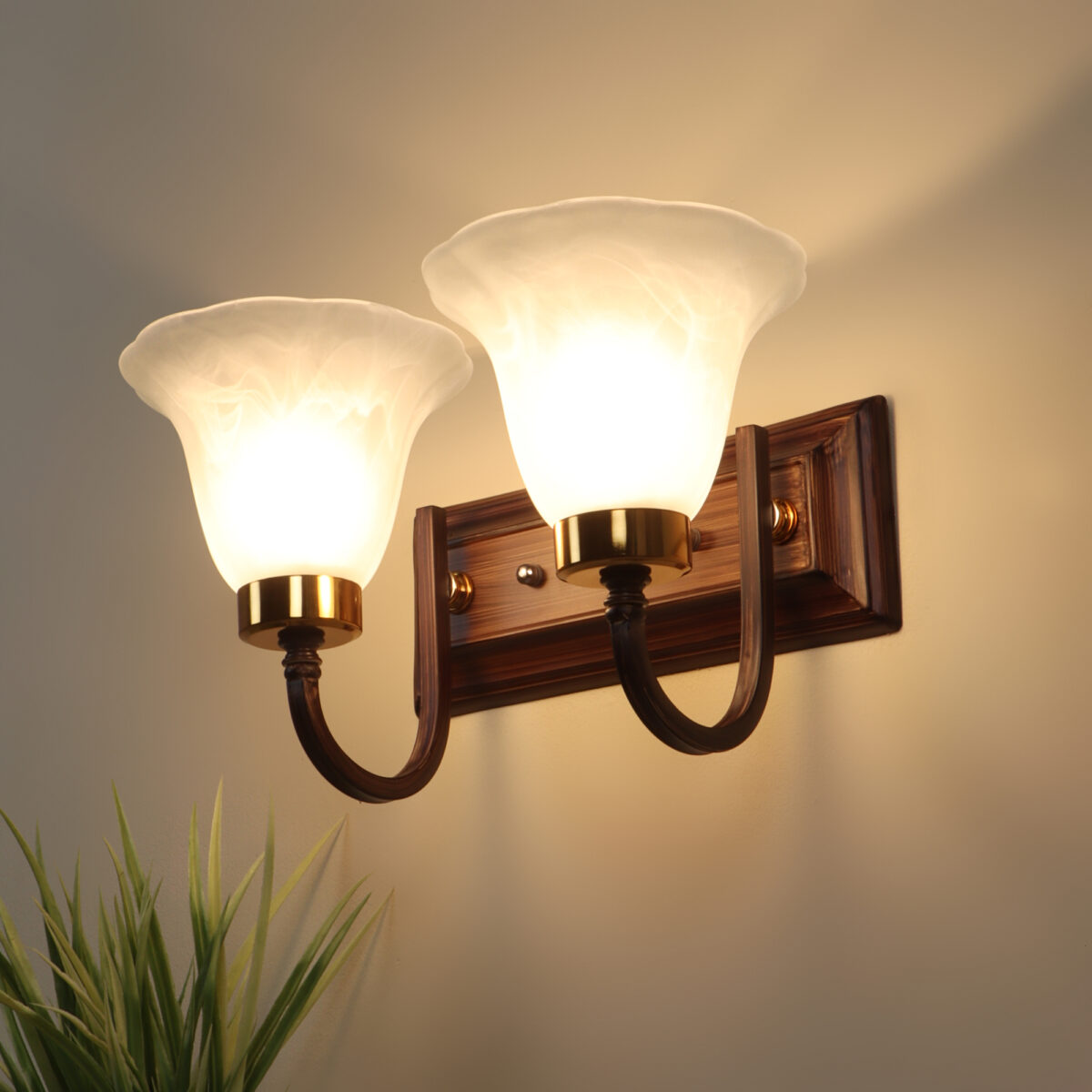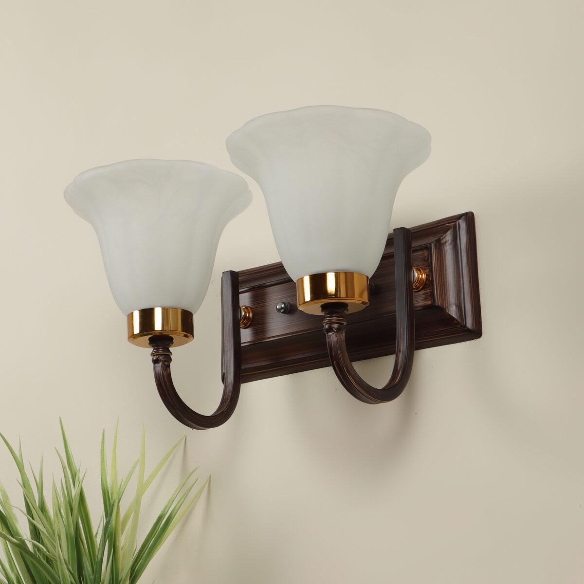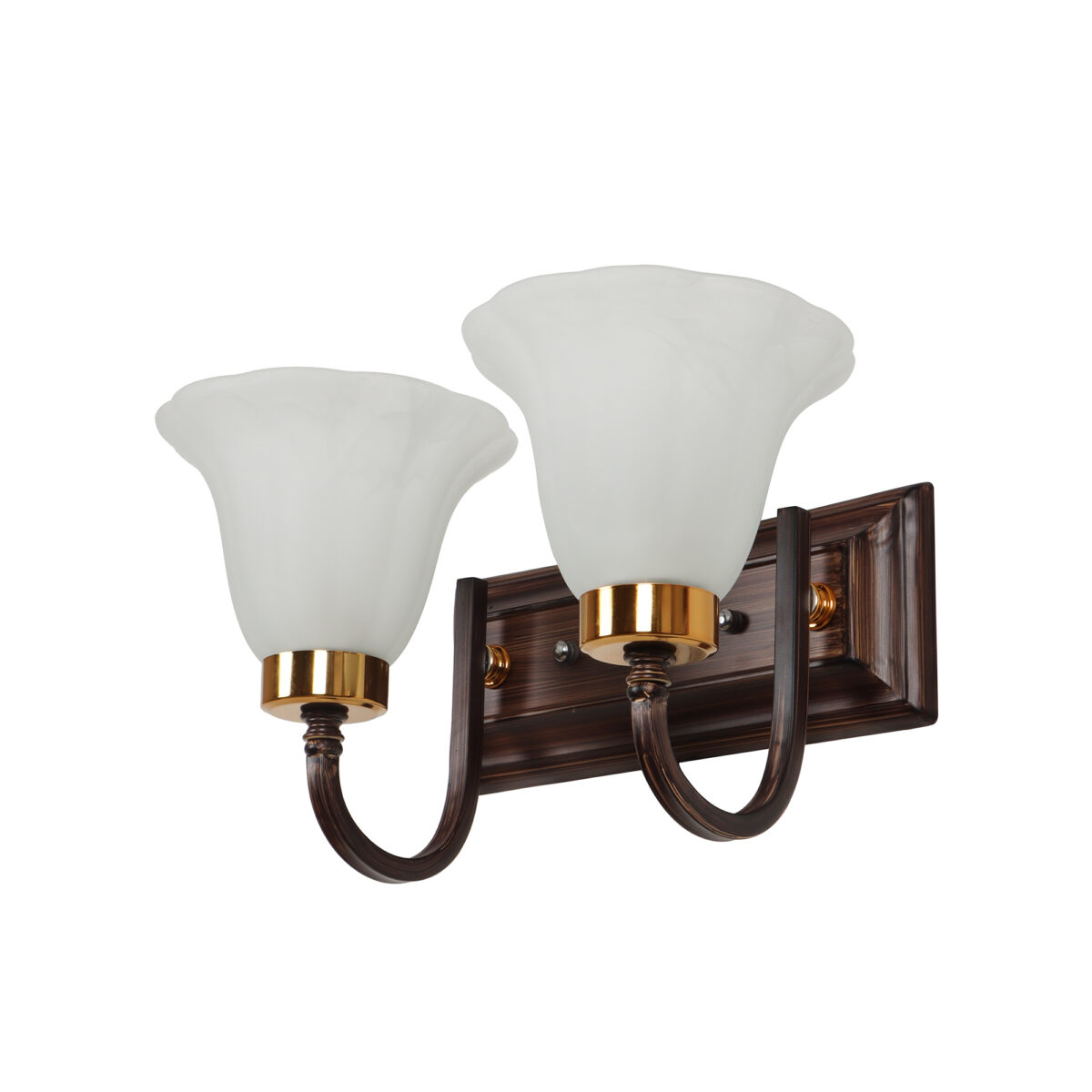 Dark brown (wood), gold finish double wall light made of mild steel, with flower shaped glasses. It is maintenance free, easy to remove glass and wash it, comes with an E27 holder, only the change of lamp is required, which is available locally everywhere. You can of course swap out the bulb for one that is dimmable, has a higher light output or a different color temperature. Application includes both residential and commercial premises wherever it matches with your interiors. Matching single wall light code – WL2415. Can be customized as per requirement in case of bulk quantities. Lamp not included.
