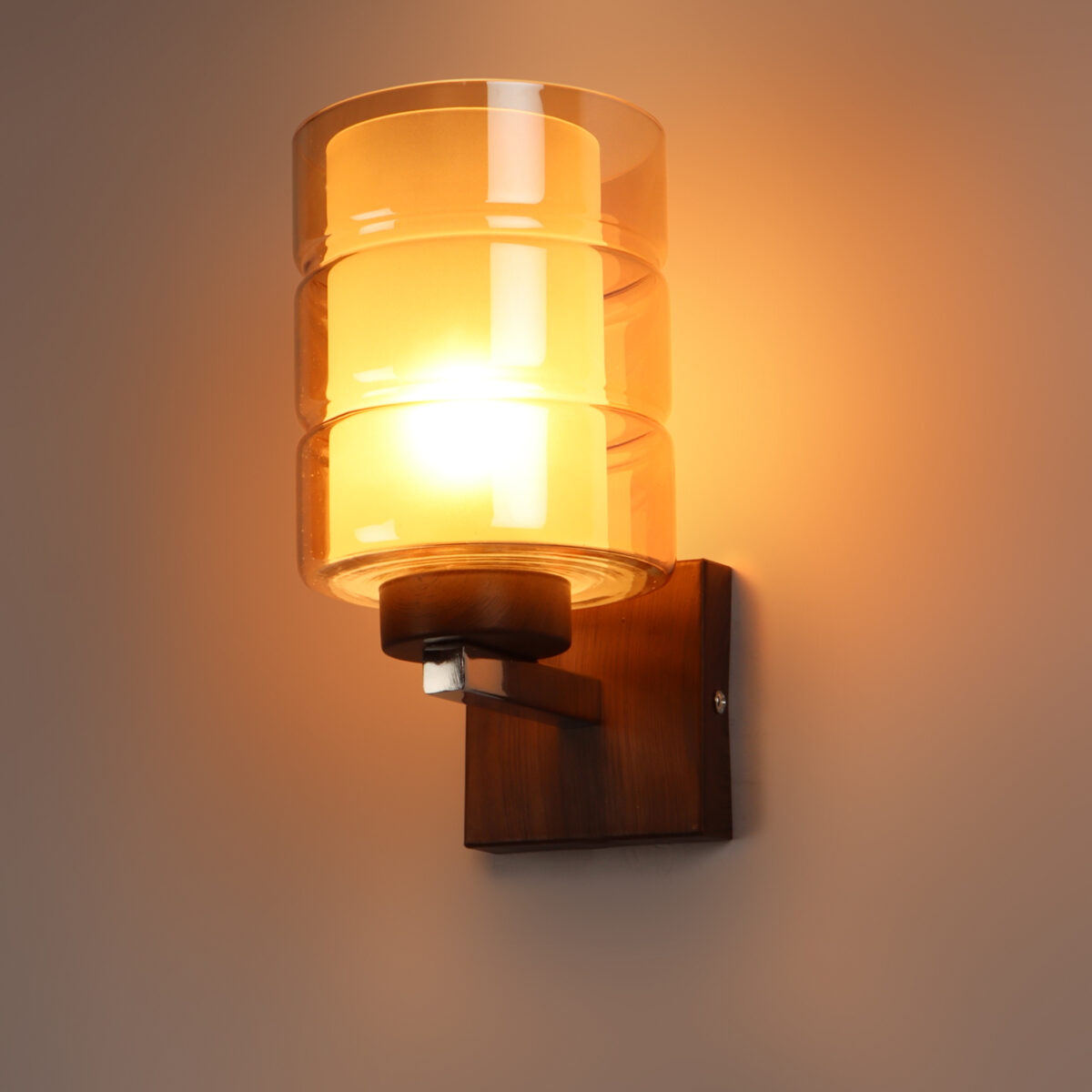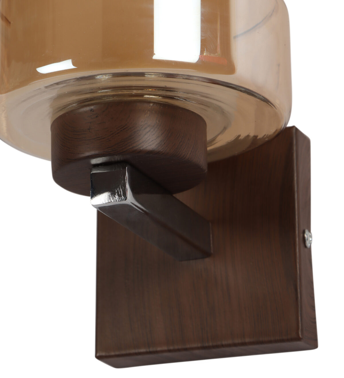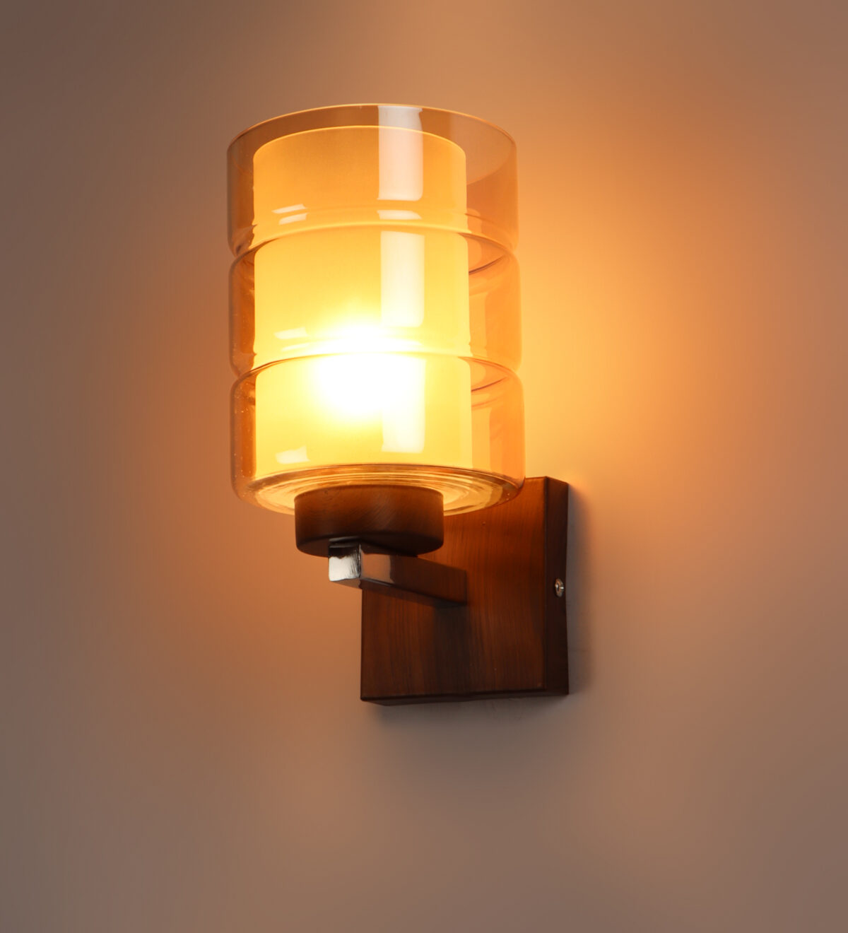 Dark brown (wood finish with grains) single wall light having cylindrical Champaign coloured two layer glass made of mild steel. It is maintenance free., It is easy to remove glass and wash them. Comes with an E27 holder, only the change of lamp is required, which is available locally everywhere. Application includes both residential and commercial premises wherever it matches with your interiors. Matching double wall light code WL2526. LAMP NOT INCLUDED.