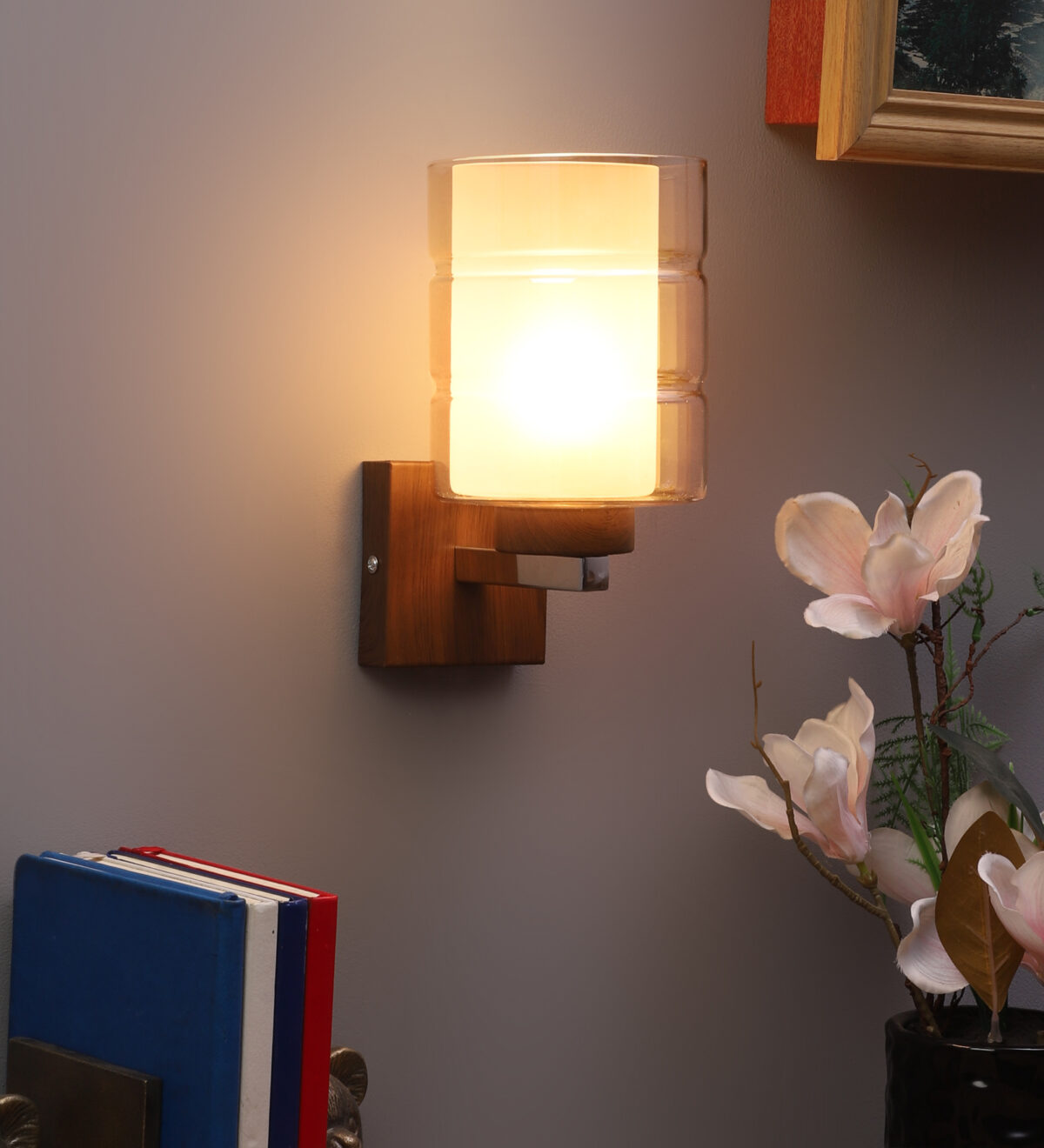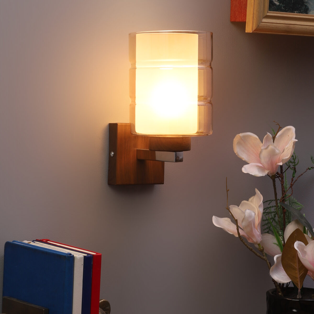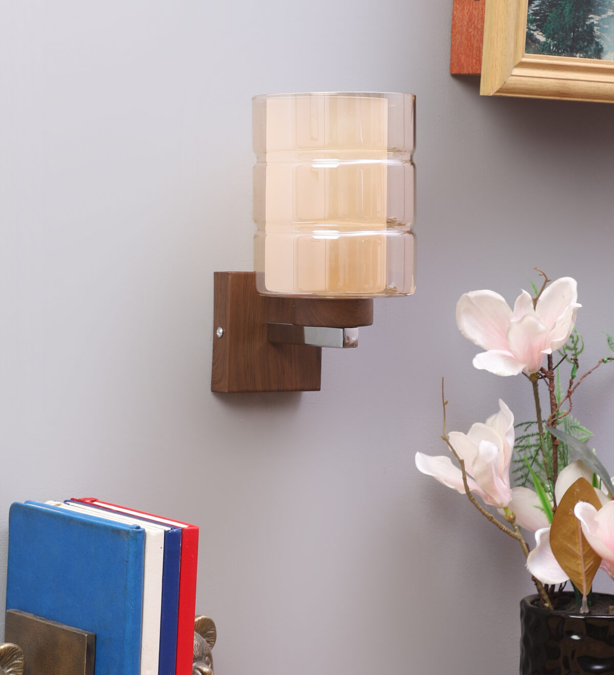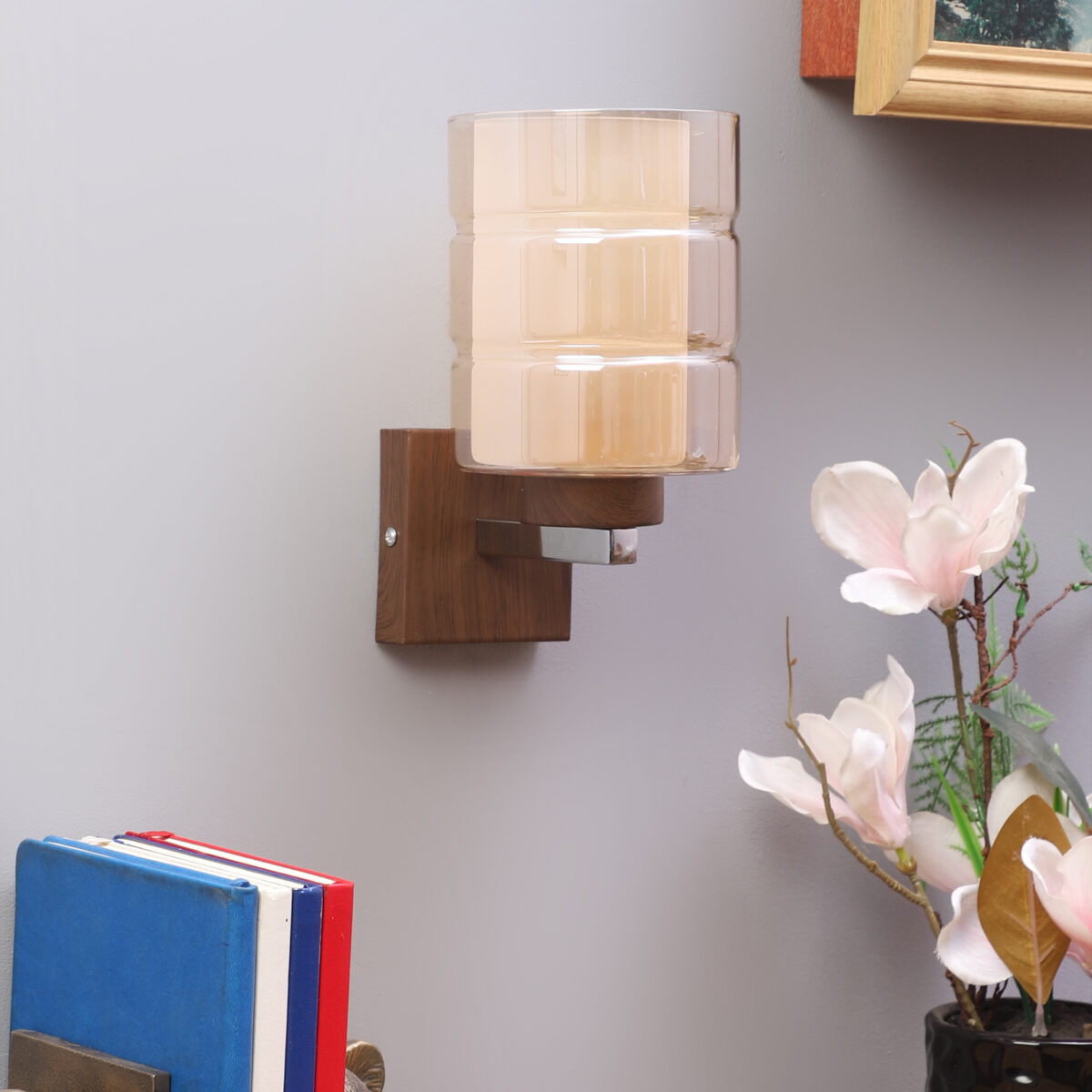 Dark brown (wood finish with grains) single wall light having cylindrical Champaign coloured two layer glass made of mild steel. It is maintenance free., It is easy to remove glass and wash them. Comes with an E27 holder, only the change of lamp is required, which is available locally everywhere. Application includes both residential and commercial premises wherever it matches with your interiors. Matching double wall light code WL2526. LAMP NOT INCLUDED.