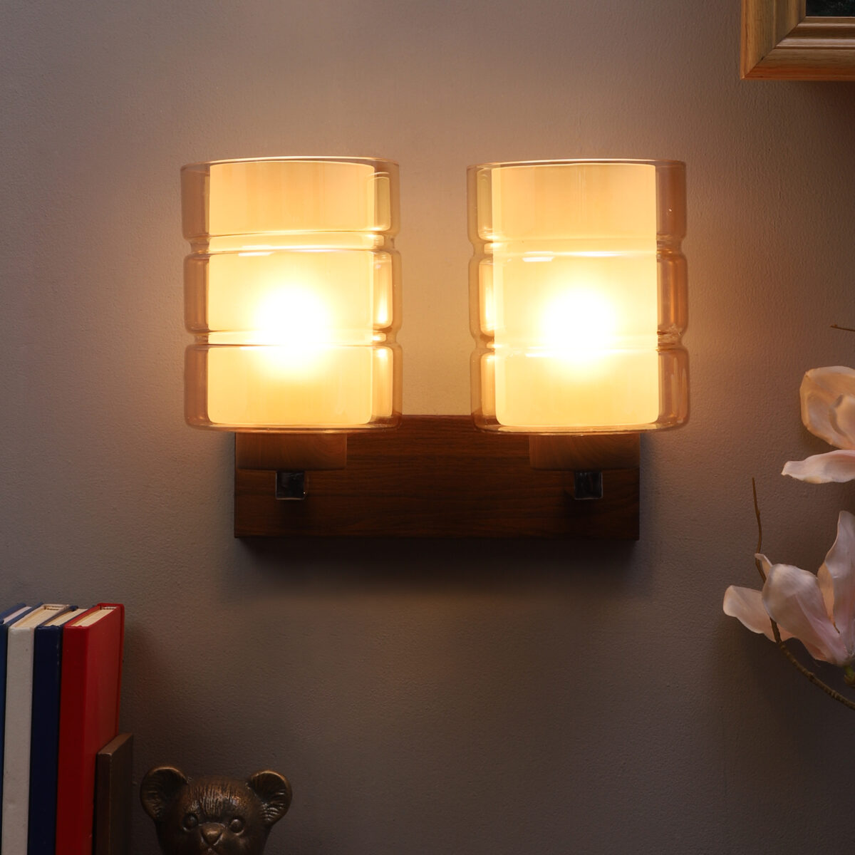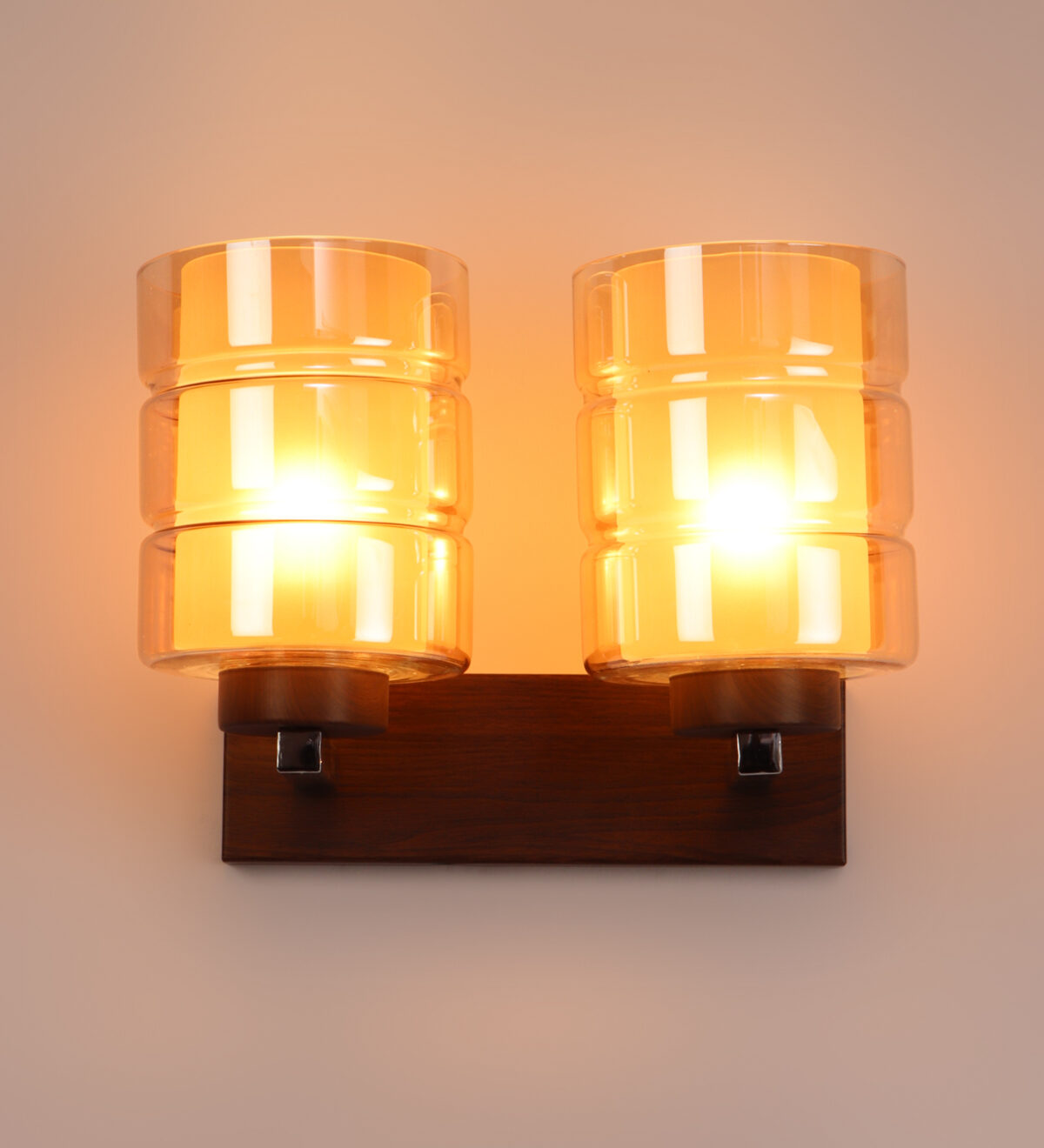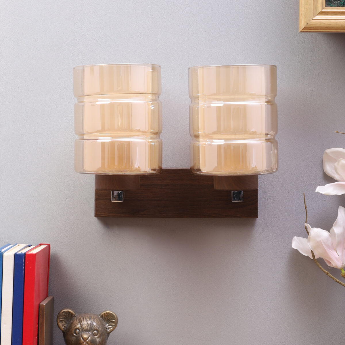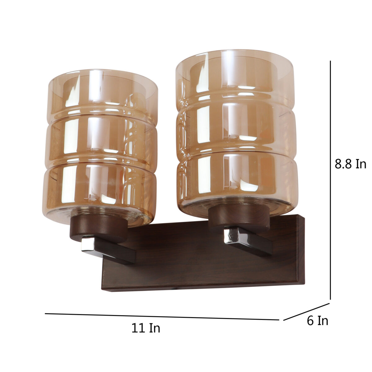 Dark brown (wood finish with grains) double wall light having cylindrical Champaign coloured two layer glass made of mild steel. It is maintenance free., It is easy to remove glass and wash them. Comes with an E27 holder, only the change of lamp is required, which is available locally everywhere. Application includes both residential and commercial premises wherever it matches with your interiors. Matching single wall light code WL2525. LAMP NOT INCLUDED.