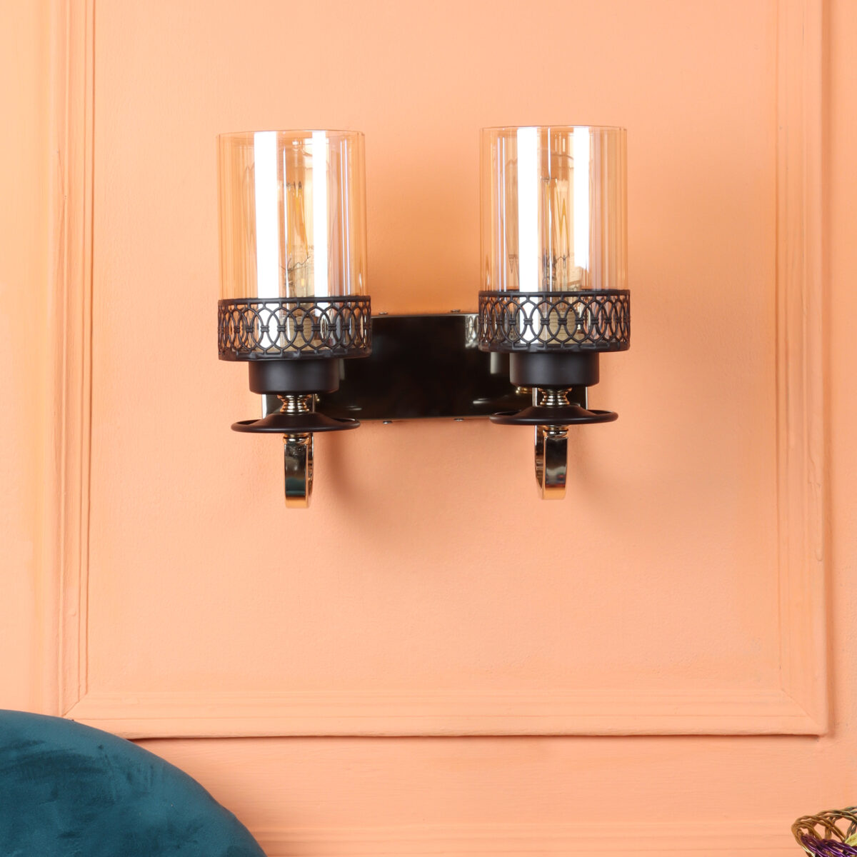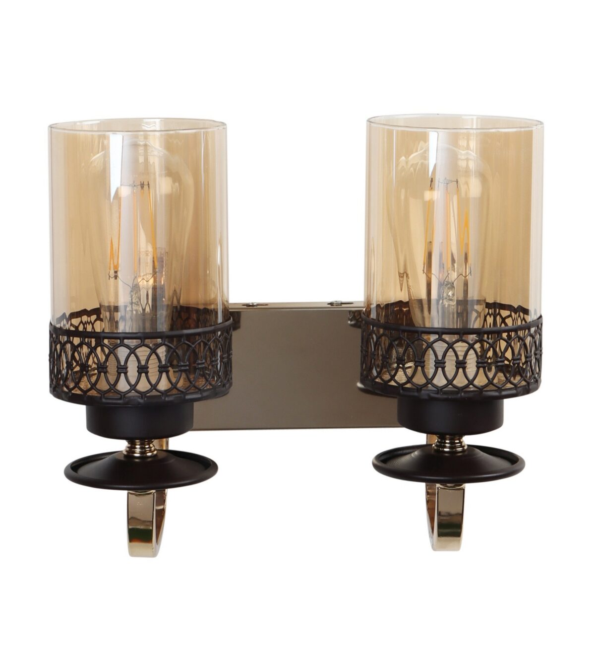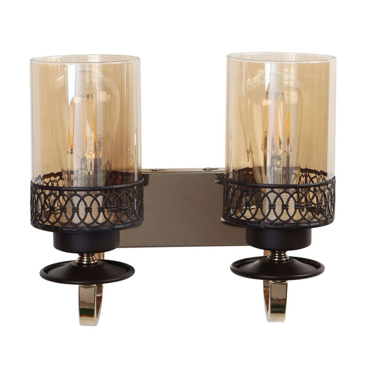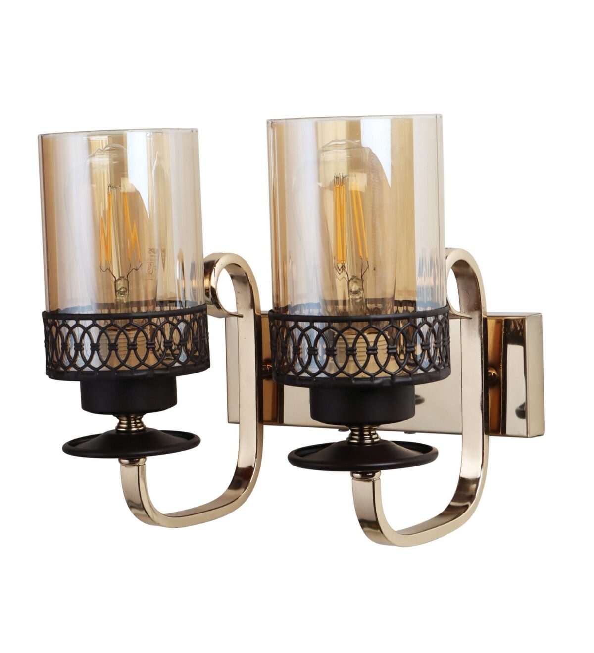 Brown, Gold finish, mild steel double wall light in Champaign colored glass. It is maintenance free, comes with an E27 holder, only the change of lamp is required, which is available locally everywhere. LED filament lamp is recommended to enhance its beauty. Matching single wall light code – WL2707. Matching Chandellier code – CH461. Application includes both residential and commercial premises wherever it matches with your interiors. Can be customized as per requirement in case of bulk quantities. LAMP NOT INCLUDED.