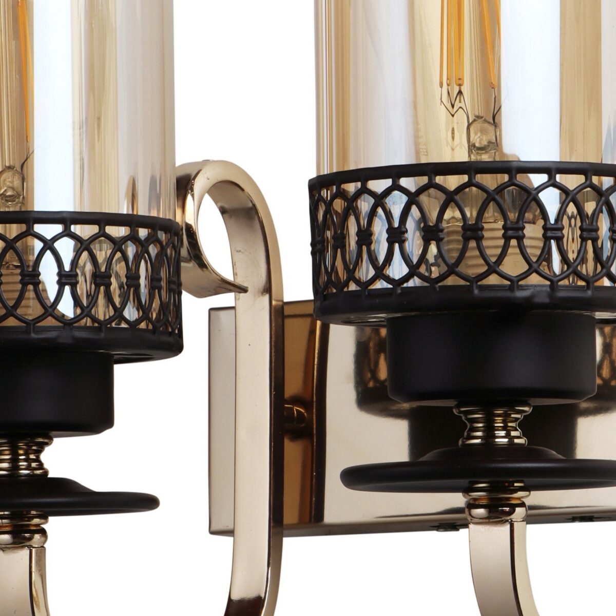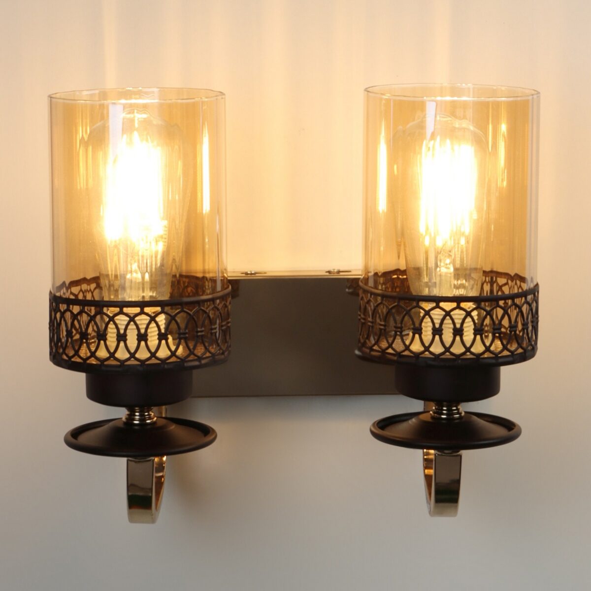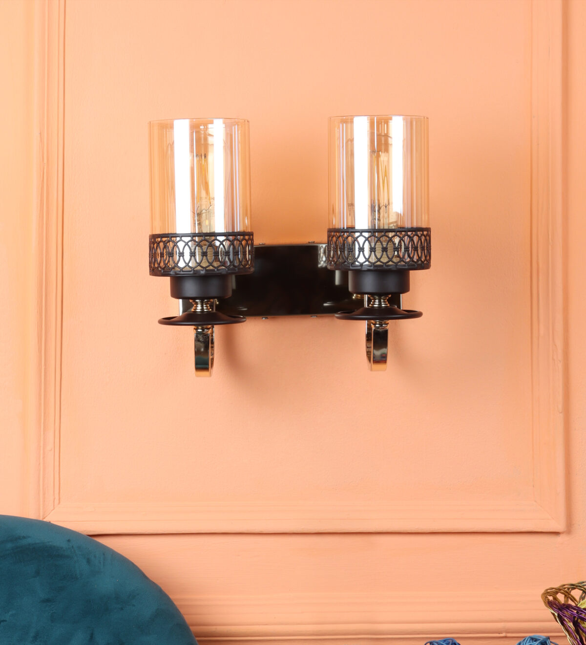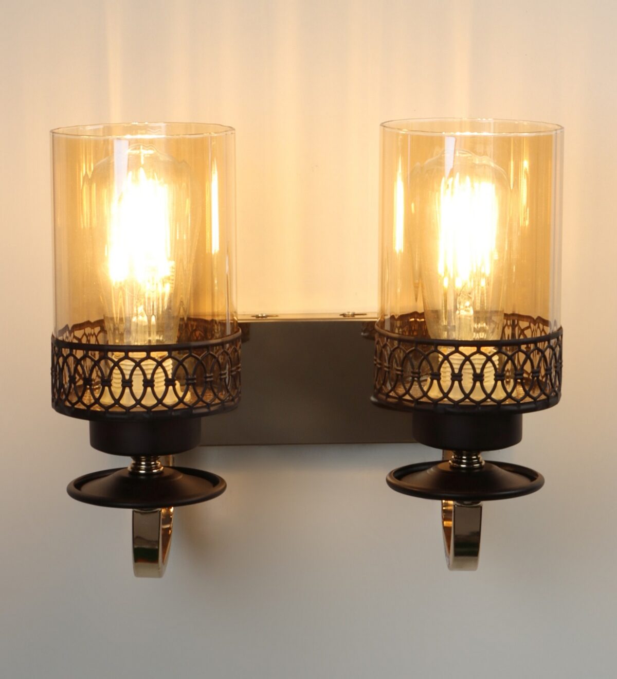 Brown, Gold finish, mild steel double wall light in Champaign colored glass. It is maintenance free, comes with an E27 holder, only the change of lamp is required, which is available locally everywhere. LED filament lamp is recommended to enhance its beauty. Matching single wall light code – WL2707. Matching Chandellier code – CH461. Application includes both residential and commercial premises wherever it matches with your interiors. Can be customized as per requirement in case of bulk quantities. LAMP NOT INCLUDED.
