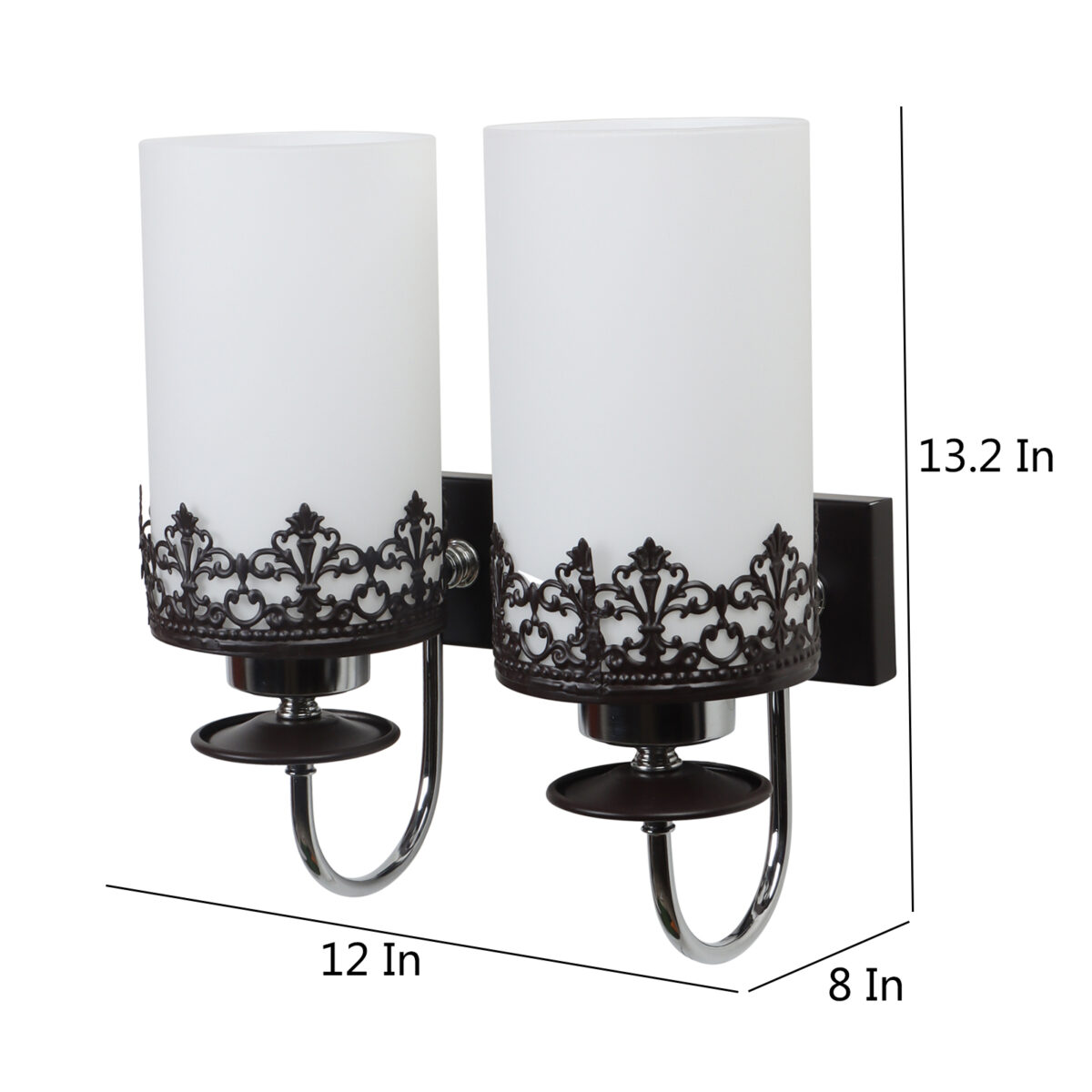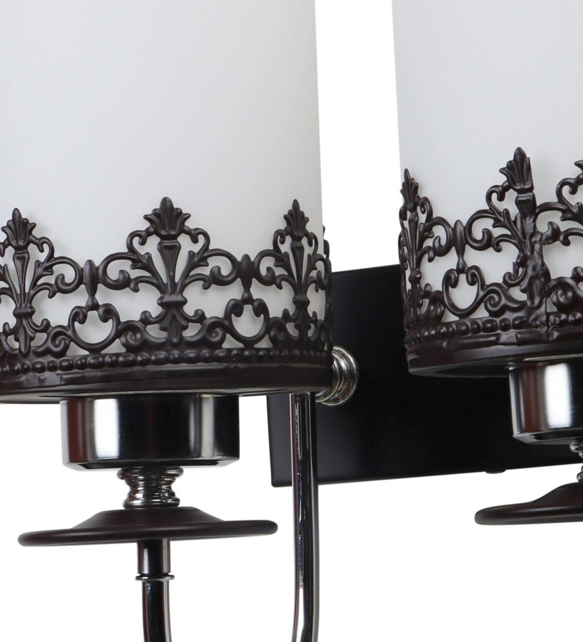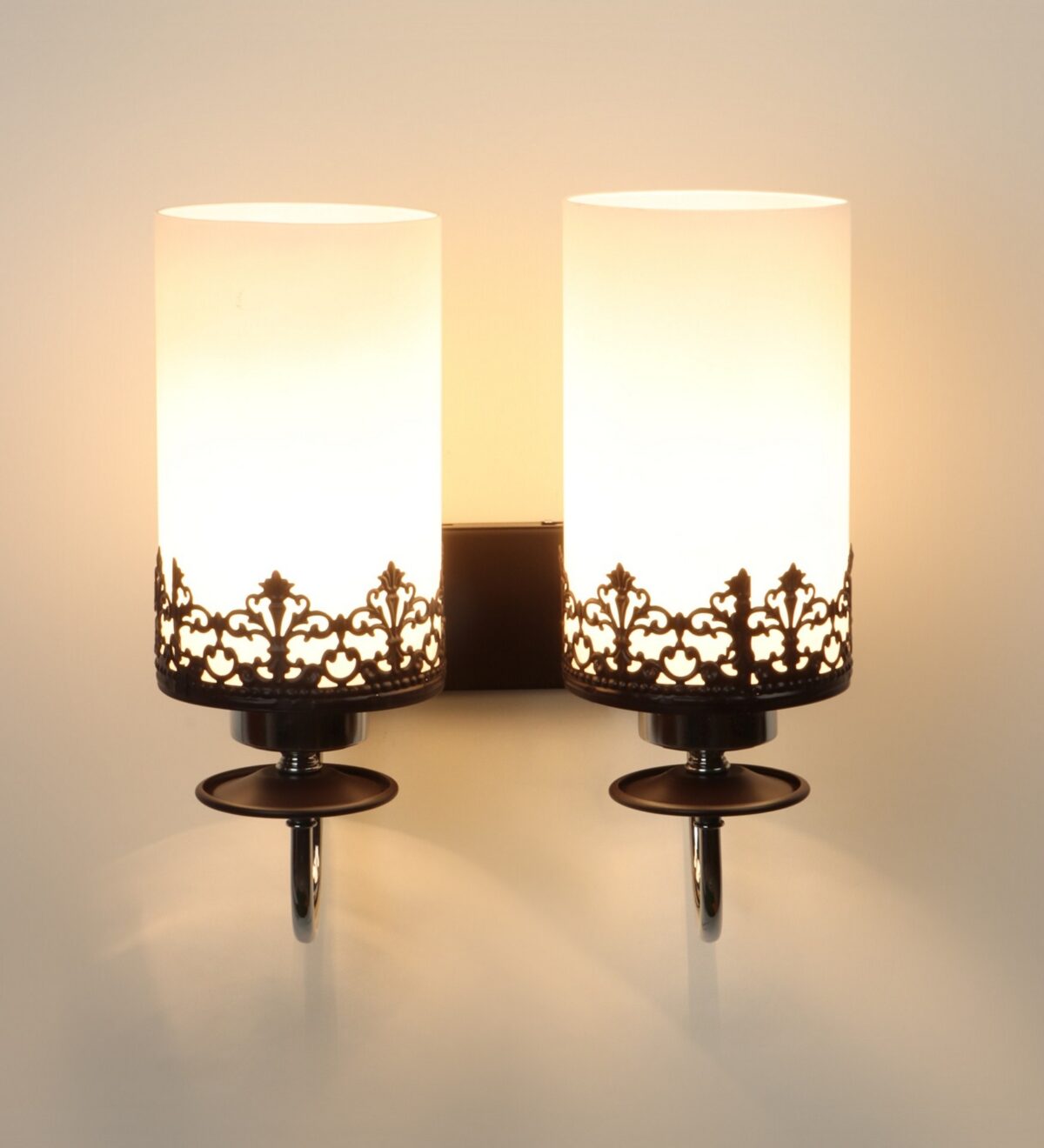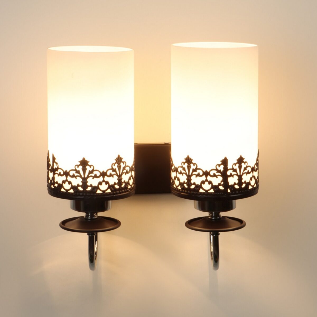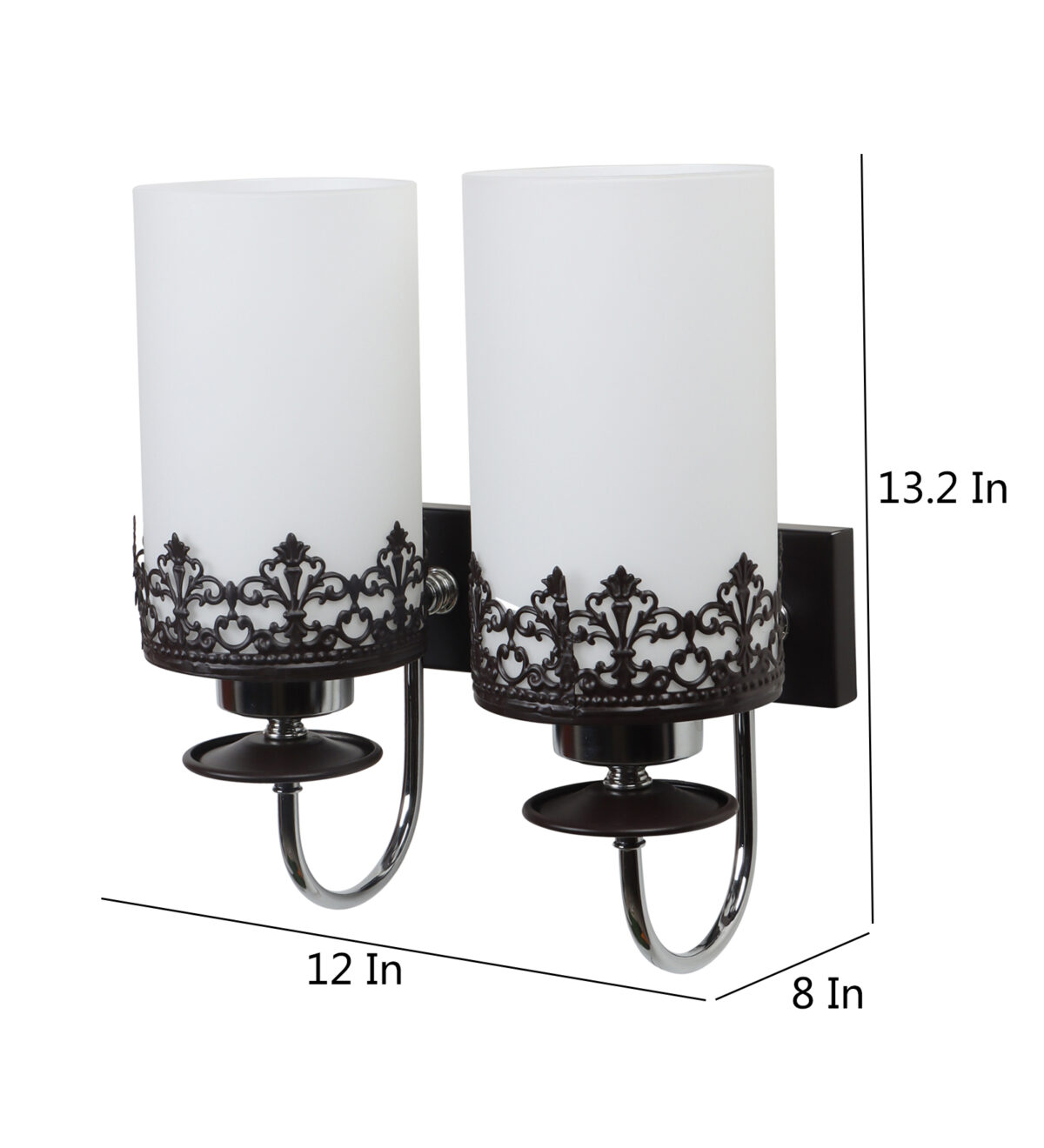 Dark brown (wood) double wall light made of mild steel, with big round cylindrical white glass. It is maintenance free, easy to remove glass and wash them, comes with an E27 holder, only the change of lamp is required, which is available locally everywhere. You can of course swap out the bulb for one that is dimmable, has a higher light output or a different color temperature. Application includes both residential and commercial premises wherever it matches with your interiors. Matching single wall light code- WL2727. Matching Chandellier code – CH462-6, CH462-9. Can be customized as per requirement in case of bulk quantities. LAMP NOT INCLUDED.