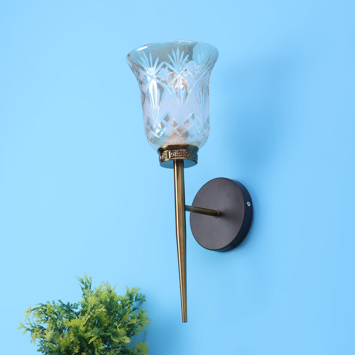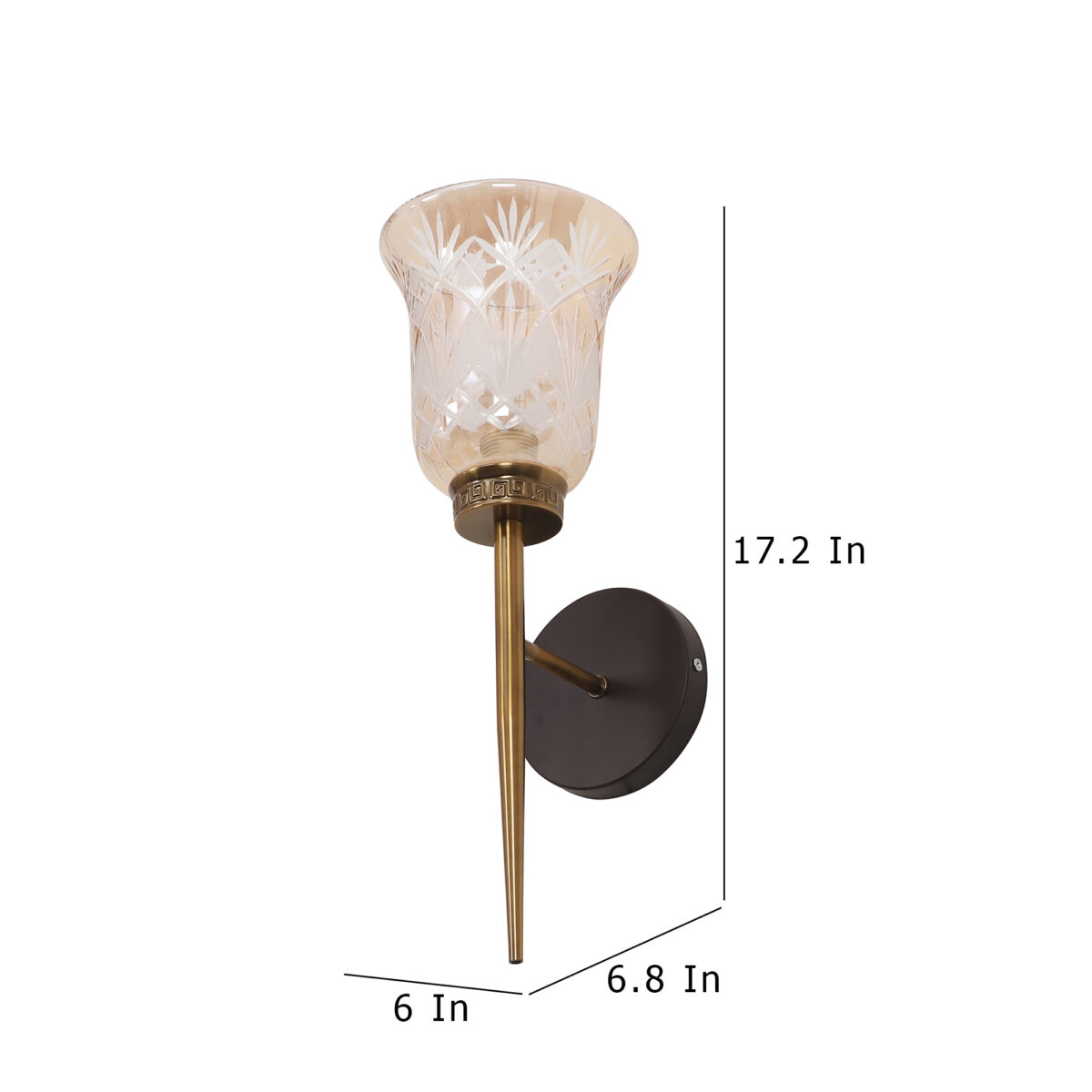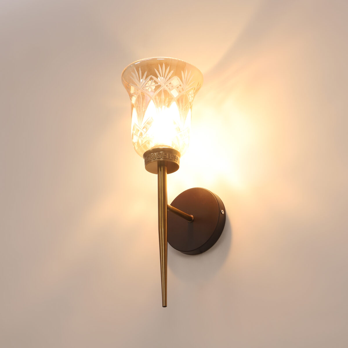 Antique, brown, mild steel single wall light with a bell shaped designer glass with engraved design. It is maintenance free, comes with an E27 holder, only the change of lamp is required, which is available locally everywhere. Application includes both residential and commercial premises wherever it matches with your interiors. Can be customized as per requirement. LAMPS NOT INCLUDED.