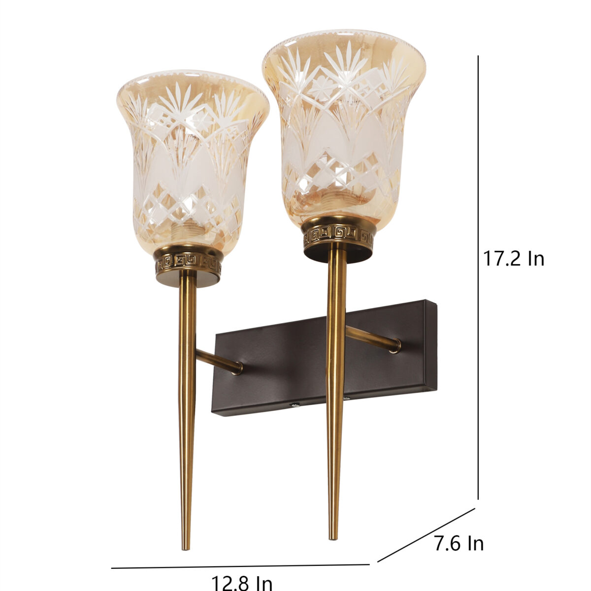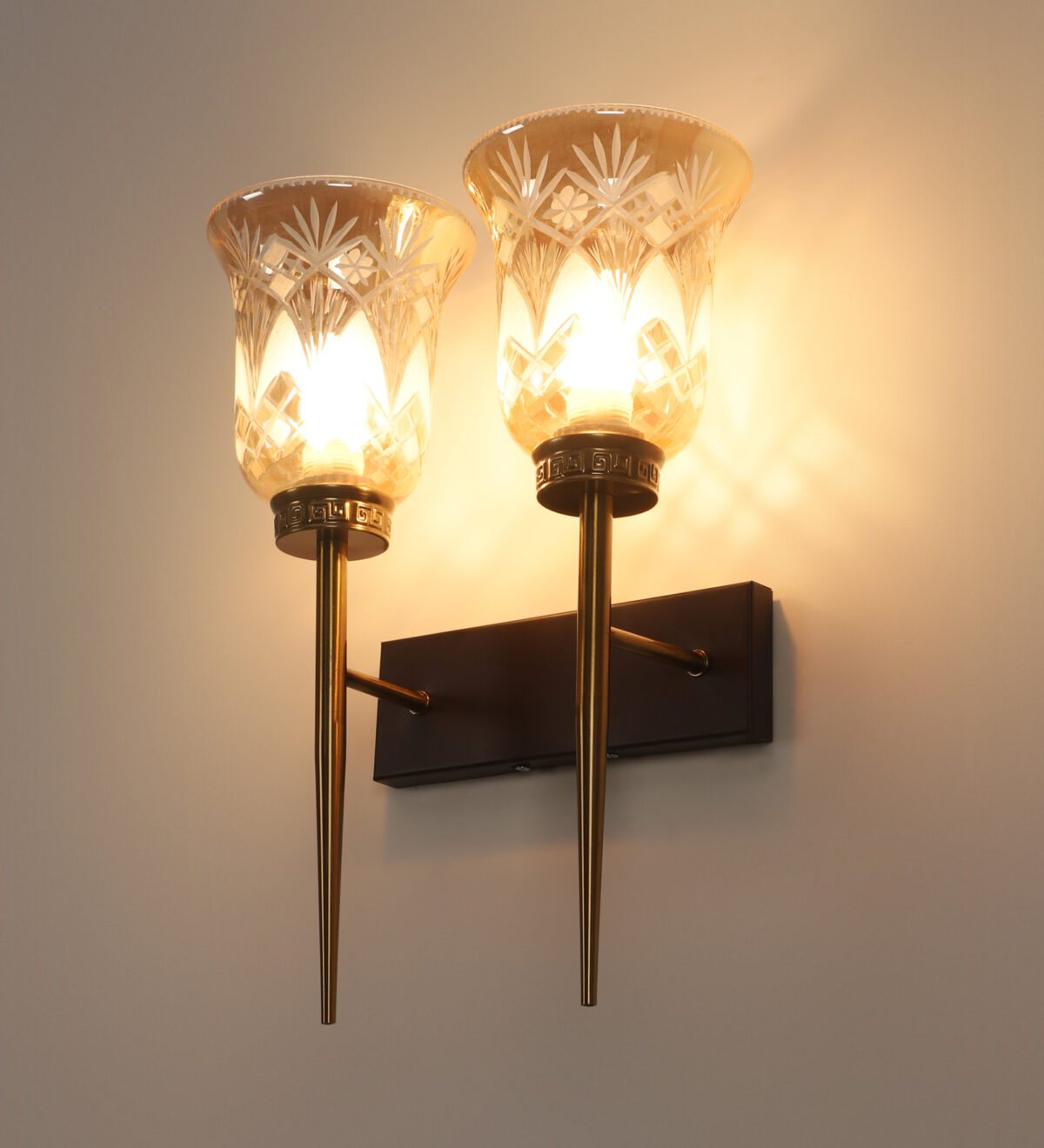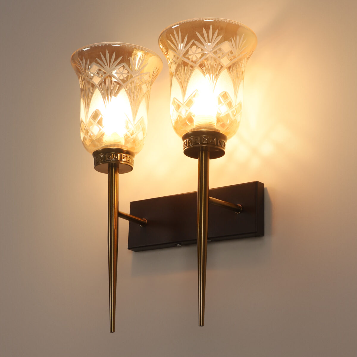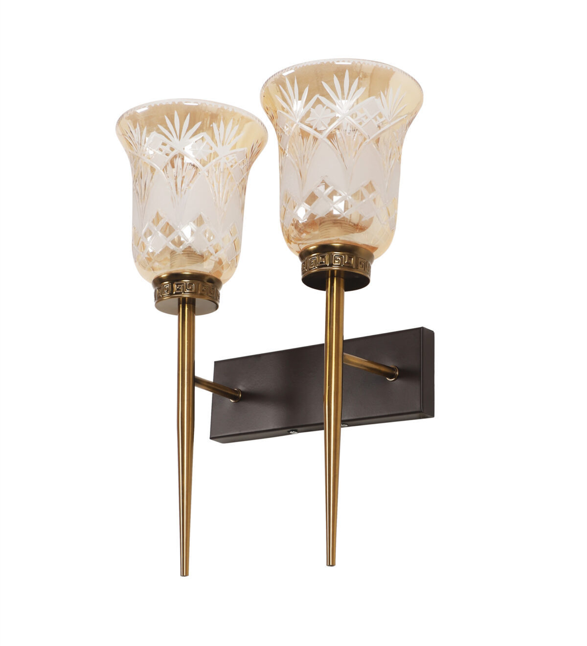 Antique, brown mild steel double wall light with bell shaped designer glasses with engraved design. It is maintenance free, comes with an E27 holder, only the change of lamp is required, which is available locally everywhere. Application includes both residential and commercial premises wherever it matches with your interiors. Can be customized as per requirement. LAMPS NOT INCLUDED.