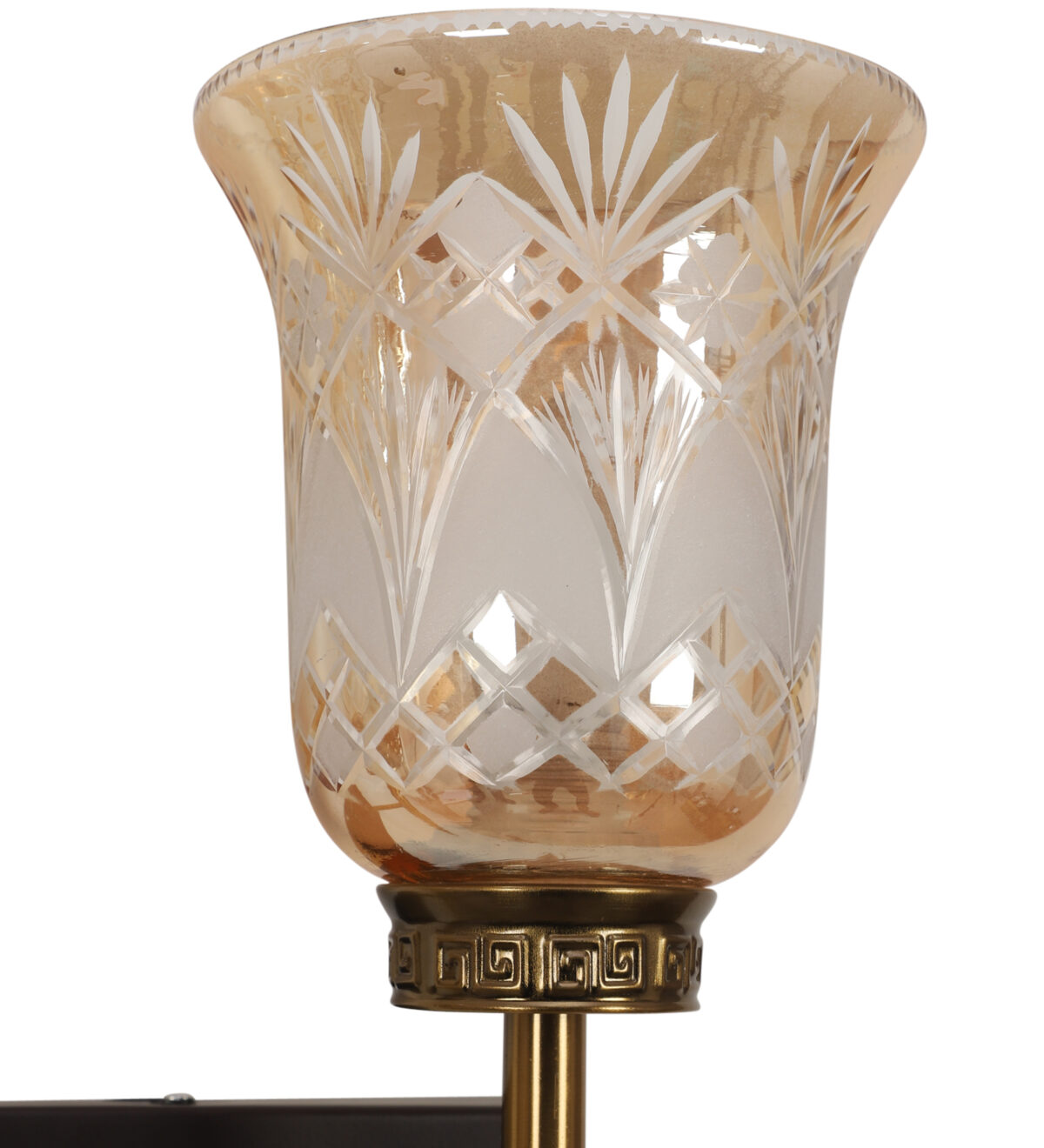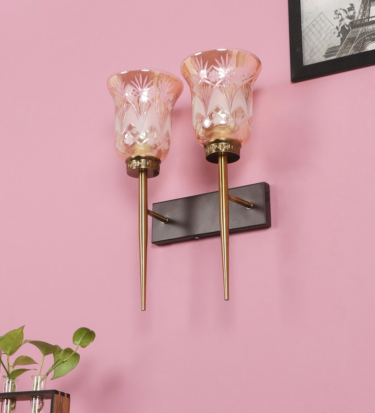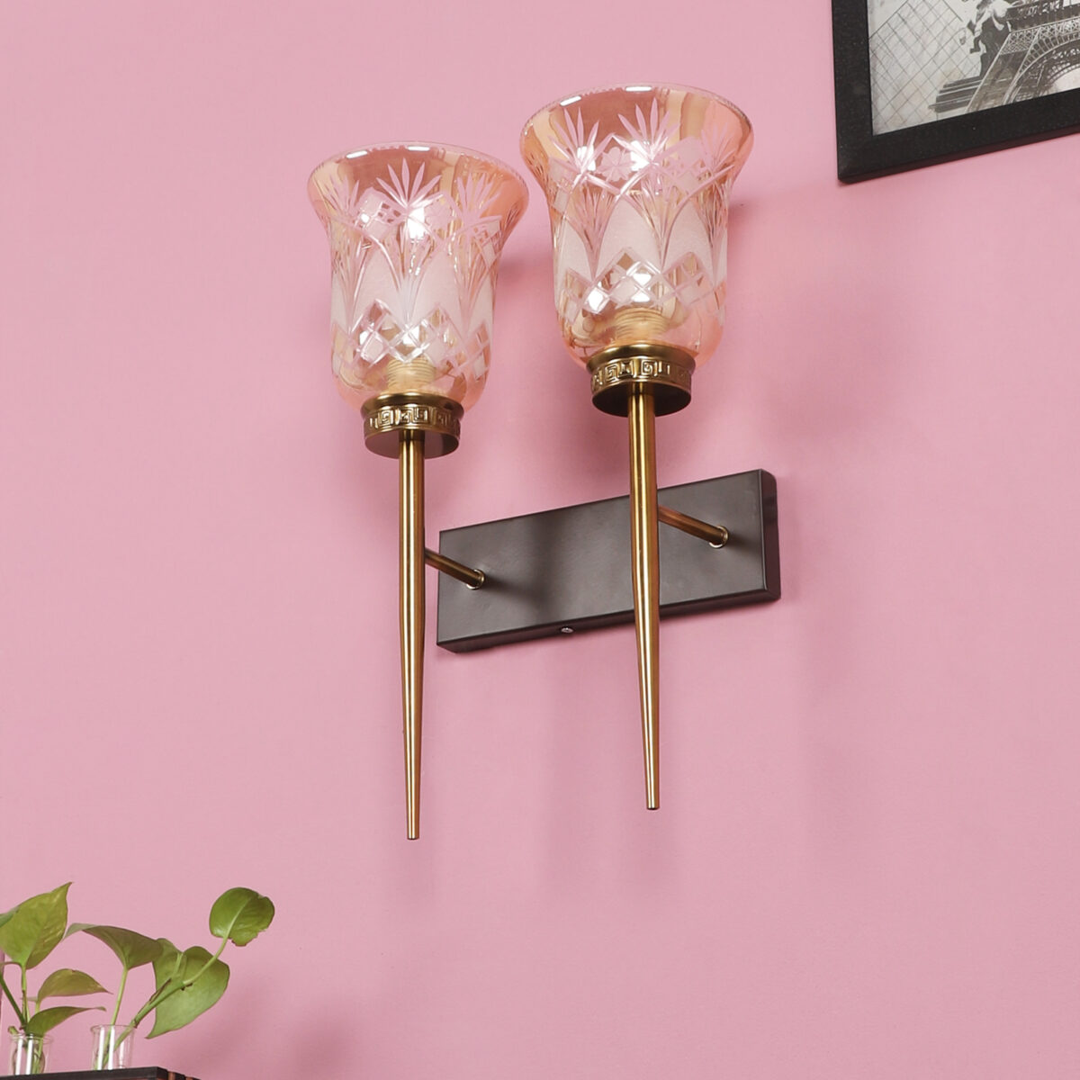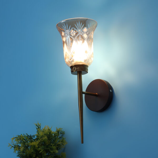 Antique, brown mild steel double wall light with bell shaped designer glasses with engraved design. It is maintenance free, comes with an E27 holder, only the change of lamp is required, which is available locally everywhere. Application includes both residential and commercial premises wherever it matches with your interiors. Can be customized as per requirement. LAMPS NOT INCLUDED.