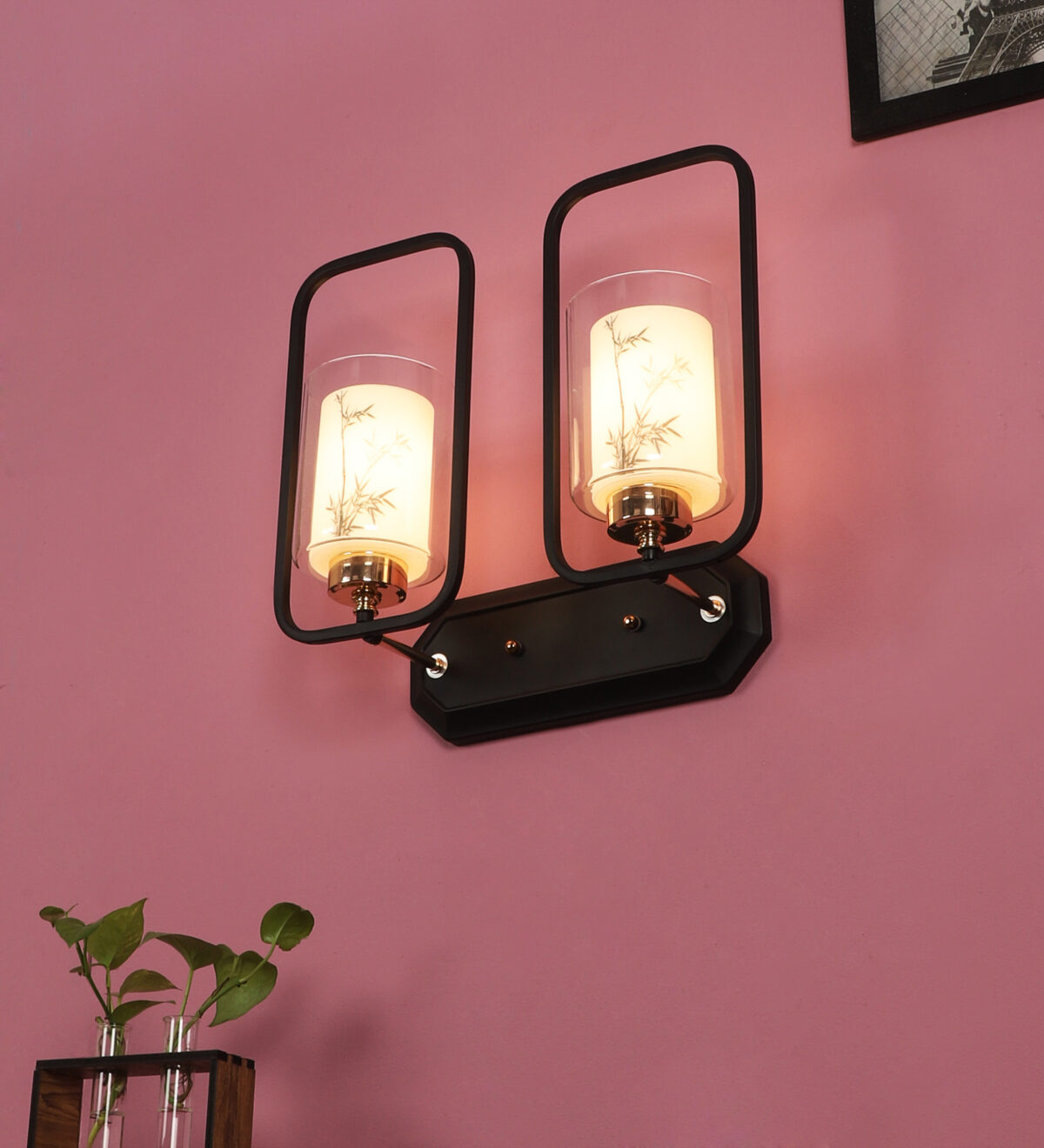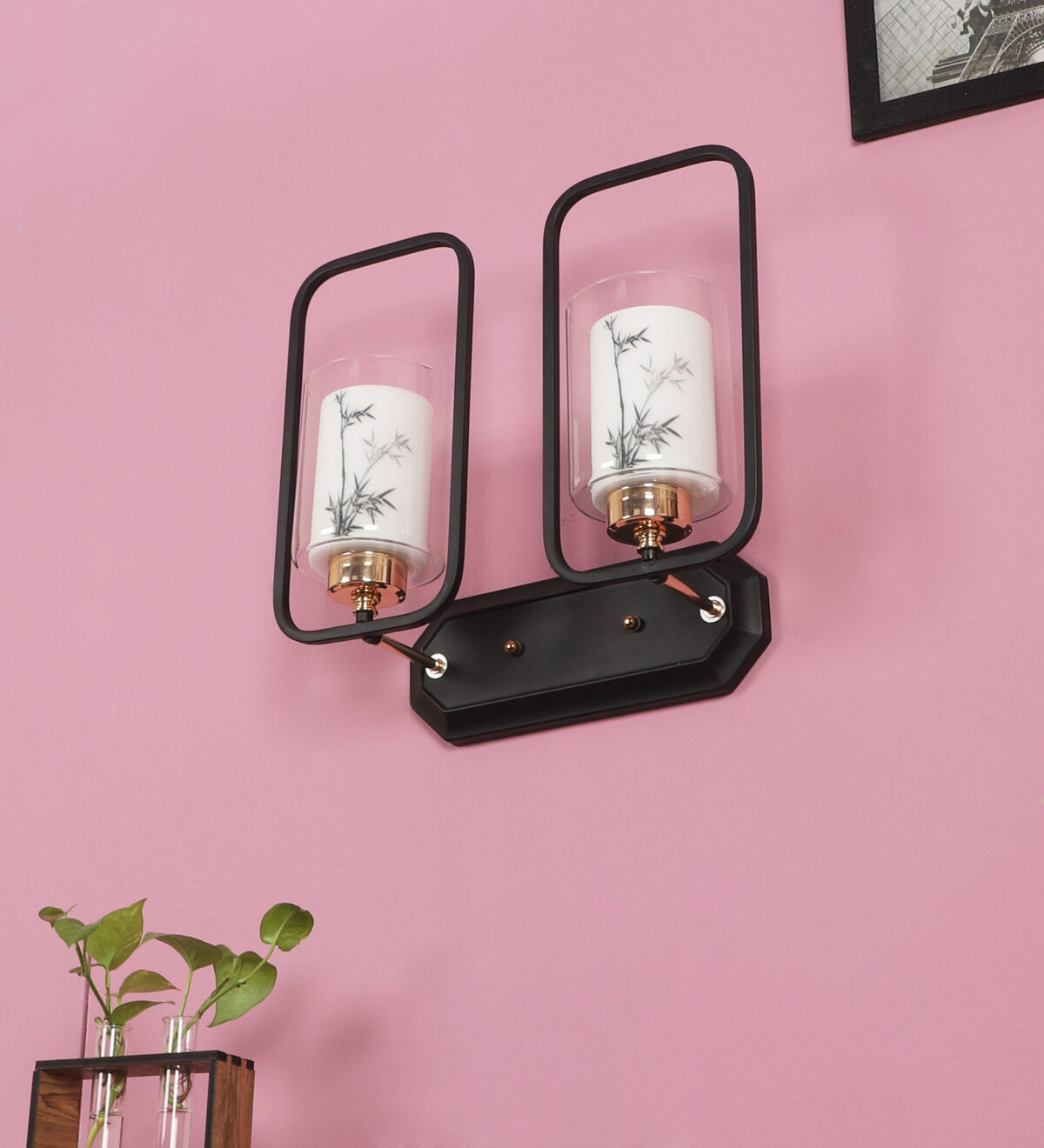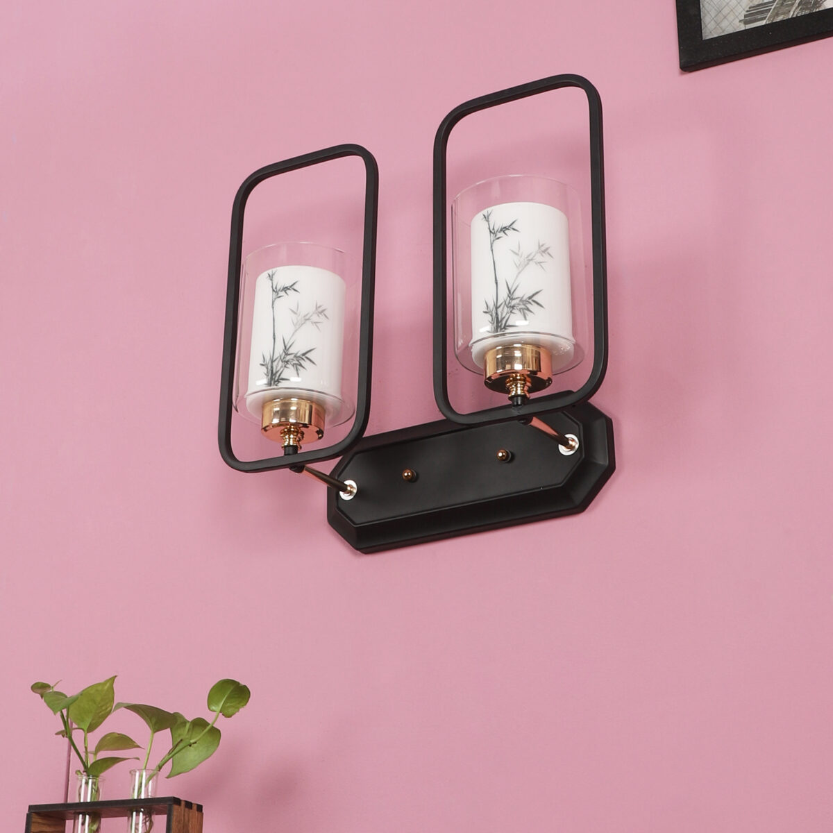Brown, Gold finish, mild steel double wall light with white glass having a printed design. It is maintenance free, comes with an E27 holder, only the change of lamp is required, which is available locally everywhere. Application includes both residential and commercial premises wherever it matches with your interiors. Can be customized as per requirement. LAMP NOT INCLUDED.