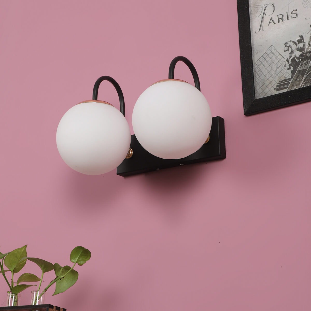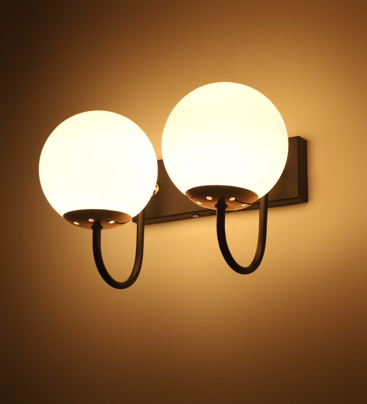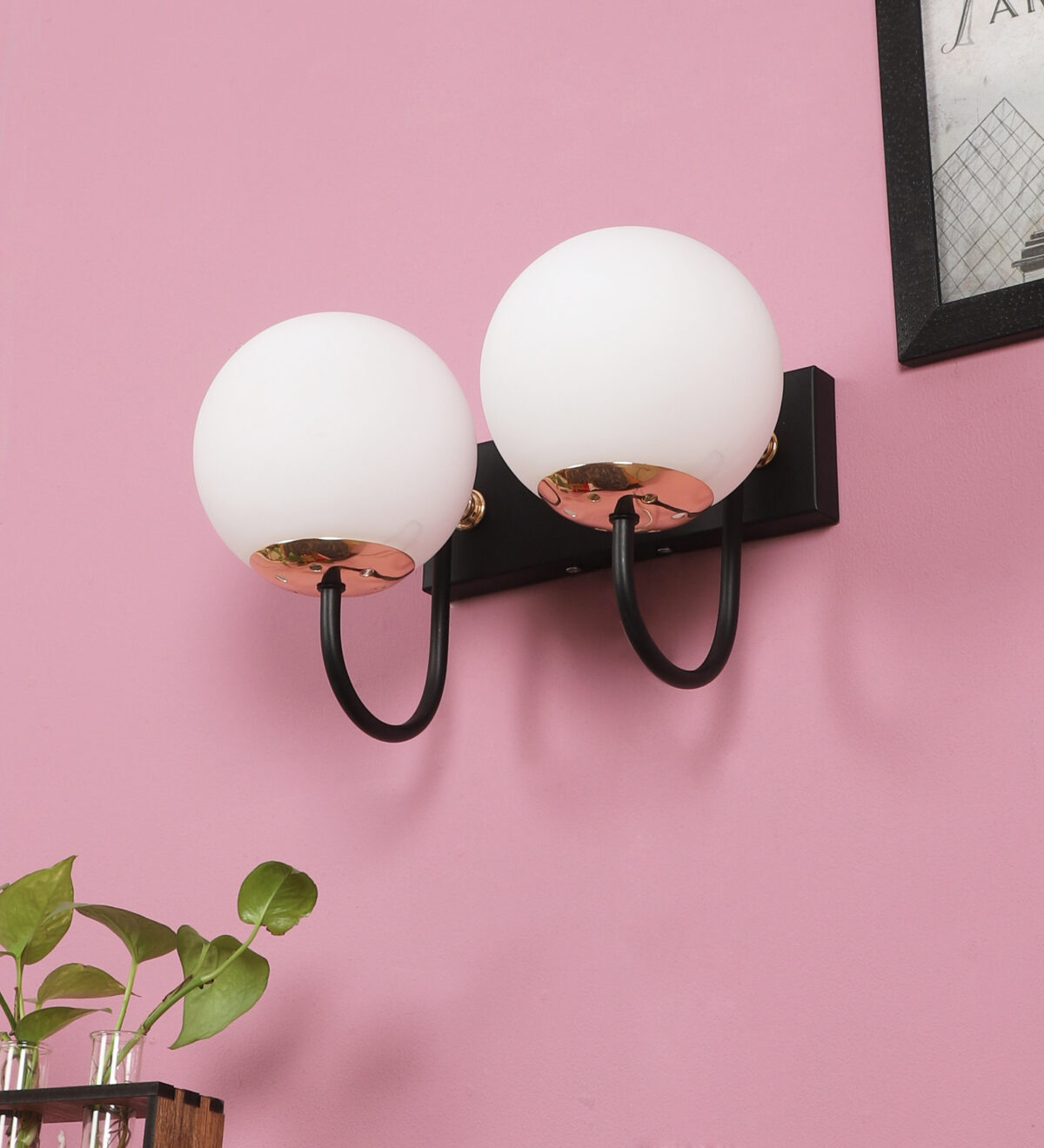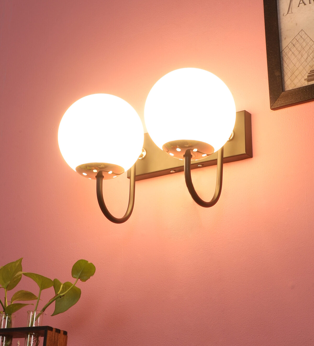 Brown, gold finish double wall light with small round globe (doom) type white glasses . It is maintenance free, easy to remove glass and wash it. Comes with an E27 holder, only the change of lamp is required, which is available locally everywhere. Application includes both residential and commercial premises wherever it matches with your interiors. Can be customized as per requirement. LAMP NOT INCLUDED.