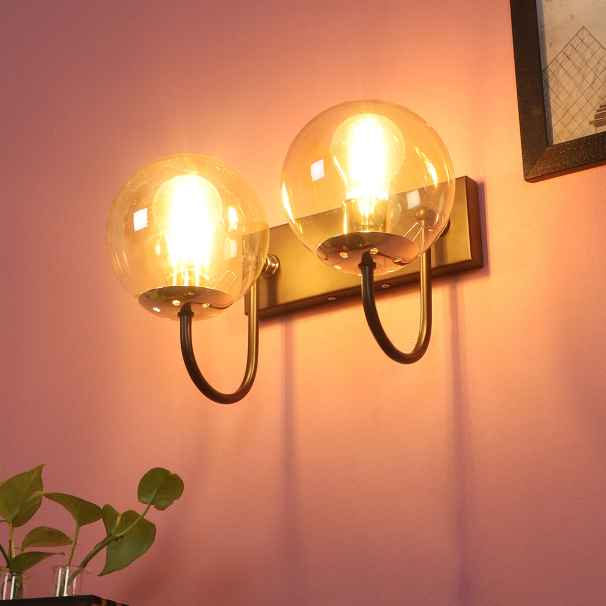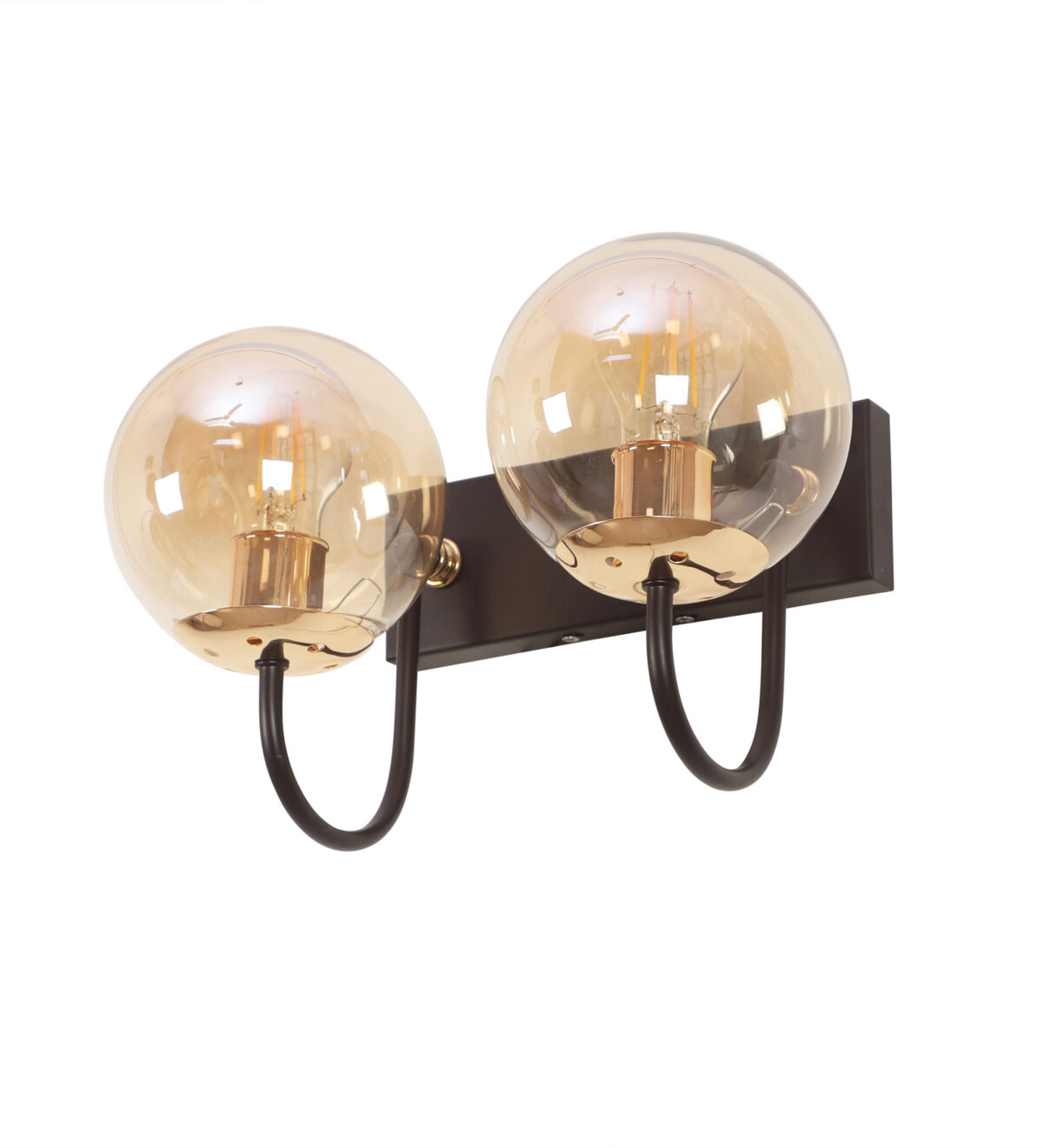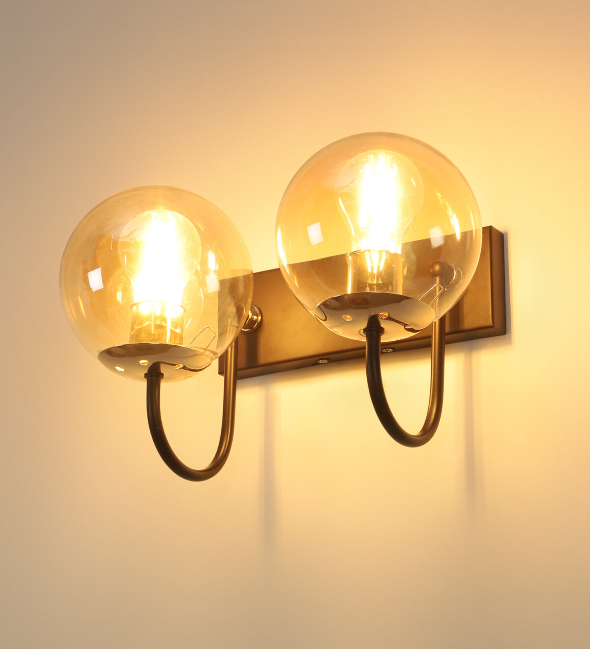 Brown gold finish double wall light with small round globe (doom) type champaign coloured glasses. It is maintenance free, easy to remove glasses and wash them. Comes with an E27 holder, only the change of lamp is required, which is available locally everywhere. Application includes both residential and commercial premises wherever it matches with your interiors. LED filament lamp is recommended to enhance its beauty. Can be customized as per requirement. LAMP NOT INCLUDED.