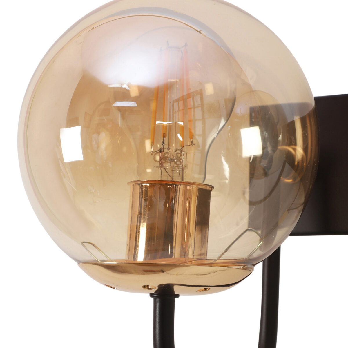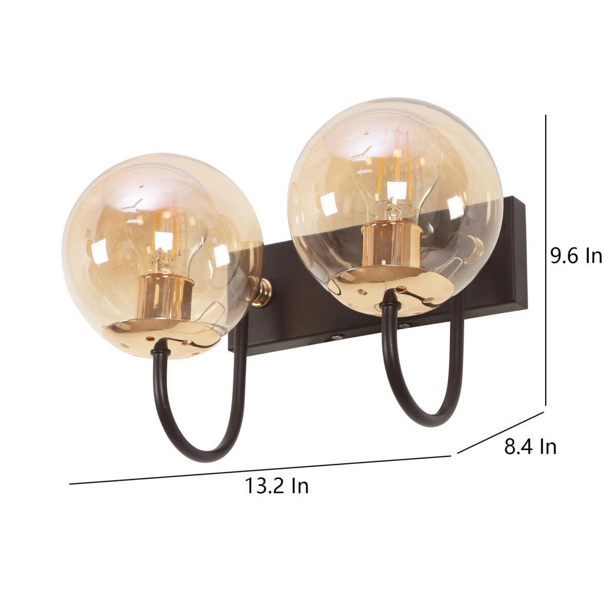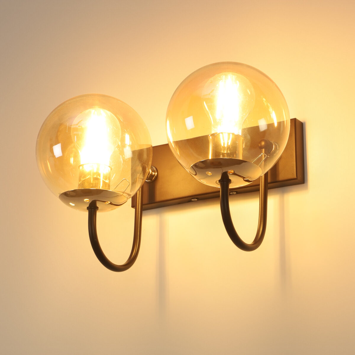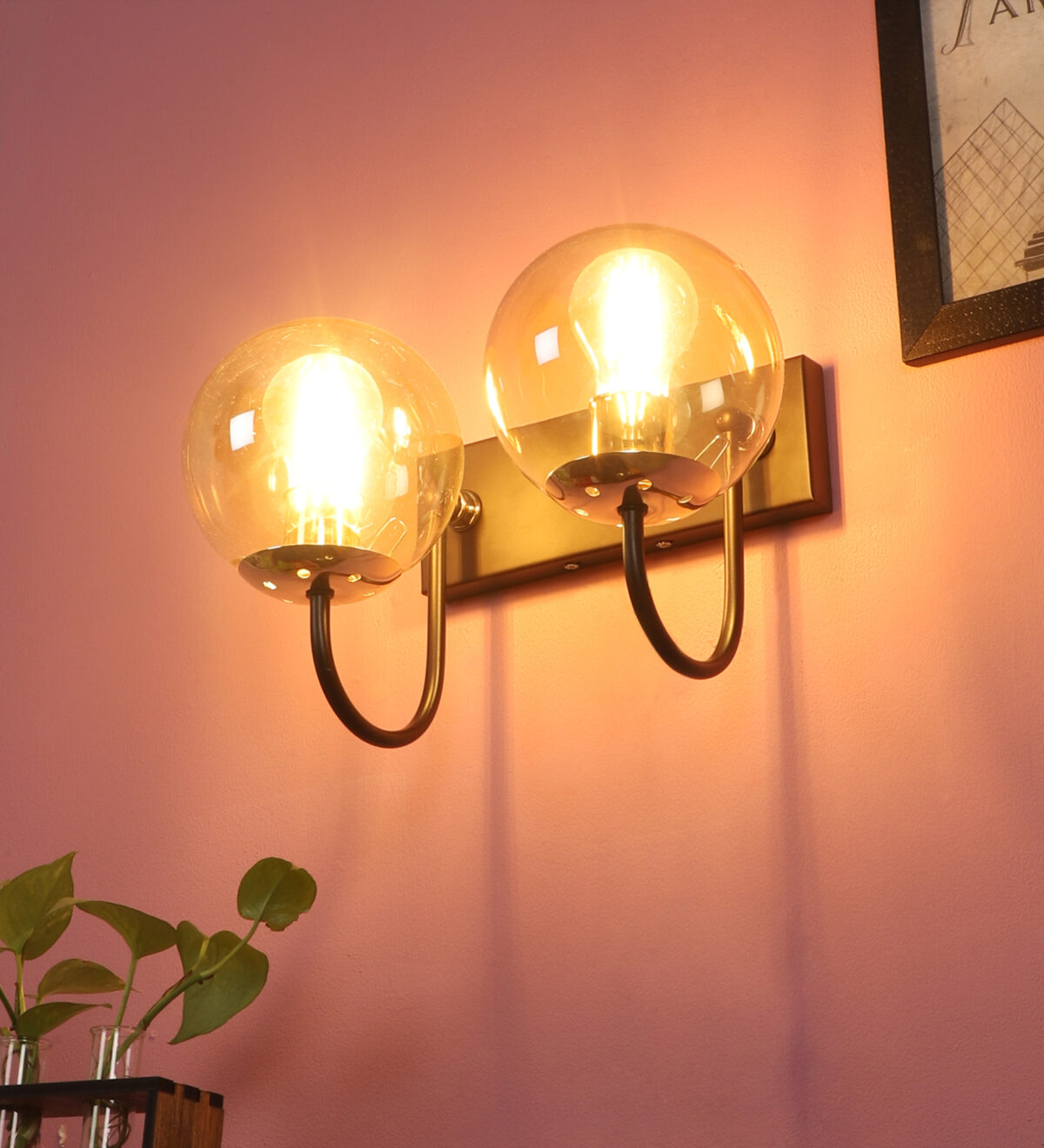 Brown gold finish double wall light with small round globe (doom) type champaign coloured glasses. It is maintenance free, easy to remove glasses and wash them. Comes with an E27 holder, only the change of lamp is required, which is available locally everywhere. Application includes both residential and commercial premises wherever it matches with your interiors. LED filament lamp is recommended to enhance its beauty. Can be customized as per requirement. LAMP NOT INCLUDED.