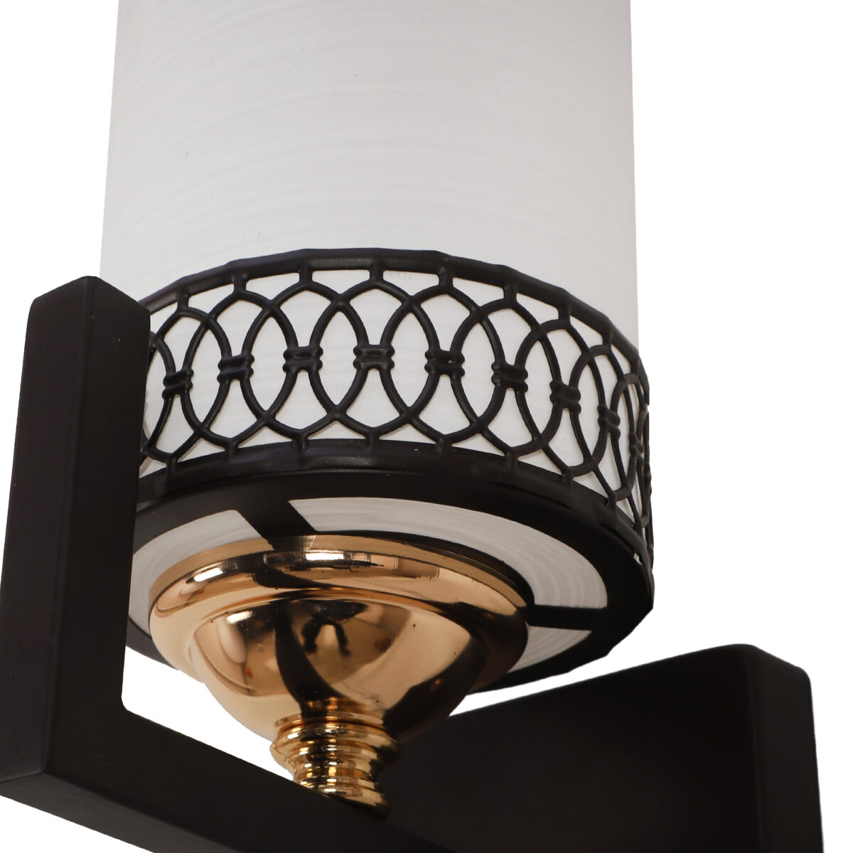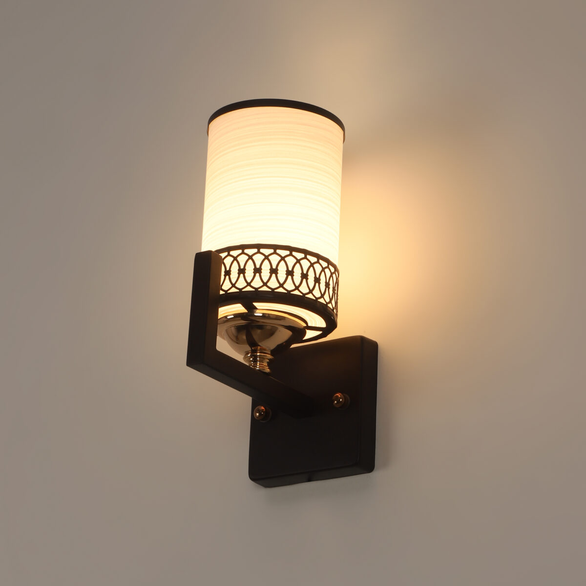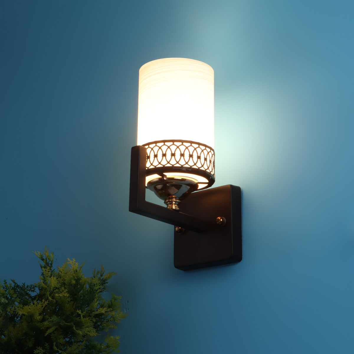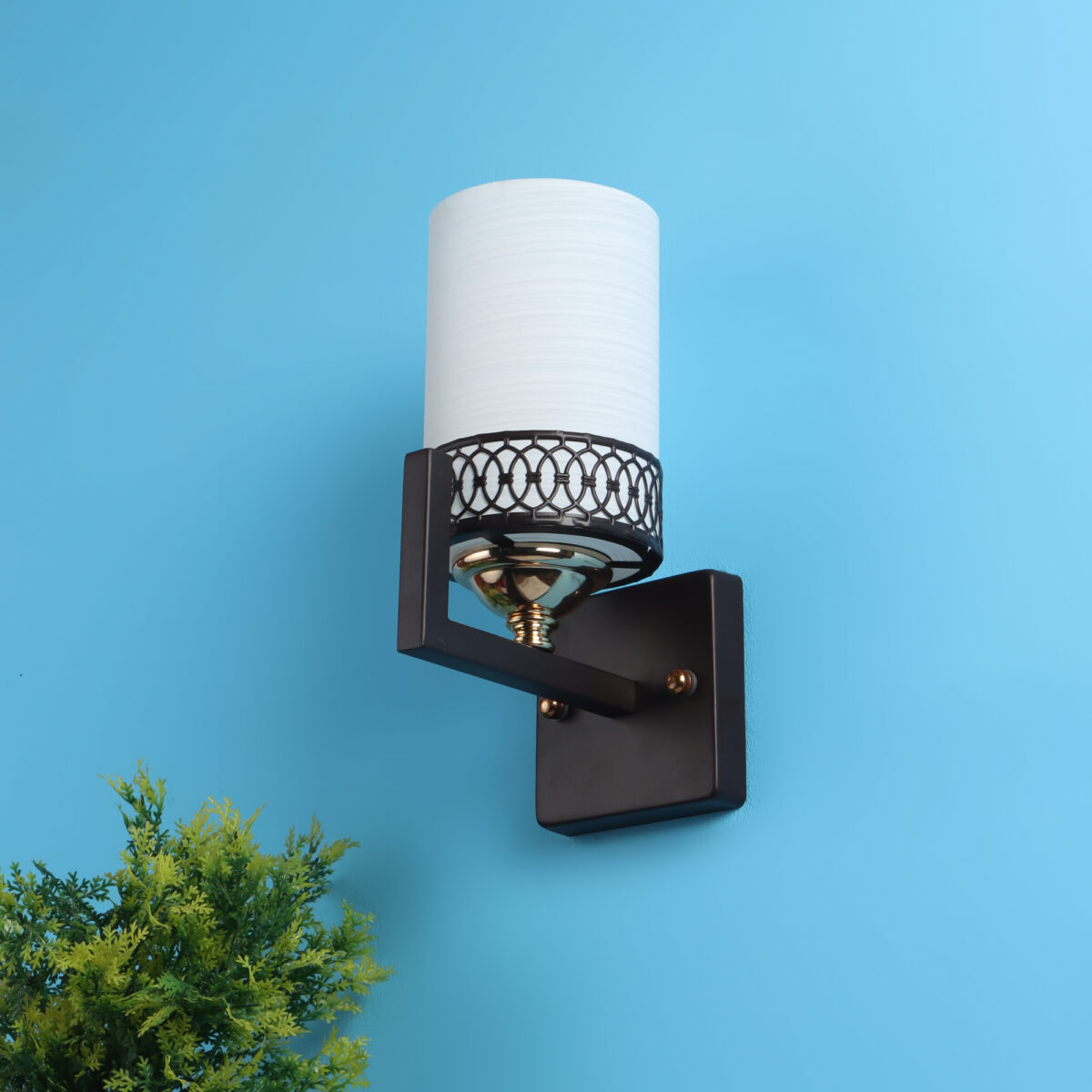 Dark brown finish single wall light having cylinderical white glass having self textured design mounted on a designer frame made of mild steel. It is maintenance free. It is easy to remove glass and wash it. Comes with an E27 holder, only the change of lamp is required, which is available locally everywhere. Application includes both residential and commercial premises wherever it matches with your interiors. Can be customized as per requirement, LAMP NOT INCLUDED.
