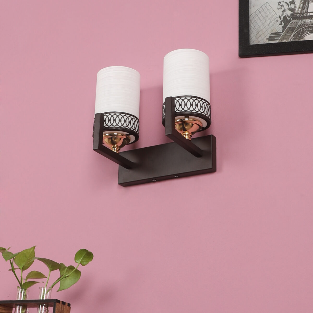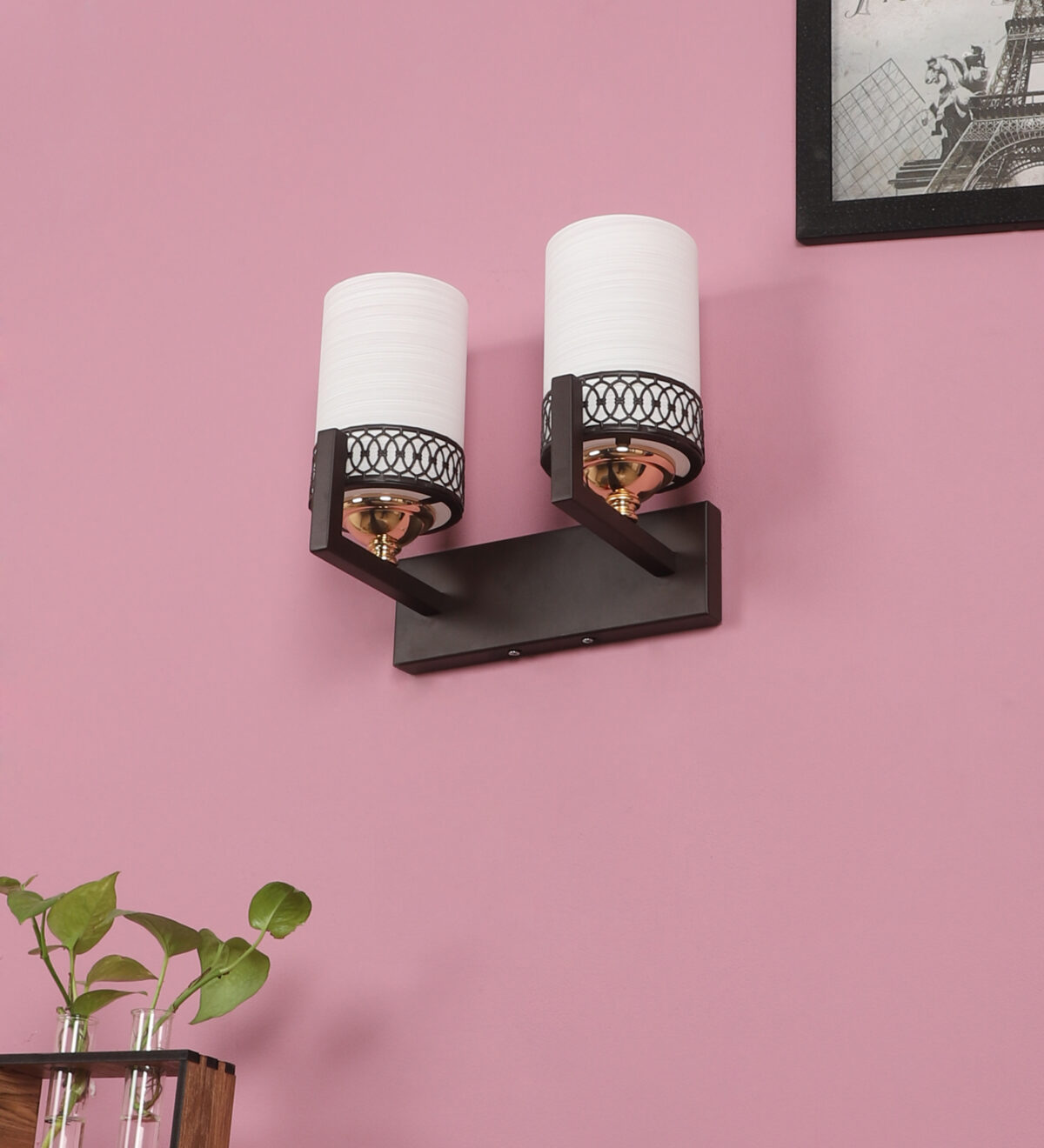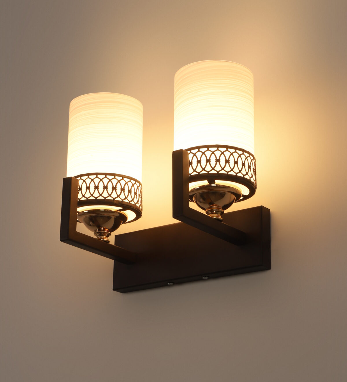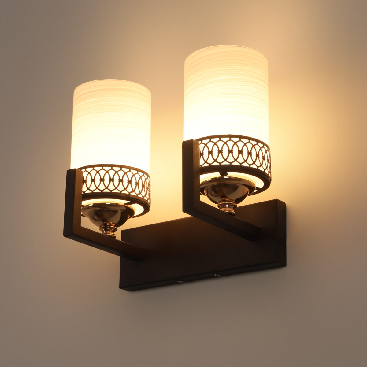 Dark brown finish double wall light having cylinderical white glass having self textured design mounted on a designer frame made of mild steel. It is maintenance free. It is easy to remove glasses and wash them. Comes with an E27 holder, only the change of lamp is required, which is available locally everywhere. Application includes both residential and commercial premises wherever it matches with your interiors. Can be customized as per requirement. LAMP NOT INCLUDED.