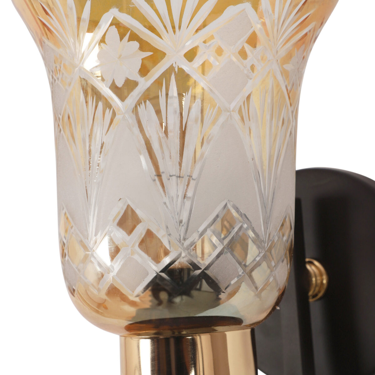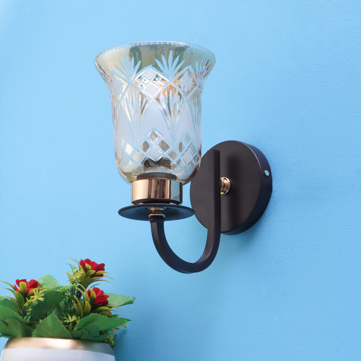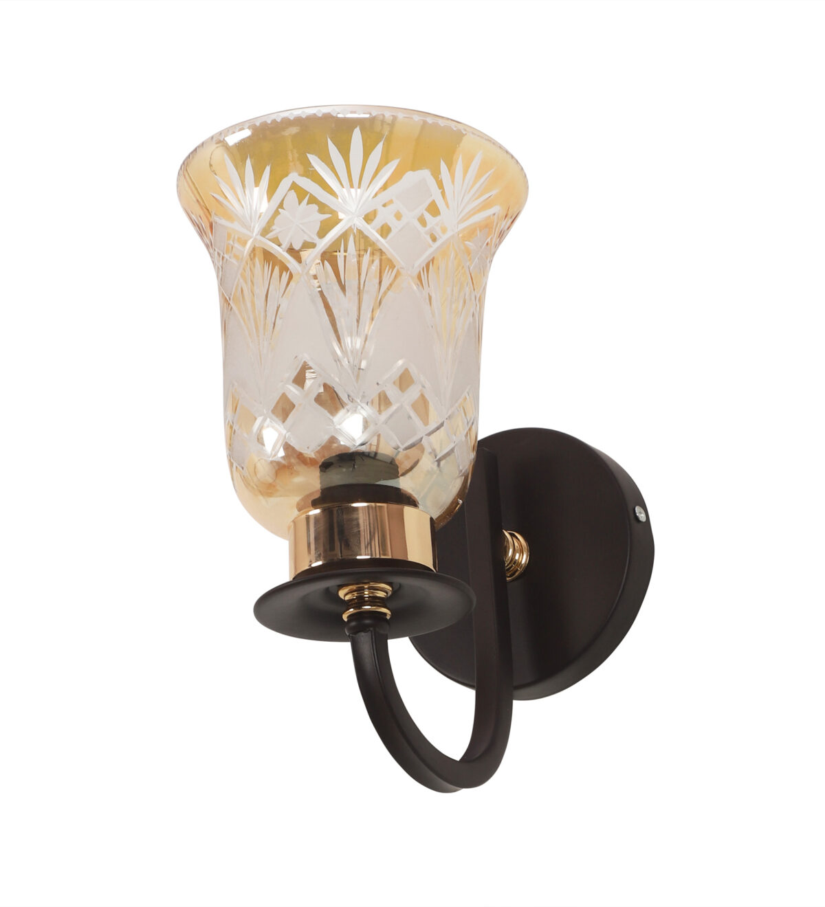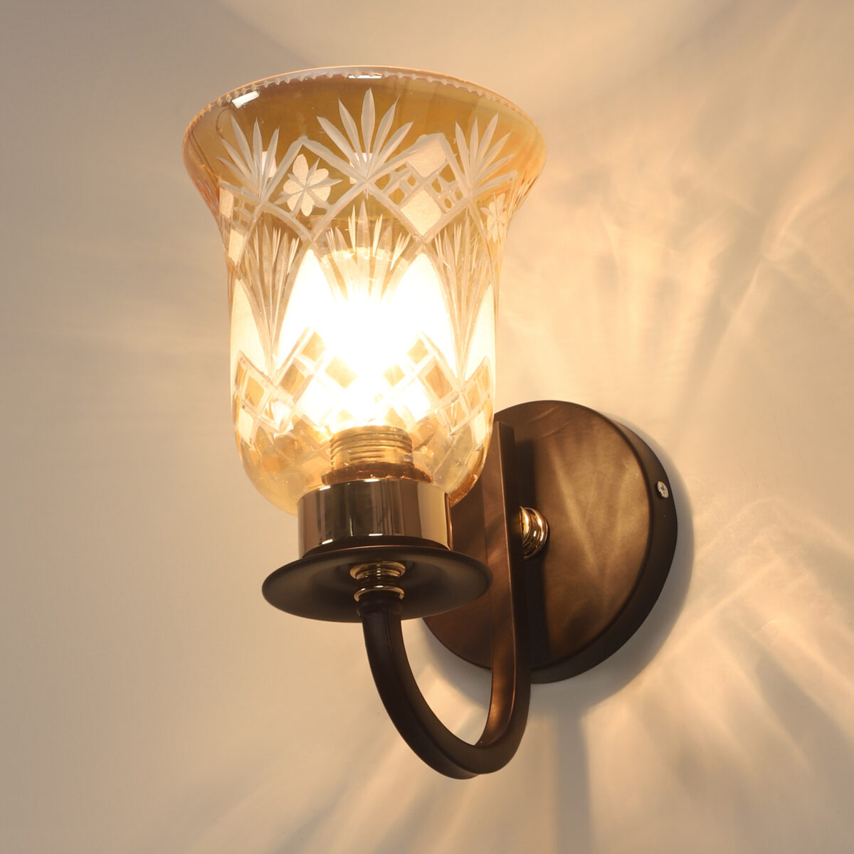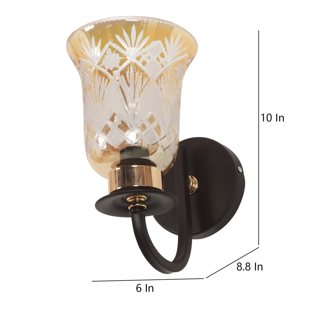 Dark brown finish single wall light having bell shaped glass having engraved design mounted on a designer frame made of mild steel. It is maintenance free. It is easy to remove glass and wash it. Comes with an E27 holder, only the change of lamp is required, which is available locally everywhere. Application includes both residential and commercial premises wherever it matches with your interiors. Can be customized as per requirement, LAMP NOT INCLUDED.