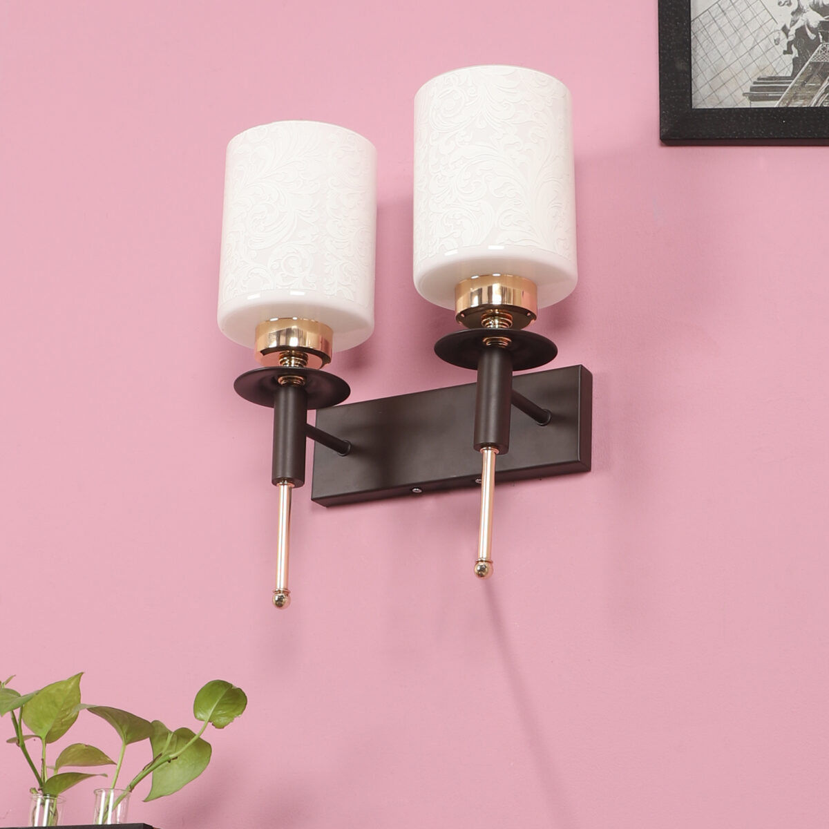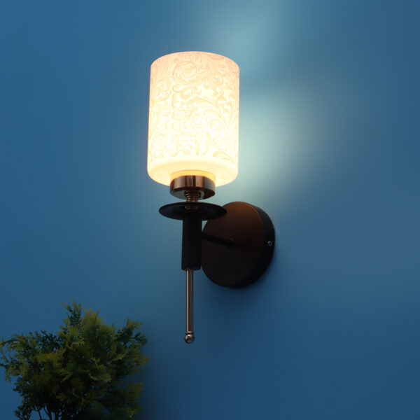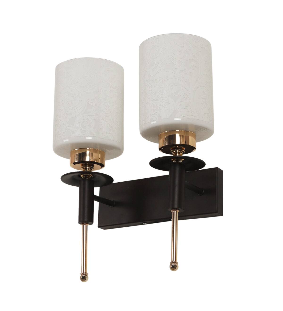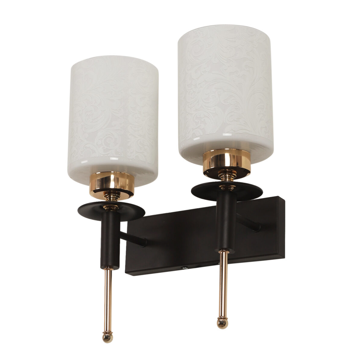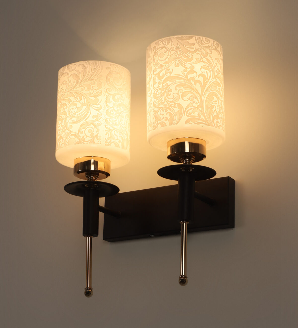 Brown wood finish, double wall light with a white cylinderical printed glass shades. It is maintenance free, comes with an E27 holder, only the change of lamp is required, which is available locally everywhere. Application includes both residential and commercial premises wherever it matches with your interiors. Can be customized as per requirement. LAMPS NOT INCLUDED.